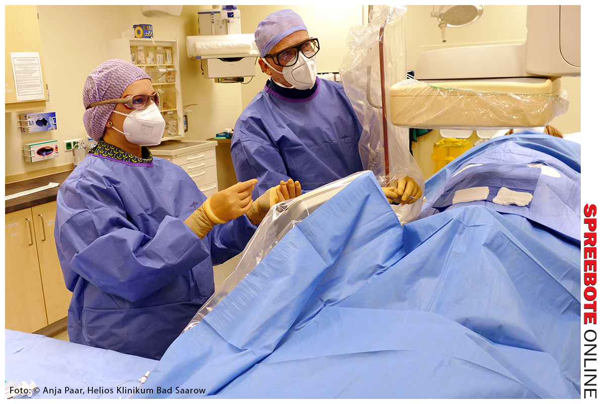 Für Betroffene mit Gelenk- oder Sehnenschmerzen, bei denen konservative und operative Therapien keine zufriedenstellende Wirkung mehr erzielen, gibt es jetzt im Helios Klinikum Bad Saarow die Möglichkeit einer sogenannten transarteriellen, periartikulären Embolisation. Bei dem neuen minimalinvasiven Therapieverfahren werden über einen Katheter durch die Leiste Mikropartikel an die schmerzende Gelenk- oder Sehnenstelle geleitet, wodurch eine umgehende und zumeist länger anhaltende Schmerzlinderung eintritt. Chronische Fehlbelastungen und Entzündungsreize führen dazu, dass sich krankhafte Gefäße auf der Ebene der Kapillaren entwickeln. In Gelenkkapseln und Sehnenscheiden einsprossende, krankhafte Nervenenden übermitteln dann starke Schmerzreize an das Gehirn. Auf Schmerzmedikamente reagieren diese Nerven schlecht oder gar nicht, weshalb medikamentös oft nur bedingt eine Linderung erreicht werden kann.