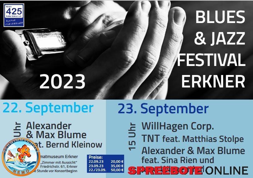 Der Verein 425 Kultur Erkner e.V. lädt ein zum 1. Blues & Jazz Festival Erkner. Nach langer Vorbereitung startet am Freitag, auf dem Gelände des Heimatmuseums Erkner dieses musikalische Großereignis. Seit 12 Jahren hat sich unser Verein dieser Musikrichtung gewidmet und mit dem Musiker Alexander Blume und seinem Sohn Maximilian Partner gefunden, die in jedem Jahr für tolle Stimmung und auch Gänsehautmomente gesorgt haben. Immer wieder kamen tolle Gastmusiker und wir freuen uns sehr, dieses als „Jazz im Rathaus“ gestartete Projekt nun in einer neuen Form zu präsentieren. Am Freitag kommt als Gast ein Musiker, der nicht nur im Osten Bluesgeschichte geschrieben hat, nämlich Bernd Kleinow mit seiner Mundharmonika. Das ist auch schon fast ein Heimspiel für ihn, denn er ist nun schon zum dritten Mal in Erkner. Los geht es um 18 Uhr und der Einlass beginnt um 17 Uhr. Am Samstag präsentieren wir gleich drei Bands. Den Auftakt macht um 15 Uhr die Band Willhagen Corp. aus dem kreativen Südosten von Berlin mit modernem Jazz, der mit eigenem Interpretationen von Songs aus anderen Genres wie Soul, Funk und Dance korrespondiert. Danach folgt TNT aus Woltersdorf, die auch einen Gast mitbringen, nämliche Matthias Stolpe an der Mundharmonika. Sie wecken mit einer explodierenden Mischung aus Rhythm & Blues und Rock`n`Roll der 70er und 80er Jahre alte Erinnerungen und sind Garanten für eine mitreißende Live-Show. Und zum Ende sind dann Alexander und Maximilian Blume mit Frauenpower auf der Bühne: Jazz, Soul, Blues und Songs mit Sina Rien (Bass) und Jana Wiesenthal (Gesang) aus Hamburg. Einlass ist am Samstag ab 14:00 Uhr. Karten gibt es im „Zimmer mit Aussicht“ in der Friedrichstraße 61 in Erkner und natürlich auch noch an der Abendkasse!! Für das leibliche Wohl sorgt wieder in bewährter Form Ralph Albrecht und sein Team von Paris-Rom-Erkner. Besondere Dank gilt dem Heimatverein, der sein Gelände für diese Veranstaltung bereitstellt. Das Team vom Verein 425 Kultur Erkner e.V. erwartet Sie!