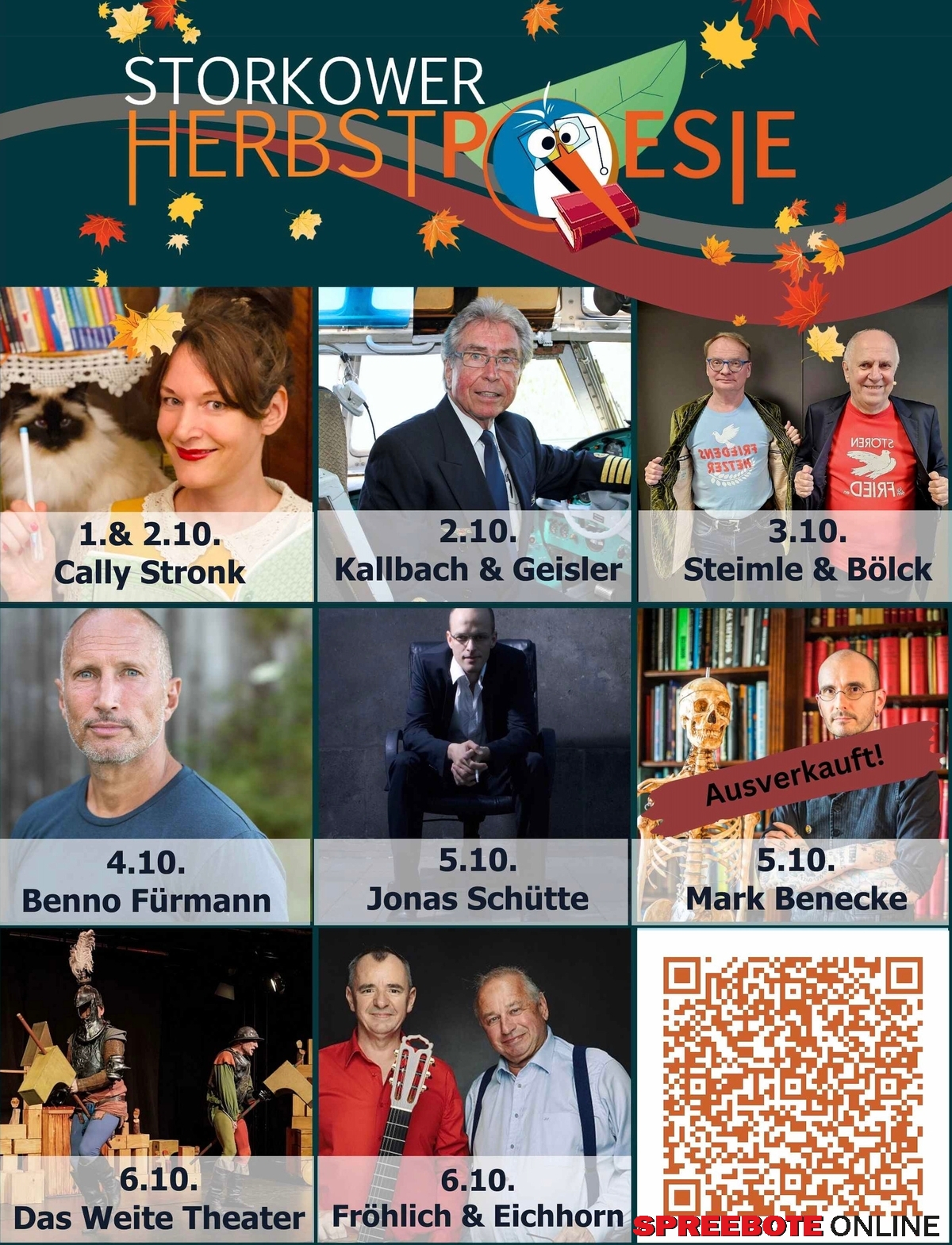 Der Herbst schenkt uns die Zeit, innezuhalten und sich mit einem guten Buch zu Hause zurückzulehnen und in Geschichten abzutauchen. Anfang Oktober verwandelt die 9. Storkower Herbstpoesie unsere Stadt erneut in einen Ort für Literaturbegeisterte und Bücherfreunde. Wenn wir auf die letzten Jahre zurückblicken, sind wir stolz auf die zahlreichen Künstlerinnen und Künstler, die wir zu den Lesungen gewinnen konnten. Die Storkower Herbstpoesie lädt Literaturbegeisterte und Bücherfreunde zum neunten Mal zu einer abwechslungsreichen Woche mit Literatur, Musik und Theater ein. Das beliebte Veranstaltungsformat startet mit Lesungen für Schulklassen, präsentiert von der Kinderbuchautorin Cally Stronk, die ihre Bücher „Die Jagd nach dem magischen Detektivkoffer“ und „Die Straßengang“ vorstellt. Der bekannte deutsche Pilot Heinz-Dieter Kallbach liest zusammen mit Schauspielerin Renate Geisler aus seiner Biografie „Mayday über Saragossa“. Kabarett-Fans kommen mit Uwe Steimle und Lothar Bölck auf ihre Kosten, die die Bühne in der alca arena betreten. Schauspieler Benno Fürmann nimmt das Publikum auf eine bewegende Reise mit, während Jonas Schütte mit seinem Ein-Mann-Theaterstück „Faust als Solo“ beeindruckt.