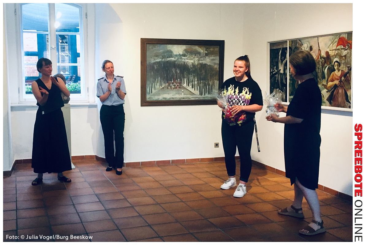 Bevor die Ausstellung endet, bleibt sie am 7. Oktober, länger geöffnet. Ab 18 Uhr haben Besucher zudem die Gelegenheit, die eigenen Eindrücke noch einmal bei einer Kurzführung zu vertiefen. Im Anschluss daran kann, wer möchte, den Kunst-Bestand des benachbarten Museums Utopie und Alltag, dem die ausgestellten Arbeiten entnommen sind, selbst in Augenschein nehmen: Die kostenfreie Sonderführung von Angelika Weißbach, wissenschaftliche Mitarbeiterin des Museums Utopie und Alltag, widmet sich Künstlerinnen in der DDR. „Alle in die Kunst! Turn the time back“ ist ein Kooperationsprojekt des Museums Utopie und Alltag, der Burg Beeskow und der Kreisjugendfeuerwehr Oder-Spree.