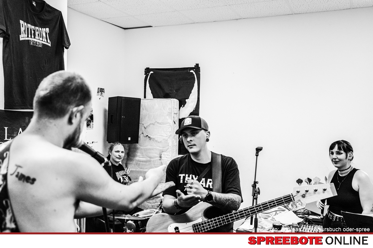 Sonntag, 12 Uhr: Im alten Beeskower Bahnhofsgebäude probt die Band „Backslash“. Gitarrist Willi, Drummer Danilo, Bassist Canzler und Sängerin Luisa. Gespielt wird Punk mit deutschen Texten. Willi, 33 und gebürtiger Beeskower, hat 2008 als Teenager bei der Punkband „Frontalzusammenstoß“ angefangen. Politisch sehen sich die jungen Musiker damals „eher links“. Und das in einer Stadt, die mittlerweile zu den Hochburgen der Rechtsrock-Szene zählt. 2024 geht der Verfassungsschutz von mindestens fünf, in der Kreisstadt beheimateten Rechtsrock-Bands aus.