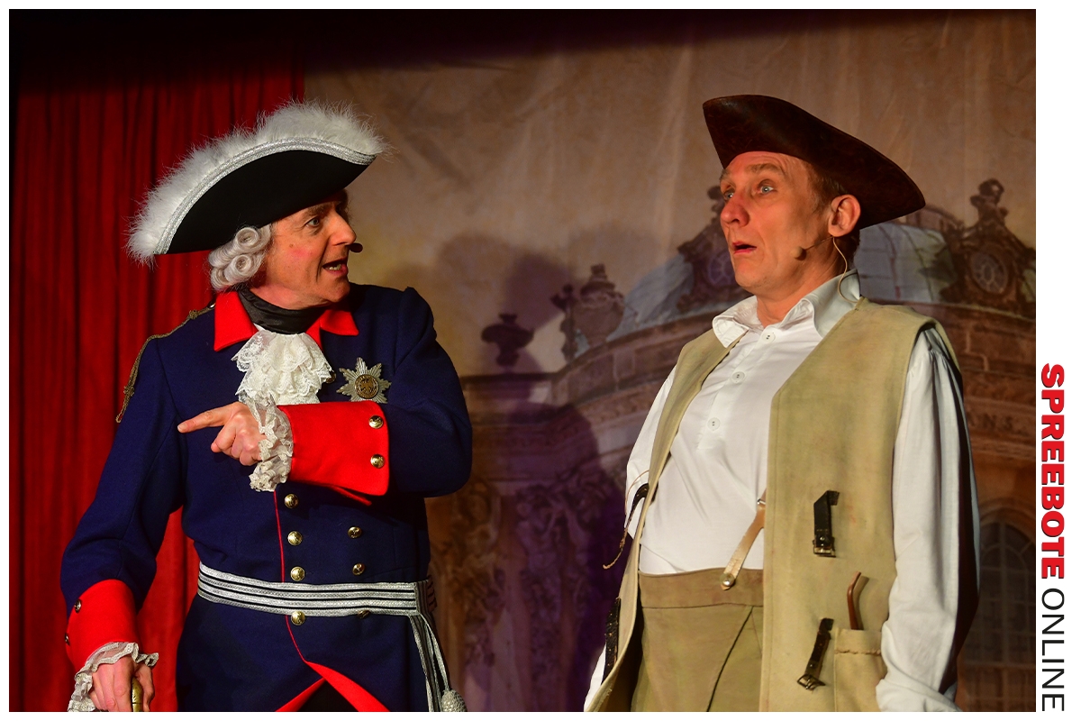 Das Jahr geht dem Ende zu, Weihnachten steht unmittelbar bevor, und am Samstag war die letzte Vorstellung im Musikkeller der Kulturfabrik in Fürstenwalde. Ein krönender Abschluss für dieses ereignisreiche Jahr. Die Uckermärkischen Bühnen mit ihrem reichhaltigen Repertoire waren mit ihrem Gastspiel „Hunde, die pellen, beißen nicht – Friedrich II. – der Große! – und der Müller von Sanssouci“ zu erleben. Wie sehr die Kultur den Gästen am Herzen liegt, zeigte die Besucherzahl an diesen Abend ganz deutlich. Sicher spielt dabei die Zeit und Muße eine wesentliche Rolle, aber auch, dass die professionelle Leistung der Schauspielkunst der Uckermärkischen Bühnen Schwedt von vielen sehr geschätzt wird. Zudem hatten die beiden Protagonisten mit den originalen Darstellern von Antenne Brandenburg, Andreas Flügge und ubs-Intendant André Nicke, dem Abend eine besondere kabarettistische Note verliehen. Aktuelle Geschehnisse, gut verpackt mit etwas Ironie und Zweideutigkeit, zuweilen auch sehr direkt, brachten das Publikum auf Hochtouren. Lachen macht ja bekanntlich glücklich, also das haben die beiden in jedem Falle gut bewerkstelligt. Dazu drehte sich inhaltlich alles um Preußen mit dem alten Fritz an der Spitze der Krönung. Des Brandenburgers liebstes Kind ist die Kartoffel. Das war nicht immer so. Erst musste Friedrich der Große 1756 seinen berühmten Kartoffelbefehl erteilen, um die sturen Preußen zu ihrem Glück zu zwingen. Dabei wäre das beinahe an einem Streit zwischen dem König und seinem Nachbarn, dem Müller von Sanssouci, gescheitert. Denn letzterer beharrte darauf, dass das Brot Grundnahrungsmittel Nummer eins in Preußen sei und bleiben müsse, und drohte seinem König sogar mit dem Gericht. Der Alte Fritz und sein renitenter Nachbar hadern wie ein altes Ehepaar miteinander; da logiert die Schadenfreude, Mutterwitz paart sich mit Weisheit, und große Politik wird kleingelacht und unter die Bratkartoffeln gerührt. Und natürlich – schließlich handelt es sich um Kabarett – gibt es reichliche Bezüge zwischen Historie und Gegenwart. So viel Spaß hat Preußen noch nie gemacht!