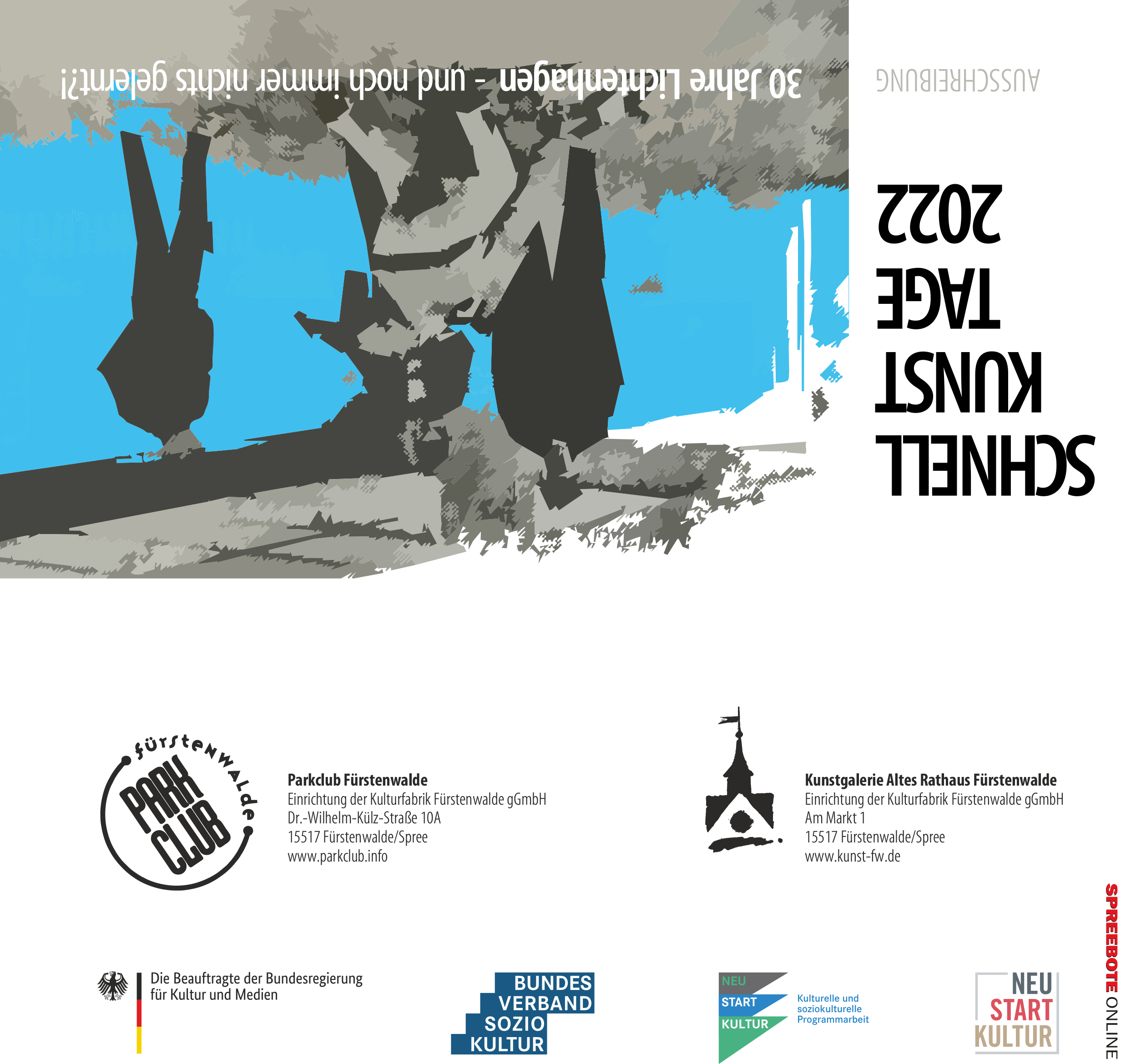 Die Schnell Kunst Tage finden in diesem Jahr wieder in Kooperation zwischen der Kunstgalerie Altes Rathaus und dem Parkclub Fürstenwalde statt. Konzeptionell bleibt alles unverändert: An sieben Tagen wird der Parkclub zur Kunstgalerie. Von Montag bis Freitag stellen fünf Kunstschaffende je einen Tag ihre Werke in einer Einzelausstellung aus. Am Wochenende präsentieren die Beteiligten ausgewählte Arbeiten in einer Gruppenausstellung. Bildende Kunst im Schnelldurchlauf. Thema der diesjährigen „Schnell Kunst Tage“ ist der 30. Jahrestag der Brandanschläge auf ein Asylheim in Rostock Lichtenhagen. Der Anschlag gilt als verheerendster rassistisch und fremdenfeindlich motivierter Gewaltakt nach dem Zweiten Weltkrieg und war selbstredend leider kein Einzelfall. Auch der Parkclub Fürstenwalde erinnert sich schweren Herzens an die Nachwendejahre, als rassistische Übergriffe leider zum Alltag gehörten. Die aktuelle politische Situation erfordert aus unserer Sicht auch eine aktuelle Erinnerung und auch Aufklärung. Wir sind gespannt auf die Umsetzung des Themas aus der Sicht der Kunstschaffenden.