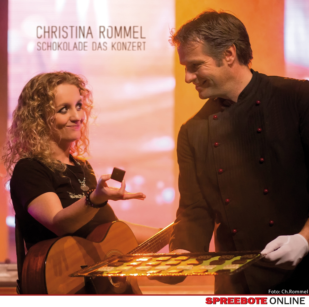 New York. Paris. Storkow. Christina Rommel ist eine erfolgreiche Live-Musikerin in der deutschen Rock-Szene und berühmt für ihre legendären Schokoladenkonzerte. Mit ihrem international einzigartigen Show-Konzept gastiert die Sängerin – mit Chocolatier und Band – am 11.November um 20 Uhr auf der Burg Storkow. Die Bühne wird zur großen Schokoladenküche, in der die Musiker und der Chocolatier gemeinsam ihre Handwerkskunst auf höchstem Niveau zelebrieren. Zu den Klängen bekannter Rommel-Songs beginnt eine fesselnde, musikalische Reise durch die Welt der Schokolade; garniert mit genussvollen Schoko-Geschichten und witzigen Dialogen. Verführerische Aromen strömen sanft durch die Luft und harmonieren mit der atmosphärischen Schoko-Kulisse. Chocolatier und Schoko-Mädchen/Jungen servieren diverse Kostproben ihres Könnens und natürlich zeigen Christina Rommel und Band, warum sie zu den besten Live-Musikern des Landes gehören. Kein normales Konzert, sondern purer Hochgenuss!