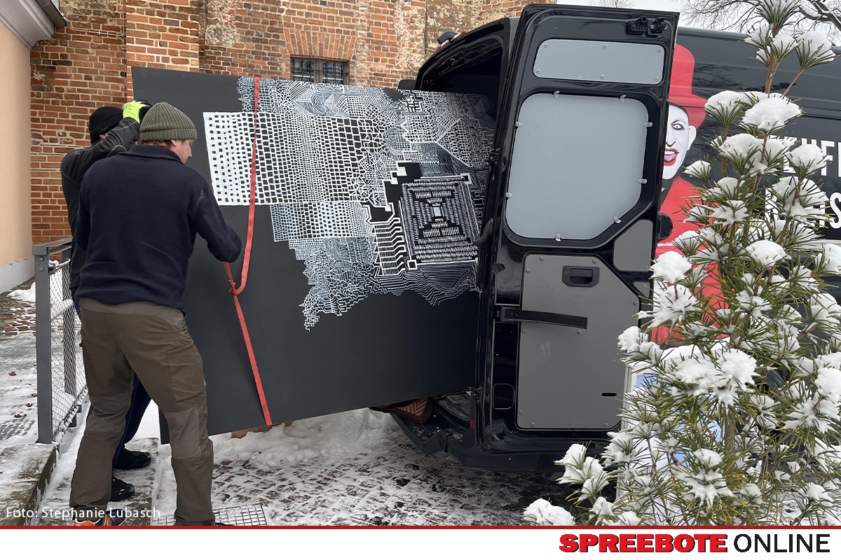 Eine Premiere gab es am Donnerstag im museum oder-spree auf der Burg Beeskow: Zum ersten Mal wurde ein Wandbild aus einer zu Ende gegangenen Jahresausstellung nicht nur abgebaut und von den jeweiligen Künstlern abgeholt, sondern wechselte stattdessen den Ausstellungsort. Statt in Beeskow wird „Bau auf, bau auf!“, knapp vier Meter breit und drei Meter hoch, künftig in Frankfurt (Oder), der Heimat des Künstlers Michael Voll, zu sehen sein. Möglich gemacht hatte den Umzug eine Initiative von Stefan Welker, Technischer Leiter im Frankfurter Kleist Forum, der sich seit geraumer Zeit bemüht, Werke regionaler Künstler ins Haus zu holen. Arbeiten des erst 16-jährigen Frankfurters Ilusch und des Graffiti- und Streetart-Künstlers P. Banause haben bereits ihren Weg an die Wände des Kleist Forums gefunden. Wo und ab wann Michael Volls Bild, eine weiße Zeichnung auf mit Tafelfarbe geschwärzten Spanplatten aus dem Beeskower Spanplattenwerk Sonae Arauco, zum Hängen kommt, muss allerdings noch geklärt werden: Neben der Größe ist dabei vor allem das Gewicht der Platten eine Herausforderung. Der Künstler selbst zeigte sich erfreut über den neuen Bestimmungsort seiner Arbeit, die er im Januar 2023 exklusiv für die Beeskower Ausstellung „abreißen und aufbauen“ angefertigt hatte. Auf der nun frei gewordenen Fläche im Museum Oder-Spree ist mit Rostyslav Voronko nun bereits der nächste Maler am Werk: Was dem Beeskower mit ukrainischen Wurzeln zum Thema „kommen und gehen“ eingefallen ist, wird bei der Ausstellungseröffnung am Samstag, 27. Januar, um 17 Uhr gelüftet.