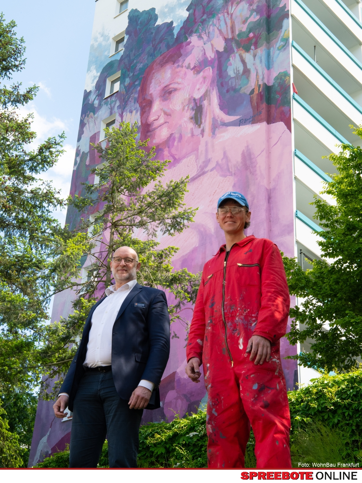 Nun bekommt Frank Gesellschaft – und zwar in luftiger Höhe: An der 32 Meter hohen Stirnseite der Dr.-Salvador-Allende-Höhe 10 ist in den vergangenen zwei Wochen das Porträt von Franka entstanden. Auch sie ist ein Sinnbild der Doppelstadt – modern, offen, zugewandt. In Auftrag gegeben wurde das Kunstwerk von der WohnBau Frankfurt, die mit dem Projekt nicht nur Farbe in den Alltag bringt, sondern auch ein Zeichen für Kreativität und Zusammenhalt setzt.