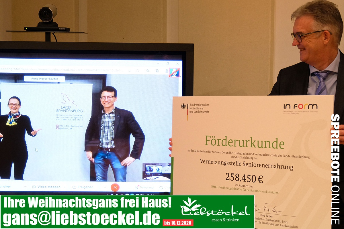 | Im Jahr 2050 wird jeder Dritte in Deutschland über 60 Jahre alt sein. Daher hat die Bundesministerin für Ernährung und Landwirtschaft, Julia Klöckner, eine Ernährungsinitiative für Seniorinnen und Senioren gestartet. Für eine gesunde und nachhaltige Ernährung im Alter. Denn: 84 Prozent der 70 bis 80-jährigen Männer und 74 Prozent der Frauen dieser Altersgruppe sind übergewichtig oder leiden sogar unter Adipositas. Kernelement der Initiative ist die Einrichtung von Vernetzungsstellen für Seniorenernährung in allen Bundesländern. In Brandenburg fördert das Bundesernährungsministerium dies mit der Zuwendung. Die Förderurkunde wurde durch den Parlamentarischen Staatssekretär bei der Bundesministerin, Uwe Feiler, und die Staatssekretärin im Ministerium für Soziales, Gesundheit, Integration und Verbraucherschutz des Landes Brandenburg, Anna Heyer-Stuffer, im Rahmen einer Videokonferenz überreicht.