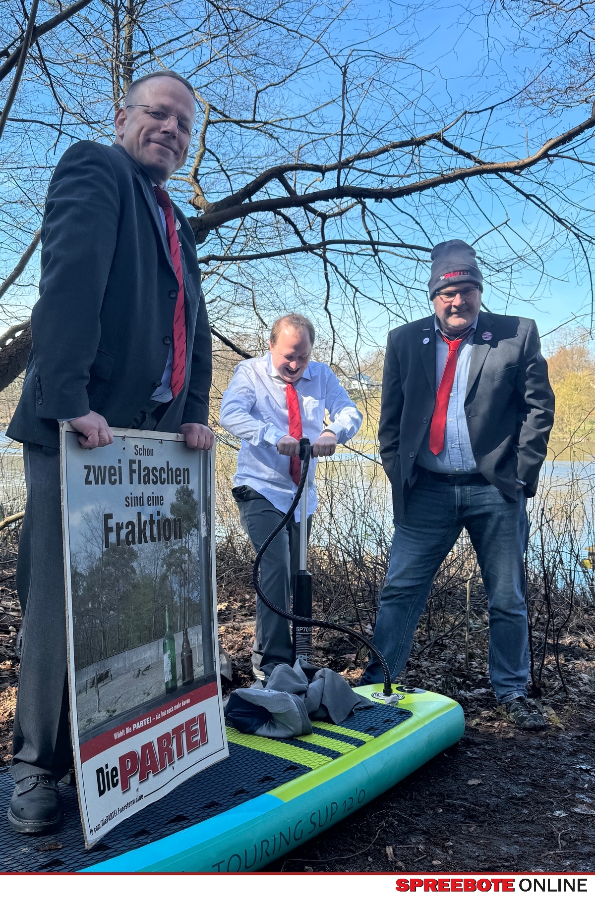 Dabei trafen Spaziergänger, Hunde und auch sitzende Rentner auf die Truppe in hellblauen Hemden, roten Krawatten und den berühmt-billigen grauen Sakkos. Die Unbeteiligten bestaunten die Handlungen der Kandidaten und ihr wildes Treiben. Besonders spannend war dabei die große Frage: Wie viele Personen in grauen Anzügen benötigt es, um ein SUP-Board aufzupumpen? Die PARTEI hat bereits die Antwort: Planen Sie mindestens 10-Minuten-Schichten bei 4 Anzugträgern ein. Anschließend gab es dann für jeden eine Tour auf dem SUP-Board über den Trebuser See, bei schönster Mittagssonne. Leider wurden alle Passanten enttäuscht, denn ein unfreiwilliges Bad im noch kalten Wasser blieb bei allen Kandidaten aus.