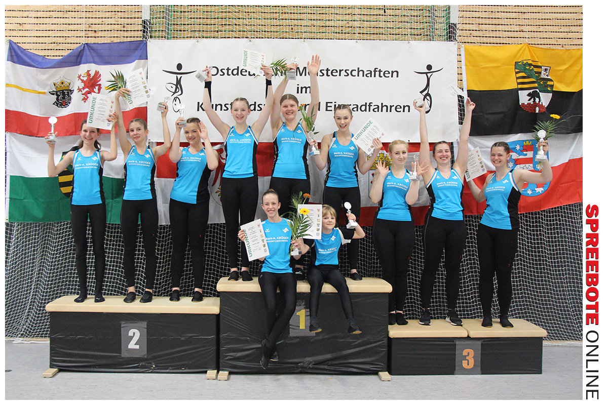 Im Zweier Kunstradsport der Juniorinnen gingen 5 Paare an den Start. Tessa Schönherr und Laura Morgen von der SG Rauen zeigten wieder ein sehr gutes Programm der Jury vor. Mit ausgefahre-nen 70,62 Punkte konnten sich die beiden über den Goldpokal und damit den Ostdeutschen-Meistertitel freuen. Ihre Vereinskameradinnen Josephie Krause und Helene Giebler mussten sich leider von der Konkurrenz aus Thüringen geschlagen geben und erreichten den Bronzepokal. Mit 75 Punkten Vorsprung holte sich der Vierer Einrad mit Tessa Schönherr, Josephie Krause, Anne Thiel und Anish Tettenborn von der SG Rauen den Meistertitel. Die Vier zeigten wieder eine sehr schöne synchrone Performance auf den Einrädern und blieben ganz knapp unter ihrer persönlichen Bestmarke. Die SG Rauen holte mit ihren sehr guten Leisten auf den Rädern die meisten Pokale bei dieser Meisterschaft – 3 x Gold, 2 x Silber und 3 x Bronze. Am kommenden Wochenende steht nun noch die 3. Runde Landespokal Berlin/Brandenburg auf dem Terminplan, bevor es in die wohlverdiente Sommerpause geht.