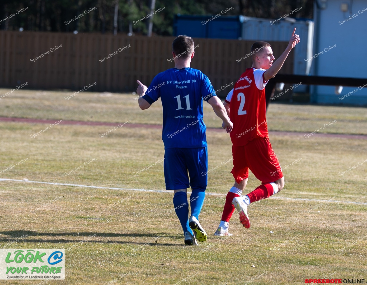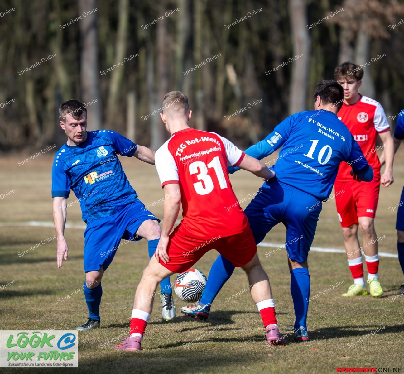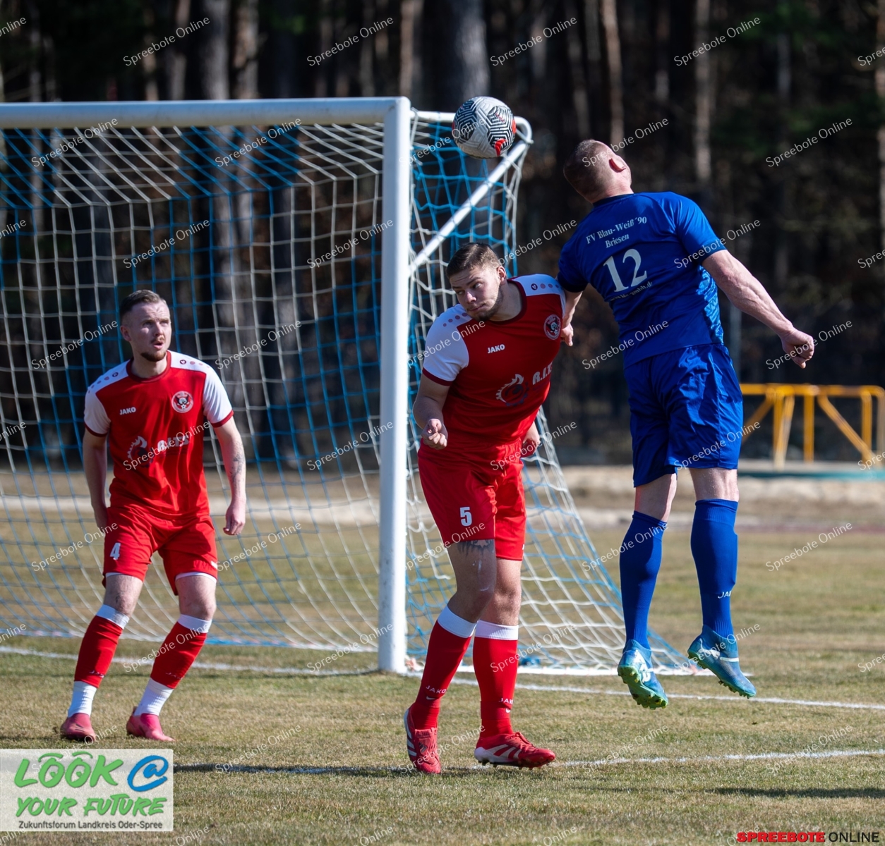 Fußballkaiserwetter im Sigmund-Balzer-Stadion in Briesen zur Partie zwischen dem Gastgeber FV Blau-Weiß Briesen II und der TSG Rot-Weiß Fredersdorf/Vogelsdorf in der Kreisliga Nord. Der Rückrundenstart ist damit erfolgt. Beide Teams waren angetreten, in jedem Fall die drei Punkte mitzunehmen. Das Spiel nahm sofort an Intensität zu. Briesen stürmt über den Platz, überwand die Abwehr, passt in die Mitte und der Keeper der Gäste, Pries, fischte ab. In der 7. Minute wird es etwas gefährlich für Briesen. Die Gäste schnell und kraftvoll, schicken den Fredersdorfer Flügelspieler Lihsa über links in die Spur, wird aber im Doppelpack von Augustin und Anke gestoppt, kann aber einen Eckball verbuchen. Der Ball kommt zu lang und findet keinen Abnehmer. Briesen nimmt die Gelegenheit wahr und setzt zum nächsten klassischen Angriff an. Fredersdorf nimmt den Ball ab und spielt dann kurze Pässe Richtung Gästetor, allerdings nur mit teilweisem Erfolg, denn Briesen erhöht sofort den Druck auf einzelne Spieler. Anstatt dass Fredersdorf gleich losgeht, verzetteln sie sich oftmals, Frust der eigenen Kameraden inbegriffen, einfach mal Fußball spielen war dann die Devise. Dann folgt in der 17. Minute ein scharf geschossener Fredersdorfer Überflieger, Briesen lenkt zur Ecke, aber kein Erfolg in Sicht. Briesen macht die Reihen enger und geht nun vermehrt in die Zweikämpfe und kommt zu guten Chancen, die den Keeper und die Abwehr unter Zugzwang stellen. Briesen hatte schon fast das erste Tor auf dem Fuß mit Margraff und Krüger also Ausbaufähig. Es kommt die 21. Minute und Fredersdorf geht schnell nach vorn, überrollt gewagt die Briesener Abwehr. Tabler stürmt auf den Briesener Keeper zu, manövriert ihn aus, der Linienrichter hält in dem Moment die Fahne hoch, Abseits. Das Spiel wird ruhiger und verflacht. Was wäre wenn stellt sich hier nicht. Es kommt auf Briesener Seite zu einem Eigentor in der 57. Minute durch Vrazilow. Und noch benommen macht Fredersdorf das 0:2 in der 64. Minute. Die Partie endet schlussendlich für Briesen mit einer Schlappe und mit einem Sieg für die Gäste.