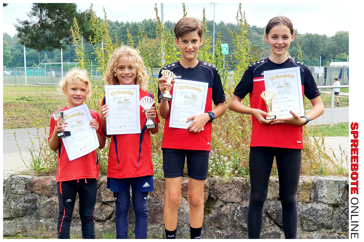 | Die traditionellen Serien-Crossläufe Märkisch Oderland, die sonst im Februar/März stattfinden, wurden in diesem Jahr auf August & September verschoben. An den 4 Läufen, bei denen man von Woche zu Woche je nach Platzierung Punkte sammelt, haben jedes Mal 6-8 Läuferinnen und Läufer aus Fürstenwalde teilgenommen. Henriette Kröhnert (AK 12) und Till Kunze (AK 11) waren dabei besonders erfolgreich, denn sie holten bei allen 4 Läufen den 1. Platz. Für beide gab es dafür natürlich einen goldenen Pokal. Hanna Eisenschmidt (AK 13) landete in der Wertung der Mädchen U14 hinter ihrer Trainingskollegin Henriette auf dem 2. Platz und machte somit den Doppelsieg für Gaselan perfekt. Die Geschwister Richard Stolte (AK 8) und Aurelia Stolte (AK 5) sicherten sich in ihrer jeweiligen Wertung den 2. Platz und somit den Silberpokal. Die zu laufenden Distanzen sind je nach Altersklasse unterschiedlich. So musste Aurelia Strecken zwischen 0,5 und 1 km absolvieren und ihr Bruder Richard Strecken zwischen 1 und 1,5 km. Till lief bis zu 2 km und die beiden Mädchen Hanna und Henriette absolvierten Strecken von 1,5 bis 3 km.