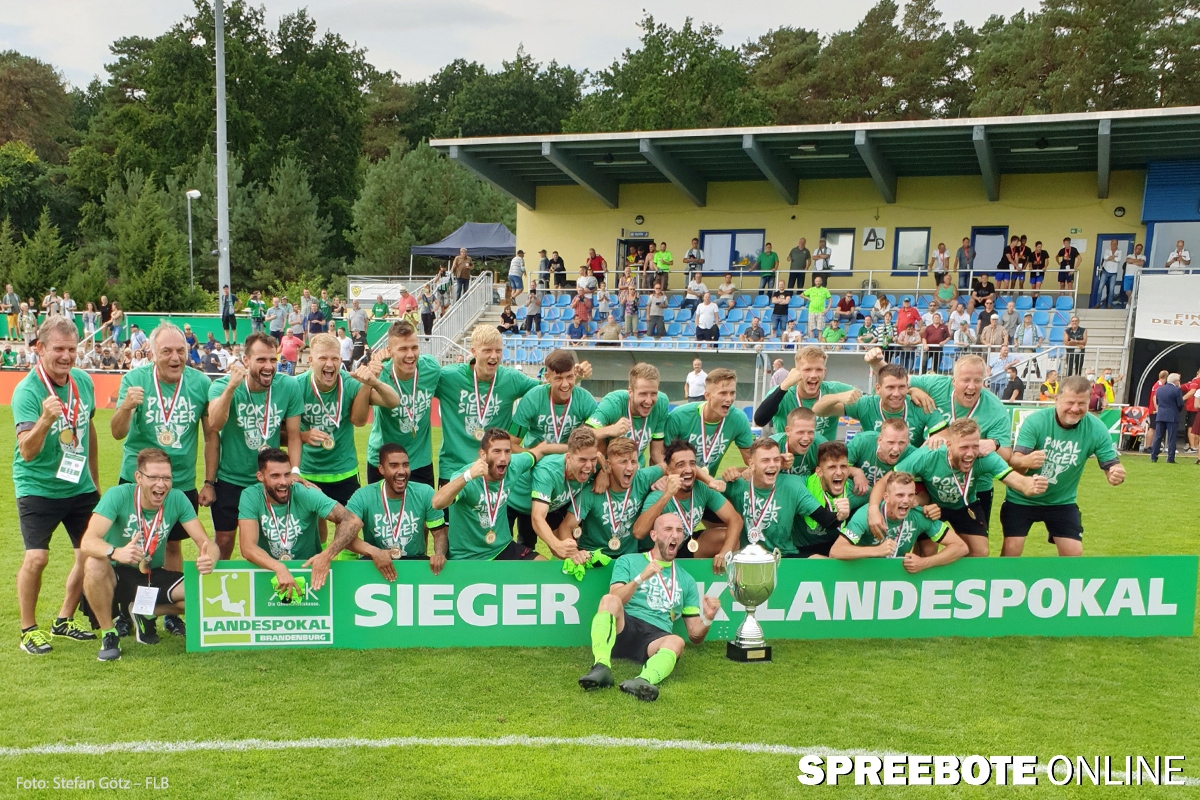 | Zum ersten Mal erkämpfte sich der FSV Union Fürstenwalde den Fußball-Landespokal. Ein historischer Erfolg in der Vereinsgeschichte und für Fürstenwalde. Am Samstag standen sich auf neutralem Boden, im Luckenwalder Werner-Seelenbinder-Stadion, die Regionalligakontrahenten FSV Union Fürstenwalde und SV Babelsberg 03 im Landespokalfinale gegenüber. Die Ausgangsposition war 50:50, und auf beiden Seiten waren einige neue Gesichter in den Teams, denn das Pokalfinale der Saison 2019/20 fand Corona-bedingt am Anfang der neuen Saison statt. Somit waren die Ausgangspositionen doch andere als im Mai 2020 zum ursprünglichen Termin. Damit hatten aber beide Mannschaften zu tun. Es war kein Geisterspiel, sondern es durften auf beiden Seiten jeweils 350 Fans am Spielort dabei sein (insgesamt 1.000 Personen, Mannschaftsteilnehmer, Presse, Ordner usw.). Punkt 14.45 Uhr pfiff Schiri Marcel Riemer das Spiel an – es wurde am Finaltag der Amateure in Konferenz im ARD-Fernsehen übertragen – und die Babelsberger stürmten gleich los. Die Unioner waren aber auf der Hut und stellten sich dem entgegen. Fast zwei Standardsituationen (13. Min. und 20. Min.) brachten dann den Unionern die frühzeitige 2:0-Führung. In der 13. Minute brachte Michel die Flanke von links und Lukas Stagge köpfte den Ball ins Netz, und in der 20. Minute schlug Anton Kanter den Eckball von rechts hoch vors Tor und erneut war Lukas Stagge mit dem Kopf erfolgreich und erzielte das zweite Tor für die Unioner. Der Fürstenwalder Anhang jubelte freudig, auf der anderen Seite wurde es merklich ruhiger.