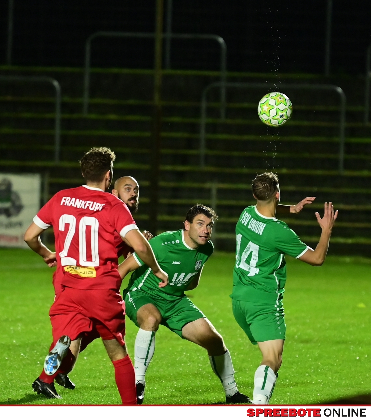Wenige Minuten später (24. Und 25.Min.) hatten die Unioner durch ihren Oldie Christian Mlynarczyk gar die große Chance zum schnellen Ausgleichstreffer. Erst flankte Yannek Sosnowski präzise den Ball vors Tor und danach brachte Hysen Muca das Leder hoch vors Tor, doch beide Male ging dann der Kopfball von „Mietze“ knapp neben den Kasten. Ein schmeichelhafter Strafstoßpfiff (der Union Spieler traf erst den Ball und dann Georgi fast auf der Torauslinie und somit Ecke) führte in der 43. Minute zum glücklichen Elfmeter, den Lukas Sauer sicher zum 2:0 für Frankfurt verwandelte. Druckvoller gingen die Unioner dann die zweite Halbzeit an und übernahmen nun immer mehr das Spielgeschehen.