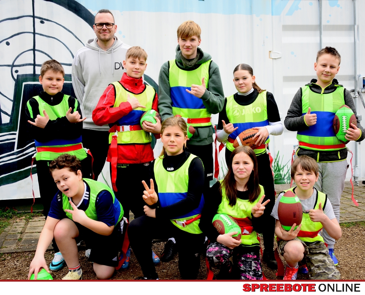 Eine besondere und nicht alltägliche Trainingseinheit im Flag Football erlebten die Kinder der „Mammoths“ am vergangenen Samstag bei den Berliner Bullets. Die jungen Flag Football Kids der SG Gaselan der U13 wurden eingeladen, an einem Trainingstag im „Daycamp“ dabei zu sein. Die Bullets hatten in der Szene gehört, dass sich ein Flag Football Team in Fürstenwalde gebildet hatte, nahmen sofort Kontakt auf und luden gleichzeitig zum Trainingstag nach Berlin ein. Das Trainerteam Dennis Winter und Marcus Müller war begeistert über die Offerte des Vereins und nahm die Einladung herzlich an. Die noch kleine Sektion hat immerhin schon über 30 Kinder in verschiedenen Altersklassen, die unbedingt diesen Sport ausüben möchten. Da kommt das Angebot der Berliner Bullets gerade recht. Eltern, Verein und Kinder sind ganz aufgeregt, was sie nun erwartet. Spannung pur, zum ersten Mal ist das für die Fürstenwalder Kids ein Zusammentreffen mit anderen Flag Footballern. Verstehen tut man sich sofort. Der Flag Football Beauftragte der Berliner Bullets, Stefan, ist schon seit 12 Jahren dabei und weiß, worum es geht. Dabei stellt sich heraus, dass es keine, wie im Fußball üblich, Tabelle im klassischen Sinne gibt. Erschließen tut sich das aus dem Fakt, dass ein Spiel nur maximal 2 x 20 Minuten geht und dafür in weiten Entfernungen zu fahren, wäre nicht konstruktiv, das ist verständlich. Darum gibt es Turniere mit bis zu vier Mannschaften und jedes Mal sind es andere Teams, die sich messen. Ein Verein, auch im Wechsel, ist natürlich der Ausrichter. Es gibt 29 Teams die nach diesem Prinzip organisiert sind. Der Trainingstag in Berlin ist ein voller Erfolg. Aus Frankfurter (Oder) waren sogar die Red Cocks mit dabei, gleich wieder ein Kontakt, das passt sehr gut. Kurze Teambesprechung, in der der Trainingstag erklärt wird. Anschließend folgt ein sofortiges Zusammentreffen mit den Teams, alle Trainer stellen sich vor, die Kids sind schon schwer in Fahrt und wollen lieber früher als später loslegen. Gemeinsame Erwärmung ist das A & O. Wenig später ging es auch schon los. Einzelne Stationen mit verschiedenen Inhalten, wie beispielsweise Flaggen ziehen, Leiter-Work und verschiedene Drills für die Spieler der Offense und Defense, um nur einiges zu nennen.