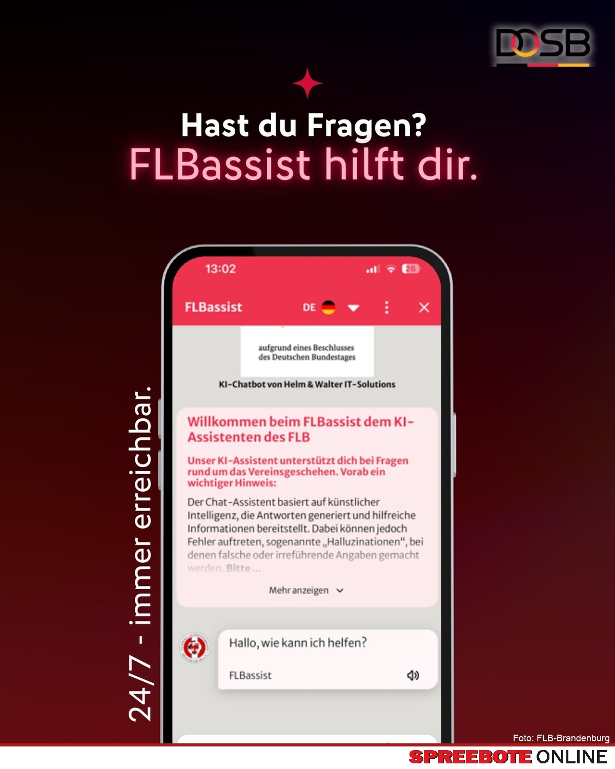 Der Fußball-Landesverband Brandenburg führt mit FLBassist den ersten KI-gestützten Chatbot in einem deutschen Fußball-Landesverband ein, der vom DOSB im Rahmen des Förderprogramms ReStart Sport bewegt Deutschland entwickelt wurde. Der digitale Assistent wird Vereinen, Ehrenamtlichen und Trainern künftig rund um die Uhr als erster Ansprechpartner zur Verfügung stehen von Fragen zum Spielbetrieb über Qualifizierung bis hin zu Service-Themen. Mit dem digitalen Assistenten zählt der FLB zu den Sportverbänden, die vom bundesgeförderten ReStart-Programm profitieren und einen eigens entwickelten Chatbot für Ehrenamtliche einsetzen. Darüber hinaus unterstützt der Chatbot die Initiative Künstliche Intelligenz im organisierten Sport. Ziel ist es, gemeinsam mit Sportvereinen, Landessportbünden und Fachverbänden praxistaugliche KI-Lösungen für den organisierten Sport zu entwickeln. KI ersetzt keine Menschen, aber sie kann ihnen Arbeit abnehmen. Für die Mitarbeiter unserer Geschäftsstelle ist dies eine große Hilfe für die vielfältigen Aufgaben, die sie tagtäglich zu erledigen haben. FLBassist ist gleichzeitig ein sehr wichtiger Baustein unserer Digitalstrategie, damit sich auch gerade unsere Ehrenamtlichen stärker auf das konzentrieren können, was unsere gemeinsame Leidenschaft ausmacht. die Arbeit für unseren Fußball, seine Menschen und alles, was auf und neben dem Platz wichtig ist so der FLB-Präsident Jens Kaden.