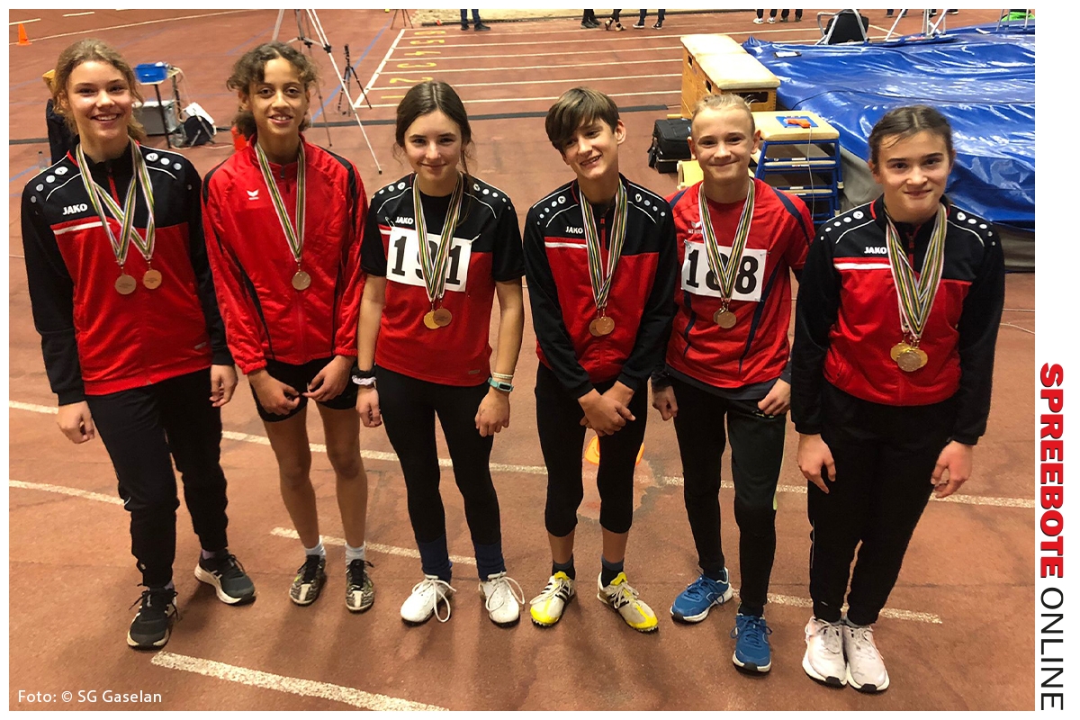 Ihre ein Jahr älteren Trainingskolleginnen Anny Sosnowsky, Luisa Kessler und Leonora Stolte konnten in der W12 sogar einen Triple-Sieg für den Verein holen. Anny, Landesmeisterin im Weitsprung, siegte mit ihrem 6. Versuch und sehr guten 4,86 m. Auch Luisa verbesserte sich im letzten Versuch auf 4,49 m und wurde Zweite. Leonora machte das Trio perfekt und holte sich Bronze mit 4,39 m. Im 60m-Hürdenlauf konnte sich Luisa die Goldmedaille holen (10,86 sek) und Anny belegte in dieser Disziplin den 2. Platz (11,00 sek). Leonora wurde Vierte in 11,34 sek. Im Kugelstoßen erreichten alle 3 Mädchen eine neue Bestleistung. Luisa stieß in ihrem ersten Kugelstoß-Wettkampf gute 6,64 m weit und verpasste das Treppchen um nur 9 cm. Leonora kratzte erstmals an der 9m-Marke und sicherte sich mit 8,99 m den 2. Platz und Anny gewann diese Disziplin mit 9,33 m. Im abschließenden Staffellauf kämpften die Sportlerinnen dann gemeinsam mit Sarah Basner (W13) um den Sieg auf der 4×100 m-Strecke. Die Staffel des Vereins SV Olympia Cottbus war nicht einzuholen, doch konnten die vier den 2. Platz halten und sich am Ende über die Silbermedaille freuen. Zuvor hatte Sarah im Hochsprung das Treppchen knapp verpasst. Sie sprang 1,40 m hoch, genauso wie der 2. und 3. Platz, allerdings hatte sie mehr Fehlversuche und wurde somit auf den 4. Platz verwiesen. Die 12-jährigen Jungen starteten an diesem Samstag mit dem Weitsprung, wo Noah Röhr und Till Kunze knapp hintereinander die Plätze 2 und 3 belegten. Noah sprang eine neue Bestleistung und 4,21 m weit und Till landete bei 4,20 m. Die Siegerweite war 4,36 m. Die gleiche Konstellation gab es im 60m-Sprint (Noah: 9,02 sek; Till: 9,41 sek). Einen jeweils 1. Platz holten die beiden Trainingskameraden dann im Kugelstoßen (Noah: 8,00 m) und im 500m-Lauf (Till: 1:33,43 min). Die älteste Teilnehmerin von der SG Gaselan Fürstenwalde war Noelle Lehmann (W15), die bereits seit 6 Jahren im Verein trainiert und Wettkämpfe bestreitet. Sie belegte sowohl im Sprint (6,68 sek), als auch im Weitsprung (4,98 m) den 1. Platz. In diesem Jahr ist sie bereits mehrmals über 5,00 m gesprungen. Im 60m Hürdensprint belegte sie in 9,77 sek den 2. Platz.