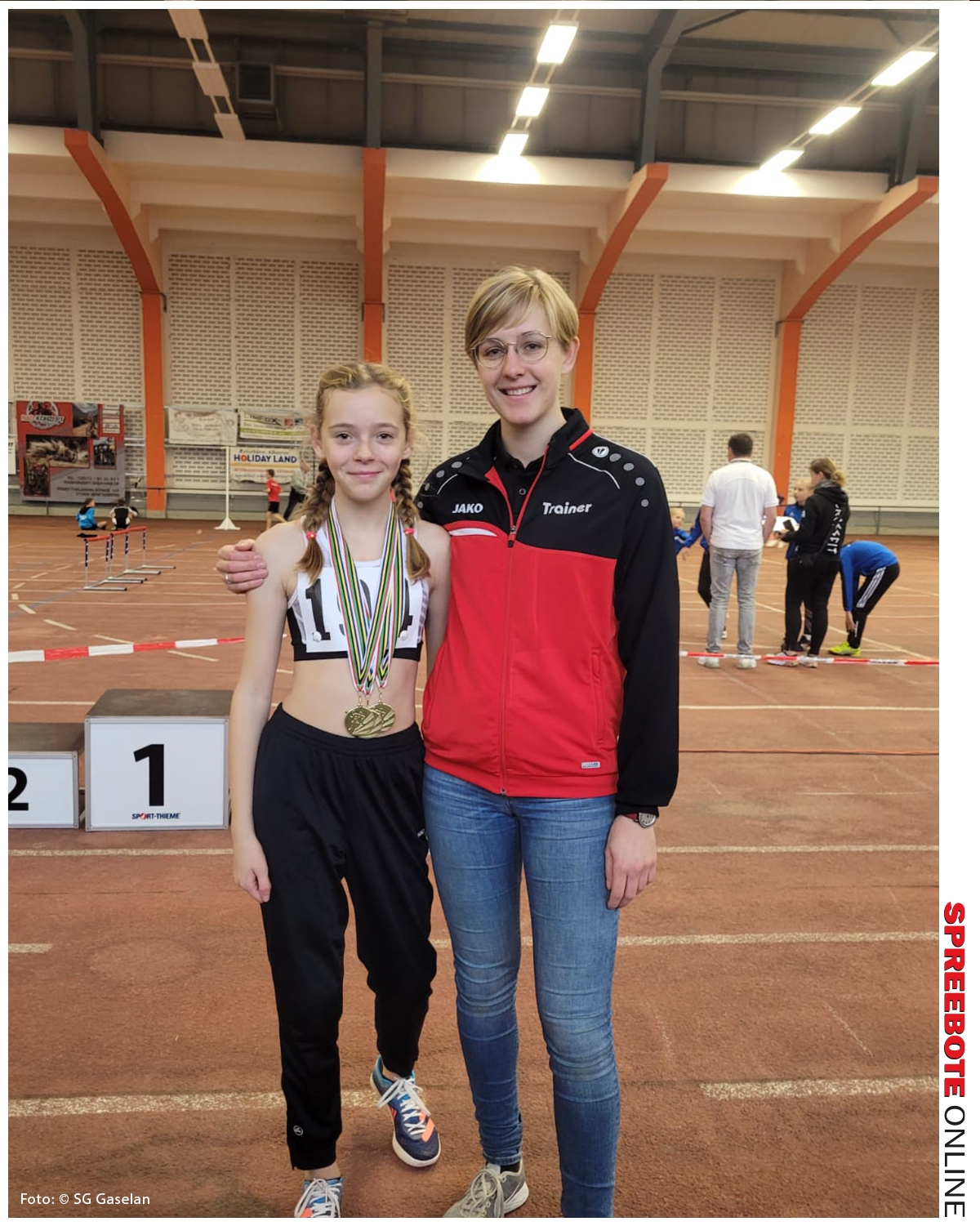 Ihre ein Jahr älteren Trainingskolleginnen Anny Sosnowsky, Luisa Kessler und Leonora Stolte konnten in der W12 sogar einen Triple-Sieg für den Verein holen. Anny, Landesmeisterin im Weitsprung, siegte mit ihrem 6. Versuch und sehr guten 4,86 m. Auch Luisa verbesserte sich im letzten Versuch auf 4,49 m und wurde Zweite. Leonora machte das Trio perfekt und holte sich Bronze mit 4,39 m. Im 60m-Hürdenlauf konnte sich Luisa die Goldmedaille holen (10,86 sek) und Anny belegte in dieser Disziplin den 2. Platz (11,00 sek). Leonora wurde Vierte in 11,34 sek. Im Kugelstoßen erreichten alle 3 Mädchen eine neue Bestleistung. Luisa stieß in ihrem ersten Kugelstoß-Wettkampf gute 6,64 m weit und verpasste das Treppchen um nur 9 cm. Leonora kratzte erstmals an der 9m-Marke und sicherte sich mit 8,99 m den 2. Platz und Anny gewann diese Disziplin mit 9,33 m. Im abschließenden Staffellauf kämpften die Sportlerinnen dann gemeinsam mit Sarah Basner (W13) um den Sieg auf der 4×100 m-Strecke. Die Staffel des Vereins SV Olympia Cottbus war nicht einzuholen, doch konnten die vier den 2. Platz halten und sich am Ende über die Silbermedaille freuen. Zuvor hatte Sarah im Hochsprung das Treppchen knapp verpasst. Sie sprang 1,40 m hoch, genauso wie der 2. und 3. Platz, allerdings hatte sie mehr Fehlversuche und wurde somit auf den 4. Platz verwiesen. Die 12-jährigen Jungen starteten an diesem Samstag mit dem Weitsprung, wo Noah Röhr und Till Kunze knapp hintereinander die Plätze 2 und 3 belegten. Noah sprang eine neue Bestleistung und 4,21 m weit und Till landete bei 4,20 m. Die Siegerweite war 4,36 m. Die gleiche Konstellation gab es im 60m-Sprint (Noah: 9,02 sek; Till: 9,41 sek). Einen jeweils 1. Platz holten die beiden Trainingskameraden dann im Kugelstoßen (Noah: 8,00 m) und im 500m-Lauf (Till: 1:33,43 min). Die älteste Teilnehmerin von der SG Gaselan Fürstenwalde war Noelle Lehmann (W15), die bereits seit 6 Jahren im Verein trainiert und Wettkämpfe bestreitet. Sie belegte sowohl im Sprint (6,68 sek), als auch im Weitsprung (4,98 m) den 1. Platz. In diesem Jahr ist sie bereits mehrmals über 5,00 m gesprungen. Im 60m Hürdensprint belegte sie in 9,77 sek den 2. Platz.