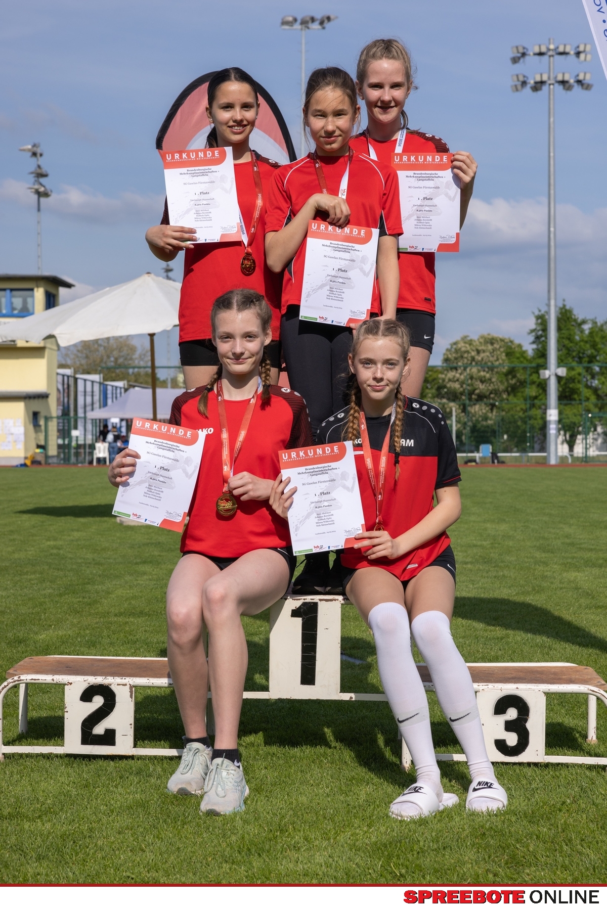Am Samstag, standen die Leichtathletik-Mehrkampf-Meisterschaften der U12 & U14 an und so sind insgesamt sieben Leichtathletinnen und Leichtathleten der SG Gaselan Fürstenwalde hoch motiviert nach Luckenwalde gereist. Den Anfang machte Nilay Mathes (M11), der in der Trainingsgruppe von Sandro Knoblich trainiert. Sein Ziel des Tages war der Landesmeistertitel im 3-Kampf (Weitsprung, Ballwurf, 50 m Sprint). Er zeigte bereits in der ersten Disziplin des Tages seine Topform, indem er mit neuer Bestleistung von 4,60 m im Weitsprung seine Konkurrenz hinter sich ließ. Auch beim anschließenden Ballwurf (36,50 m) und im 50 m Sprint (7,58 Sek) konnte er neue persönliche Bestleistungen aufstellen und immer in den Top 5 des Feldes landen. Mit insgesamt 1154 Punkten hatte er mehr als 50 Punkte Vorsprung auf den Zweitplatzierten und wurde brandenburgischer Meister im Mehrkampf. Beeindruckt von dieser Leistung gingen Nele Kleinschmidt, Anni Melchert, Milena Witkowska, Charlotte Wunder, Hannah Opitz und Johanna Bornhöfft (WU14) an den Start. Sie wussten, dass sie neben ihrer individuellen Wertung auch in der Mannschaftswertung eine gute Chance auf eine Medaille hatten. Begonnen wurde mit dem 75 m Sprint, wo die schnelle Anni Melchert in 9,99 Sek erstmals unter der 10-Sek-Marke blieb. Auch alle anderen Mädchen waren gut unterwegs und konnten neue persönliche Bestleistungen aufstellen. Im anschließenden Ballwurf konnte insbesondere Hannah Opitz glänzen. Sie warf den 200 g Ball 39,00 m weit und war in dieser Disziplin Fünftbeste ihrer Altersklasse. Bereits zu diesem Zeitpunkt führten die Mädchen in der Teamwertung und mussten nur noch im Weitsprung und im 800-m-Lauf weiter gute Leistungen zeigen. Dort freute sich Johanna Bornhöfft über ihren ersten 4m-Sprung. Die zwei besten Gaselanerinnen im Weitsprung waren Anni Melchert (4,97 m, PB) und Nele Kleinschmidt (4,47 m, PB), die dadurch beim Zwischenstand in der Einzelwertung gut platziert waren. Im abschließenden 800-m-Lauf ging es um die letzten wichtigen Punkte und alle waren hoch motiviert. Nele Kleinschmidt lief in einem couragierten Rennen in 2:40,61 min die fünftbeste Zeit des Tages. Anni verbesserte ihre bisherige Bestleistung um neun Sekunden auf 2:46,88 min. Johanna und Milena sogar um jeweils zwölf Sekunden auf 2:49,96 min und 2:55,28 min. Charlotte Wunder und Hannah Opitz komplettierten die guten Werte der Mannschaft mit jeweils neuer Bestleistung in 3:06 min. Anni Melchert freute sich an diesem Tag mit ihren vier neuen Bestleistungen und 1913 Punkten über die verdiente Bronzemedaille. In der Mannschaftswertung hatten die Mädchen fast 500 Punkte Vorsprung vor dem Team der LLG Luckenwalde und SV electronic Hohen Neuendorf und jubelten dort über die Goldmedaille.
