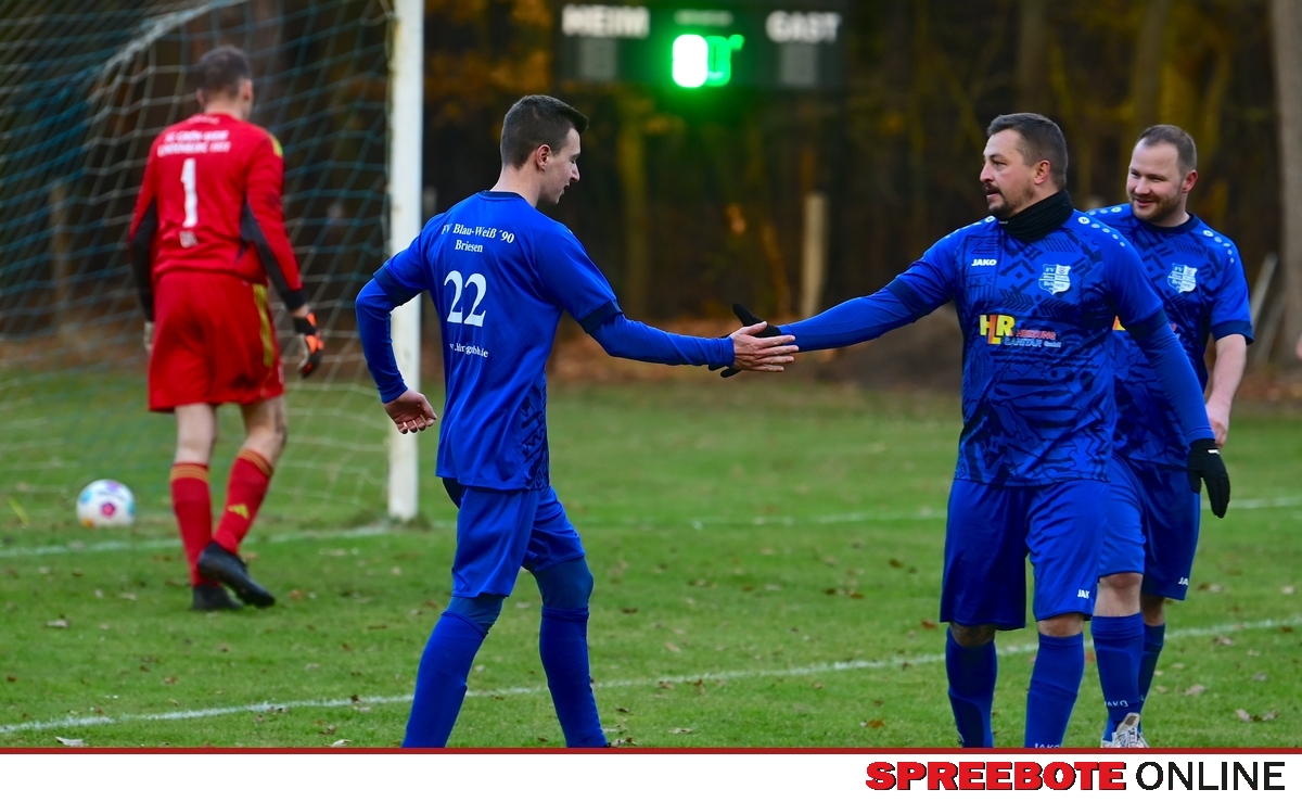Am 12. Spieltag der Kreisliga Süd begrüßte der FV Blau-Weiß Briesen II die SG Grün-Weiß Lindenberg. Es entwickelte sich schnell ein rasantes Spiel. Die Lindenberger, kein zu unterschätzender Gegner, versuchten mit ihrer Offensive früh ein Tor zu erzielen, bissen sich jedoch an der Abwehr fest. Briesen machte die Räume dicht und konnte die Anfangsphase nutzen, um in Führung zu gehen.George Krüger brachte Briesen in der 4. Minute in Führung. Vorausgegangen war ein schneller Konter, den der Lindenberger Torwart Andreas Olmig gerade noch zur Ecke klären konnte. Kevin Schübler führte die Ecke aus: Der Ball kam und Krüger köpfte ins Tor.
