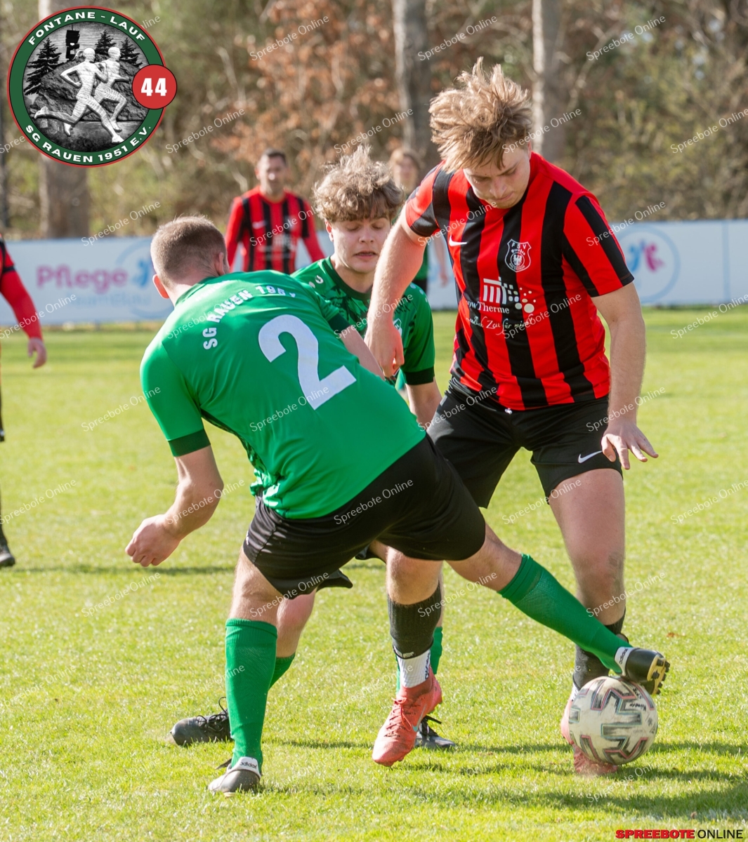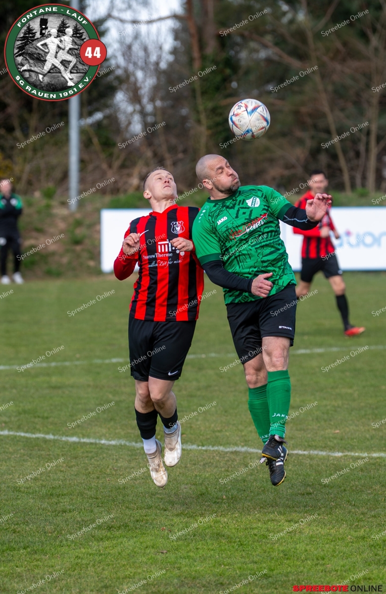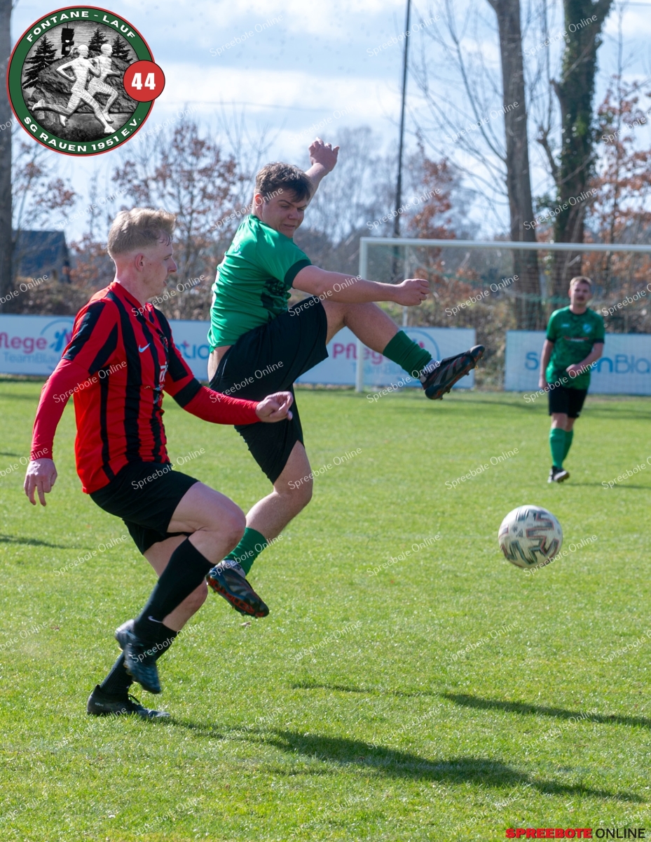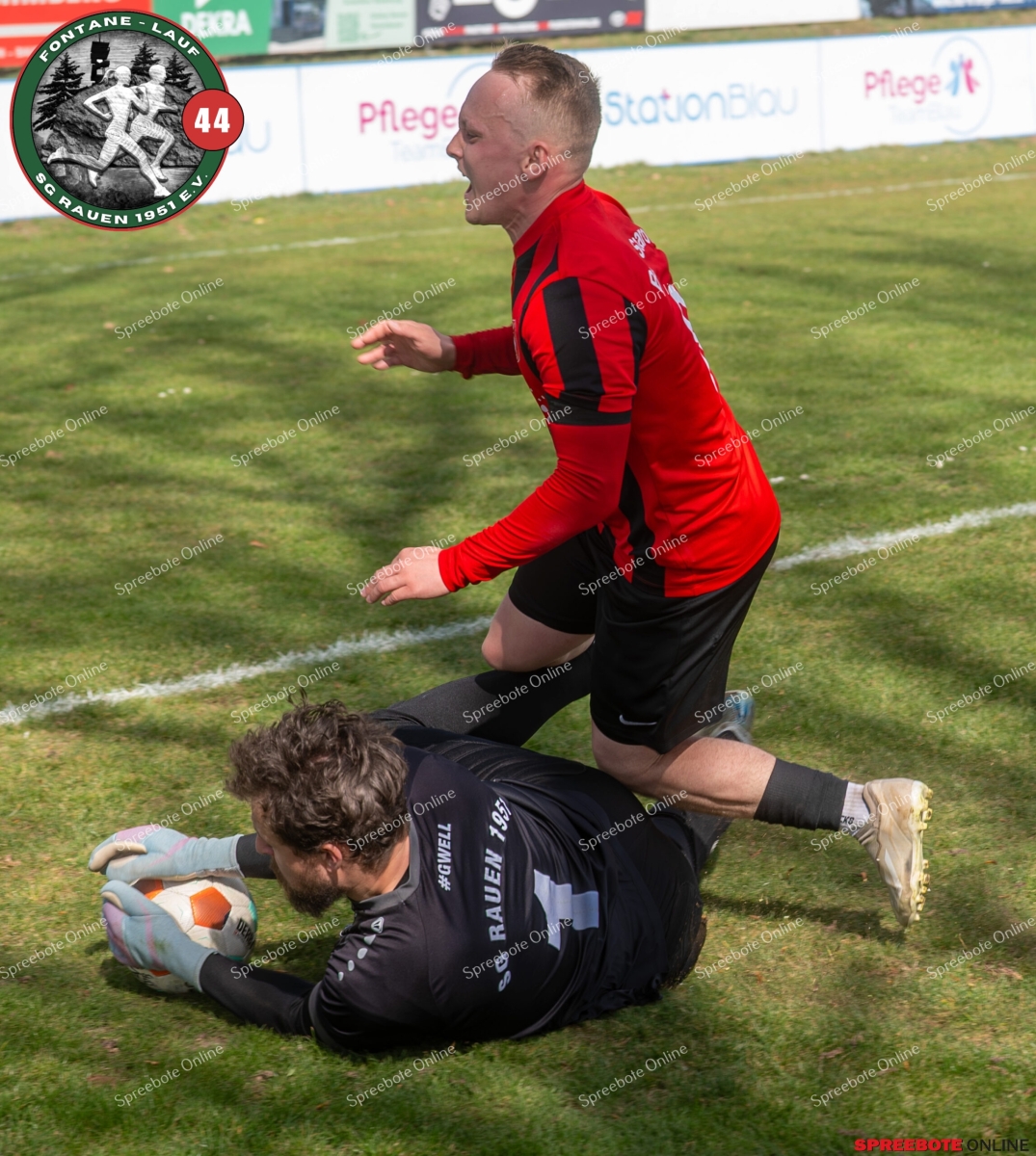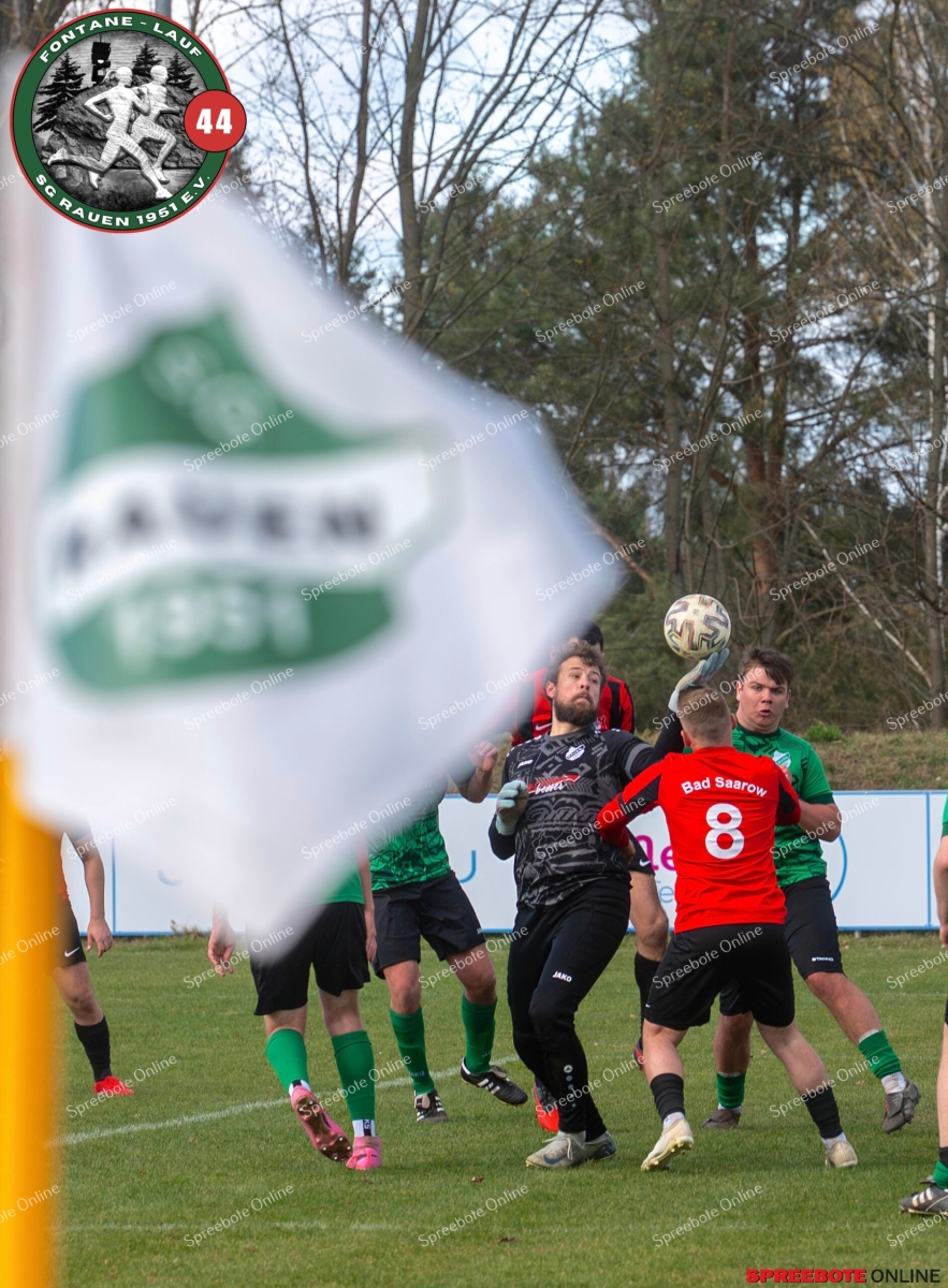 Sonntagsspiel und Kaiserwetter das ist die Kombination, die dem Fußball eine besondere Note verleiht. Alle haben Zeit, weil die meisten Spiele bereits am Samstag stattgefunden haben, so ist dieses Derby auch besonders zu bewerten. Man kennt sich ohnehin aus vielen Begegnungen, wie aus der erst kürzlich stattgefundenen Winterhallensaison. Und nun bei lockeren 10 Grad im Schatten im Stadion der SG Rauen. Große Freude herrscht, dass Florian Zinke gekommen war. Er wurde im letzten Spiel der SG Rauen verletzt, aber er wollte wie alle anderen Gäste eben dieses Derby authentisch miterleben. Die Rauener, die seit fünf Spielen ungeschlagen sind, haben einen guten Lauf, was das prognostizierte Ziel von Trainer Marcel Niespodziany und der Mannschaft ist: ein Team zu entwickeln und es zu formen, bis es mit allen Wassern gewaschen ist. Ihnen gegenüber ein ebenso schlagfertiges Preußen Bad Saarow Team, das ebenfalls seit fünf Spielen über sich hinaus wächst und sich durch die Tabelle pflügt. Das Spiel war anfangs etwas unspektakulär, da sich Rauen auf alte Taktiken zurückzog und tief in der eigenen Hälfte stand und die Preußen sich die Zähne an ihnen ausbissen. Mit hohen Bällen versuchten sie, dem Treiben der Rauener ein Ende zu setzen mit wenig Erfolg, aber dafür gefährlich im Abschluss. Mit einem Freistoß für die Preußen aus linker Position kommt der Ball gut in die Mitte vor das Tor der Rauener, es entsteht ein Gerangel, und Tim Strey macht in der 20. Minute das 0:1 für die Gäste. Für Rauen in dem Moment eine bittere Pille, aber das Spiel war noch lang.