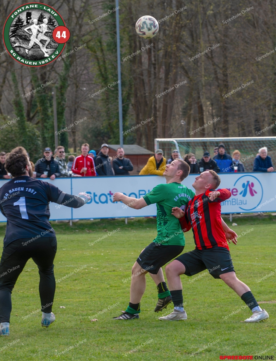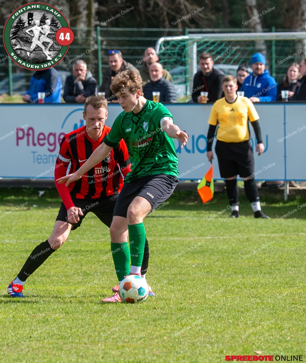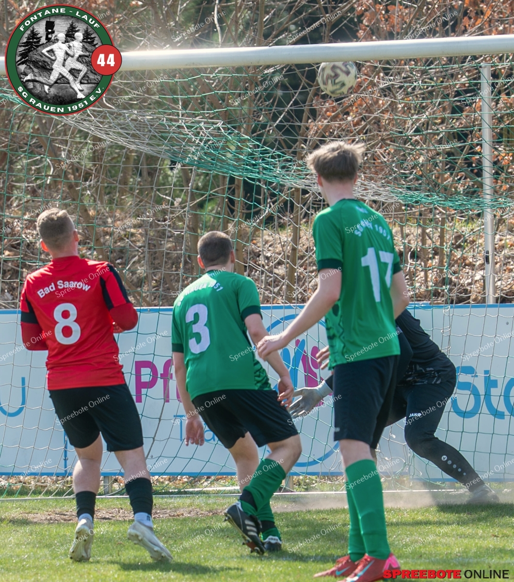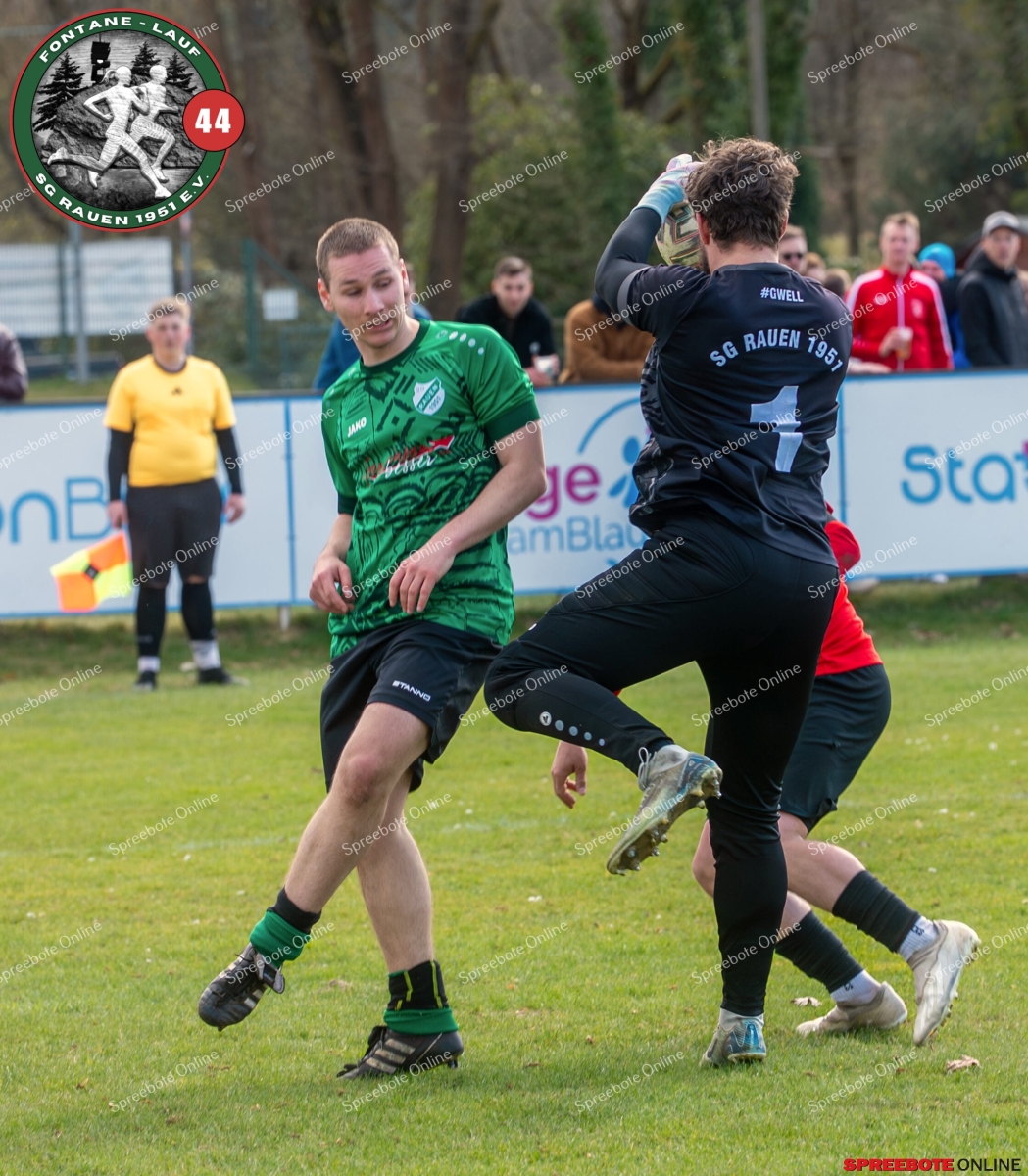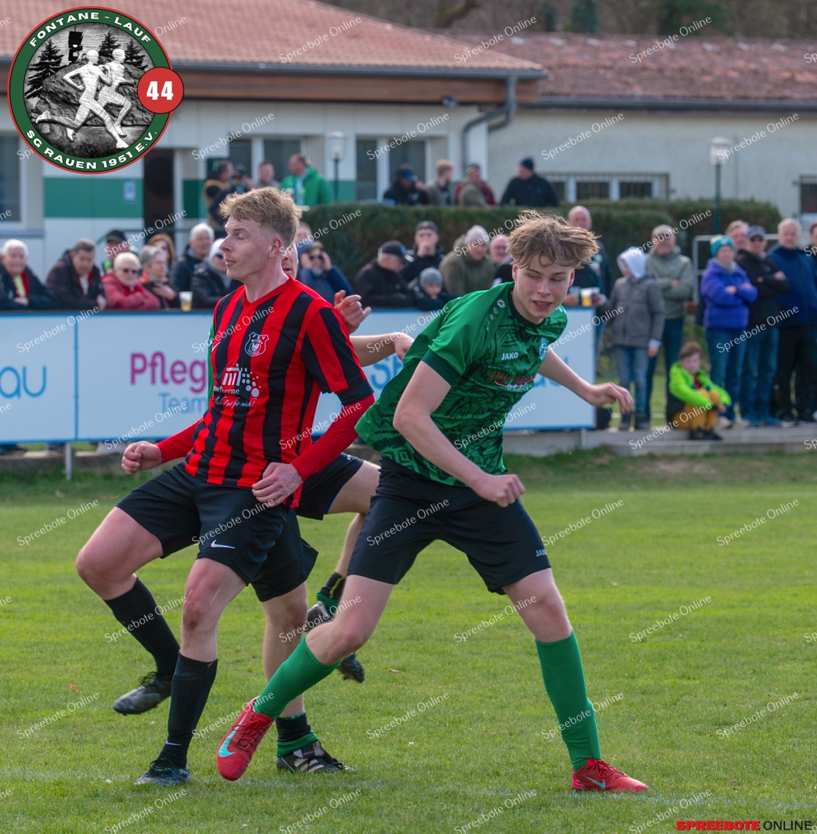 Sonntagsspiel und Kaiserwetter das ist die Kombination, die dem Fußball eine besondere Note verleiht. Alle haben Zeit, weil die meisten Spiele bereits am Samstag stattgefunden haben, so ist dieses Derby auch besonders zu bewerten. Man kennt sich ohnehin aus vielen Begegnungen, wie aus der erst kürzlich stattgefundenen Winterhallensaison. Und nun bei lockeren 10 Grad im Schatten im Stadion der SG Rauen. Große Freude herrscht, dass Florian Zinke gekommen war. Er wurde im letzten Spiel der SG Rauen verletzt, aber er wollte wie alle anderen Gäste eben dieses Derby authentisch miterleben. Die Rauener, die seit fünf Spielen ungeschlagen sind, haben einen guten Lauf, was das prognostizierte Ziel von Trainer Marcel Niespodziany und der Mannschaft ist: ein Team zu entwickeln und es zu formen, bis es mit allen Wassern gewaschen ist. Ihnen gegenüber ein ebenso schlagfertiges Preußen Bad Saarow Team, das ebenfalls seit fünf Spielen über sich hinaus wächst und sich durch die Tabelle pflügt. Das Spiel war anfangs etwas unspektakulär, da sich Rauen auf alte Taktiken zurückzog und tief in der eigenen Hälfte stand und die Preußen sich die Zähne an ihnen ausbissen. Mit hohen Bällen versuchten sie, dem Treiben der Rauener ein Ende zu setzen mit wenig Erfolg, aber dafür gefährlich im Abschluss. Mit einem Freistoß für die Preußen aus linker Position kommt der Ball gut in die Mitte vor das Tor der Rauener, es entsteht ein Gerangel, und Tim Strey macht in der 20. Minute das 0:1 für die Gäste. Für Rauen in dem Moment eine bittere Pille, aber das Spiel war noch lang.
