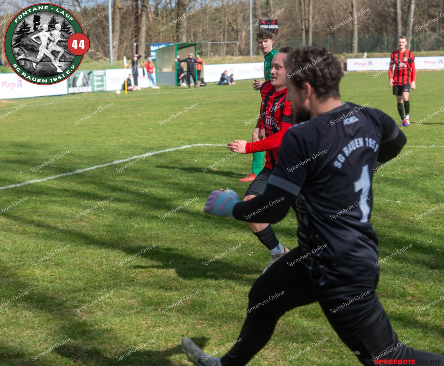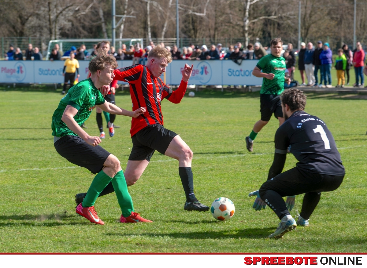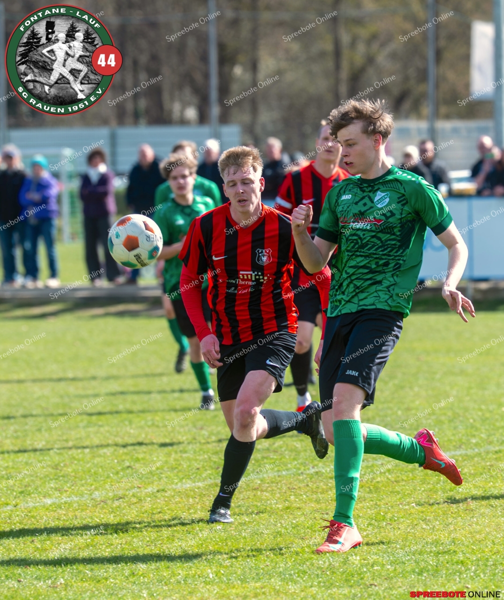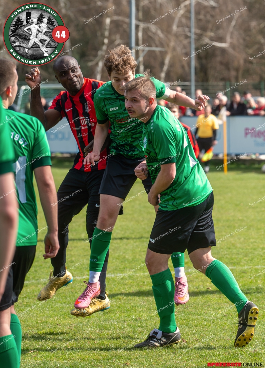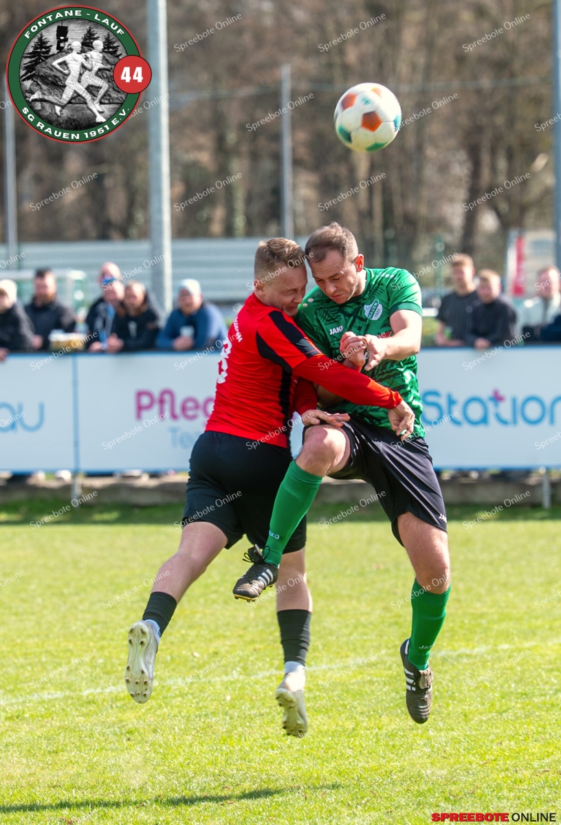 Sonntagsspiel und Kaiserwetter das ist die Kombination, die dem Fußball eine besondere Note verleiht. Alle haben Zeit, weil die meisten Spiele bereits am Samstag stattgefunden haben, so ist dieses Derby auch besonders zu bewerten. Man kennt sich ohnehin aus vielen Begegnungen, wie aus der erst kürzlich stattgefundenen Winterhallensaison. Und nun bei lockeren 10 Grad im Schatten im Stadion der SG Rauen. Große Freude herrscht, dass Florian Zinke gekommen war. Er wurde im letzten Spiel der SG Rauen verletzt, aber er wollte wie alle anderen Gäste eben dieses Derby authentisch miterleben. Die Rauener, die seit fünf Spielen ungeschlagen sind, haben einen guten Lauf, was das prognostizierte Ziel von Trainer Marcel Niespodziany und der Mannschaft ist: ein Team zu entwickeln und es zu formen, bis es mit allen Wassern gewaschen ist. Ihnen gegenüber ein ebenso schlagfertiges Preußen Bad Saarow Team, das ebenfalls seit fünf Spielen über sich hinaus wächst und sich durch die Tabelle pflügt. Das Spiel war anfangs etwas unspektakulär, da sich Rauen auf alte Taktiken zurückzog und tief in der eigenen Hälfte stand und die Preußen sich die Zähne an ihnen ausbissen. Mit hohen Bällen versuchten sie, dem Treiben der Rauener ein Ende zu setzen mit wenig Erfolg, aber dafür gefährlich im Abschluss. Mit einem Freistoß für die Preußen aus linker Position kommt der Ball gut in die Mitte vor das Tor der Rauener, es entsteht ein Gerangel, und Tim Strey macht in der 20. Minute das 0:1 für die Gäste. Für Rauen in dem Moment eine bittere Pille, aber das Spiel war noch lang.