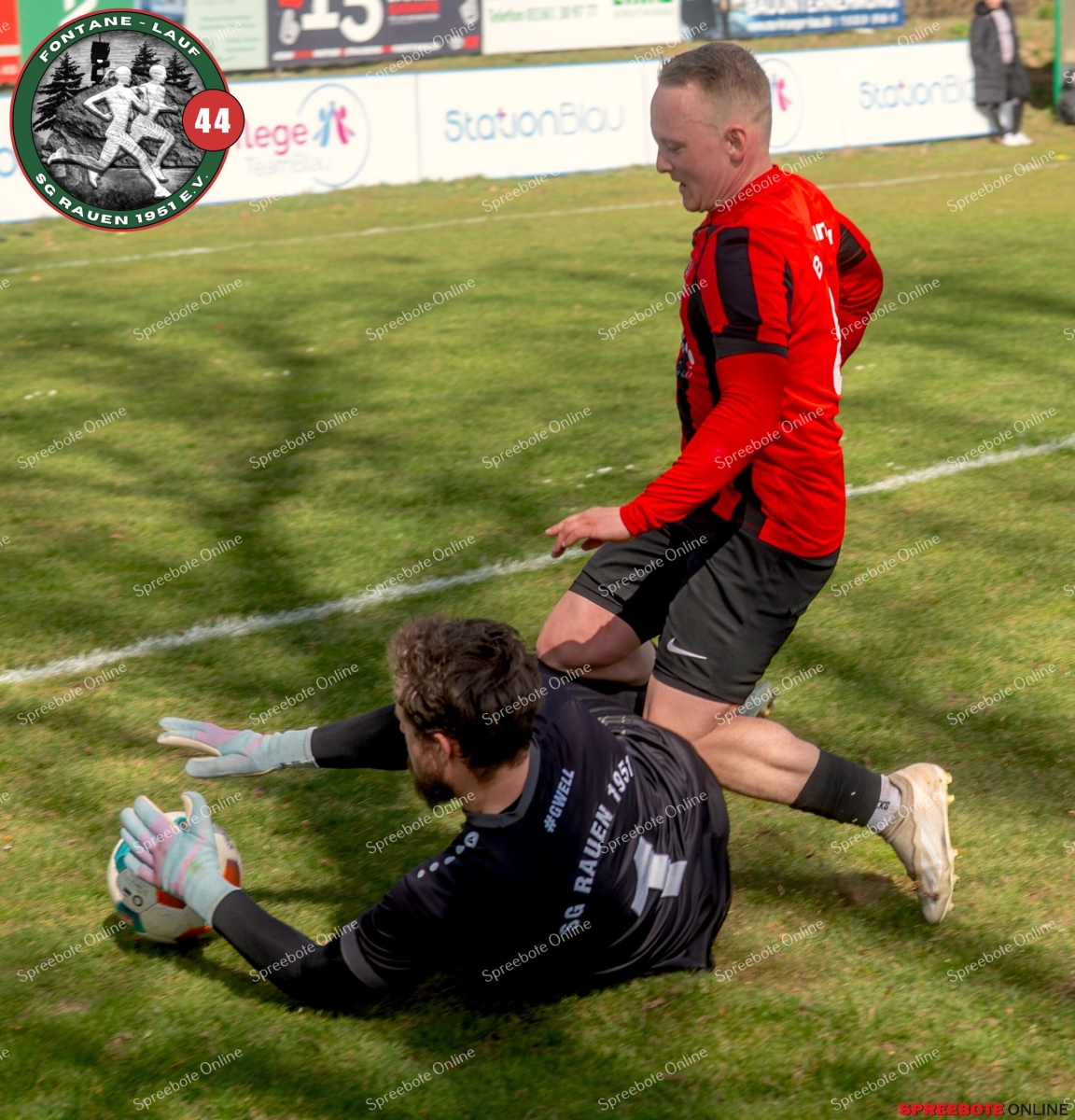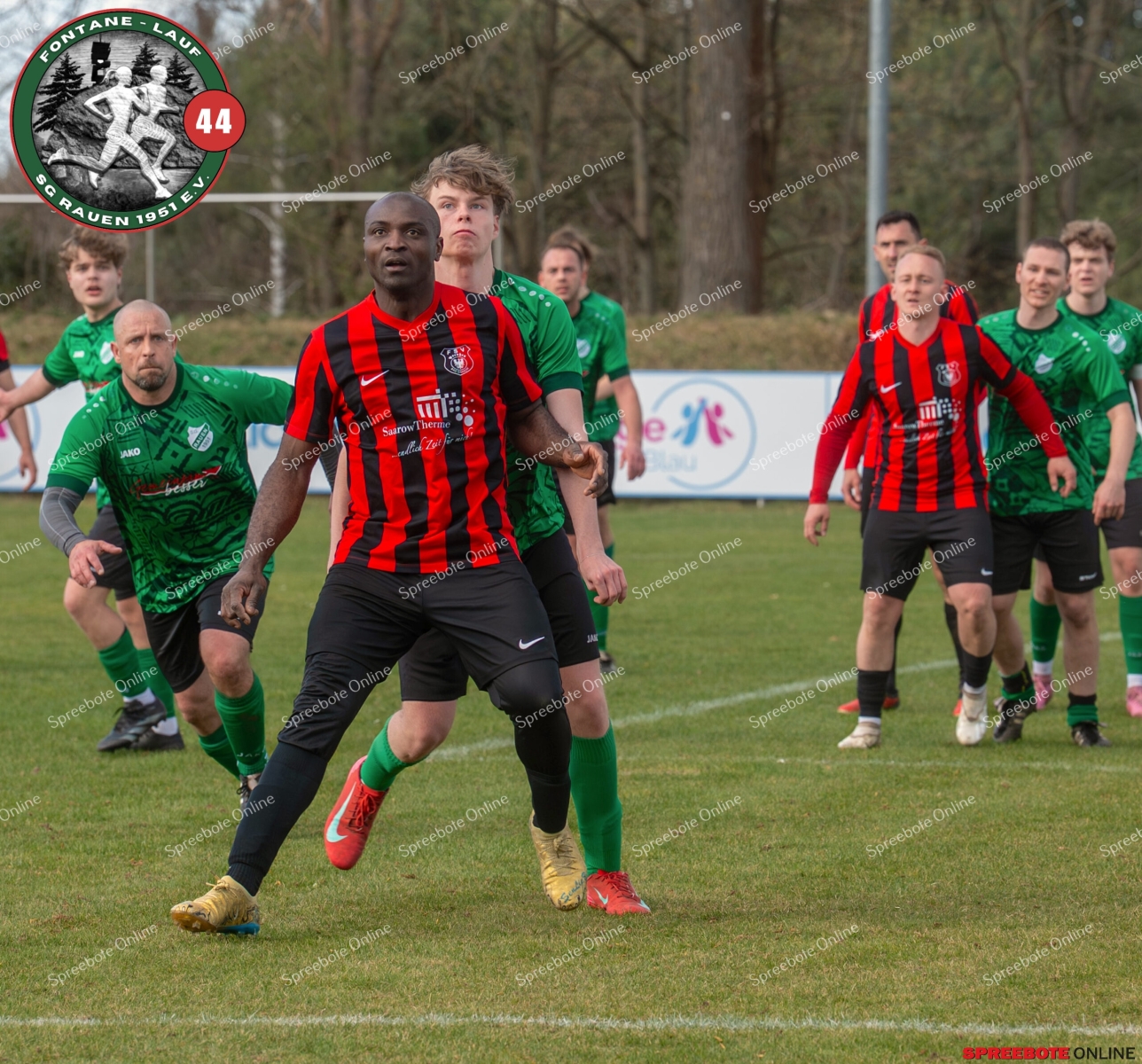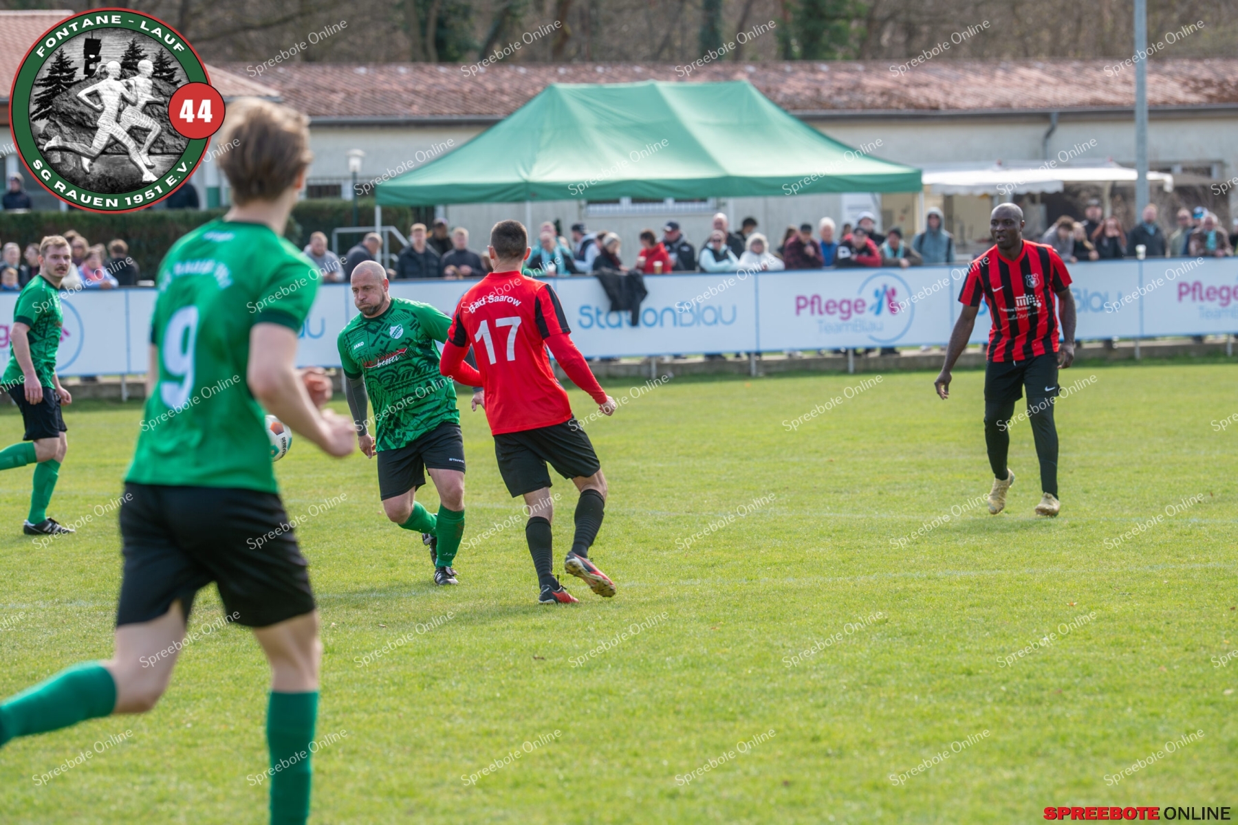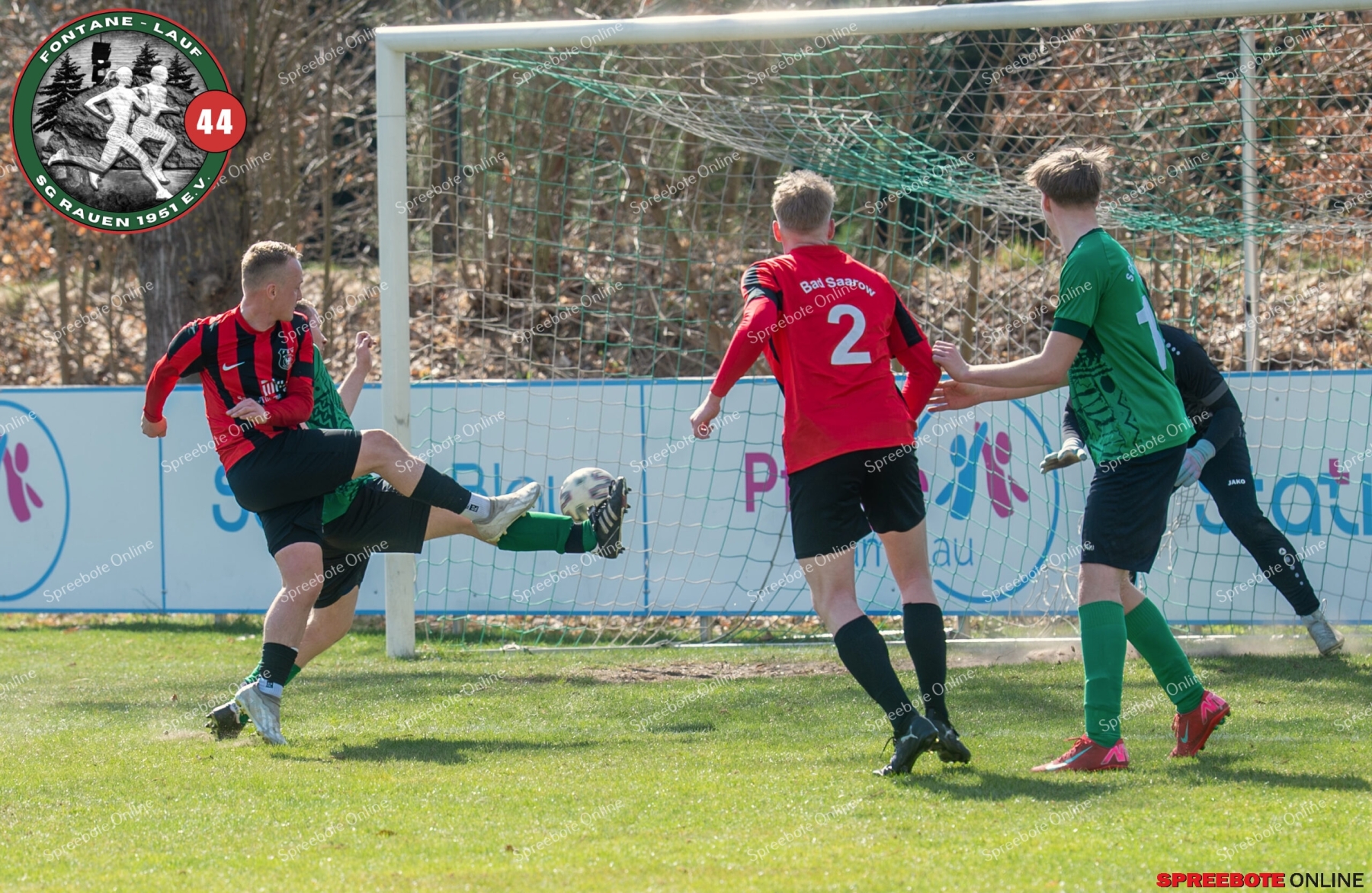 Sonntagsspiel und Kaiserwetter das ist die Kombination, die dem Fußball eine besondere Note verleiht. Alle haben Zeit, weil die meisten Spiele bereits am Samstag stattgefunden haben, so ist dieses Derby auch besonders zu bewerten. Man kennt sich ohnehin aus vielen Begegnungen, wie aus der erst kürzlich stattgefundenen Winterhallensaison. Und nun bei lockeren 10 Grad im Schatten im Stadion der SG Rauen. Große Freude herrscht, dass Florian Zinke gekommen war. Er wurde im letzten Spiel der SG Rauen verletzt, aber er wollte wie alle anderen Gäste eben dieses Derby authentisch miterleben. Die Rauener, die seit fünf Spielen ungeschlagen sind, haben einen guten Lauf, was das prognostizierte Ziel von Trainer Marcel Niespodziany und der Mannschaft ist: ein Team zu entwickeln und es zu formen, bis es mit allen Wassern gewaschen ist. Ihnen gegenüber ein ebenso schlagfertiges Preußen Bad Saarow Team, das ebenfalls seit fünf Spielen über sich hinaus wächst und sich durch die Tabelle pflügt. Das Spiel war anfangs etwas unspektakulär, da sich Rauen auf alte Taktiken zurückzog und tief in der eigenen Hälfte stand und die Preußen sich die Zähne an ihnen ausbissen. Mit hohen Bällen versuchten sie, dem Treiben der Rauener ein Ende zu setzen mit wenig Erfolg, aber dafür gefährlich im Abschluss. Mit einem Freistoß für die Preußen aus linker Position kommt der Ball gut in die Mitte vor das Tor der Rauener, es entsteht ein Gerangel, und Tim Strey macht in der 20. Minute das 0:1 für die Gäste. Für Rauen in dem Moment eine bittere Pille, aber das Spiel war noch lang.