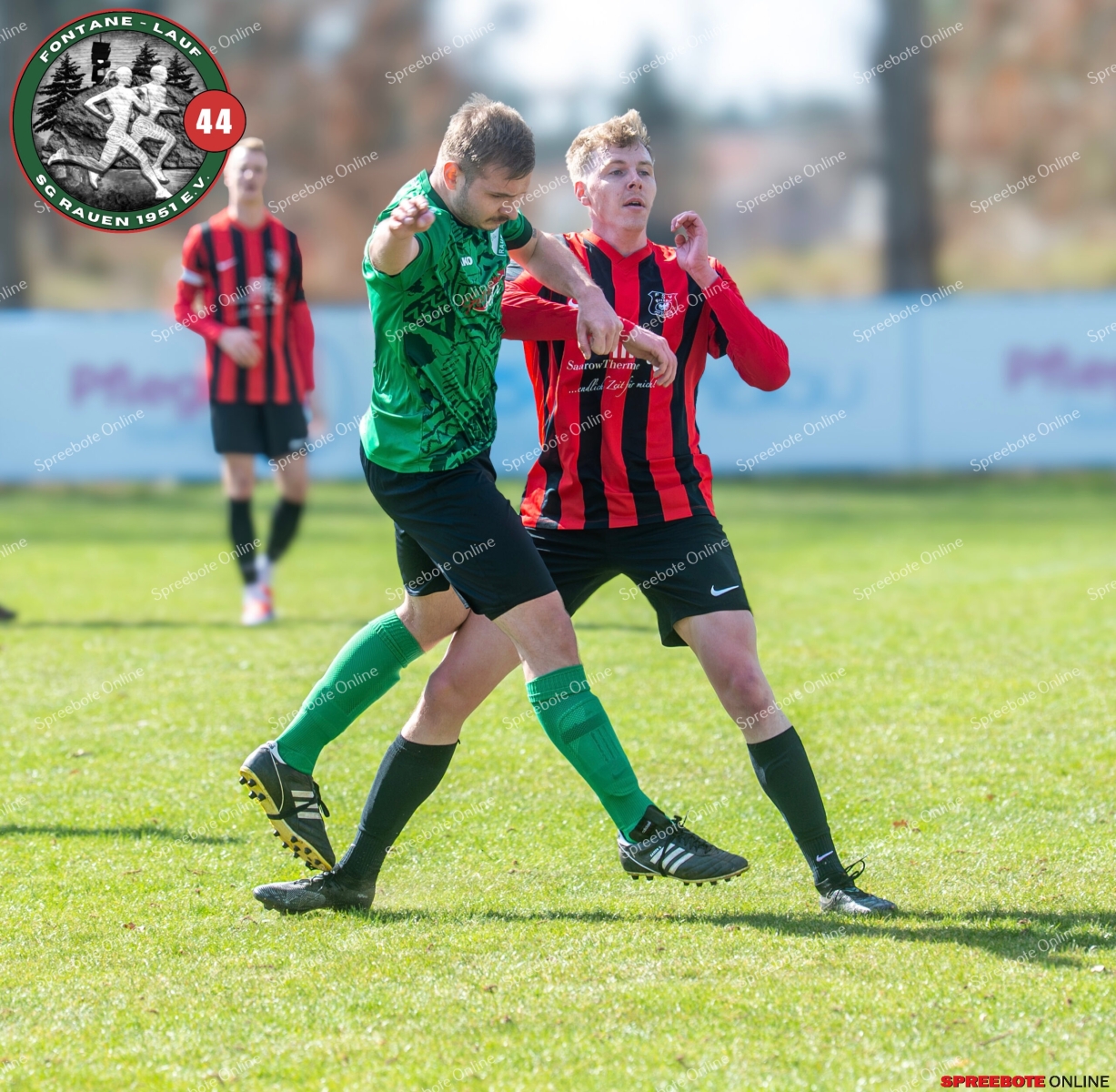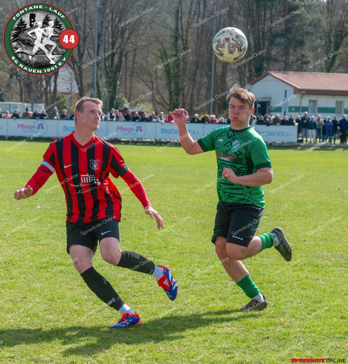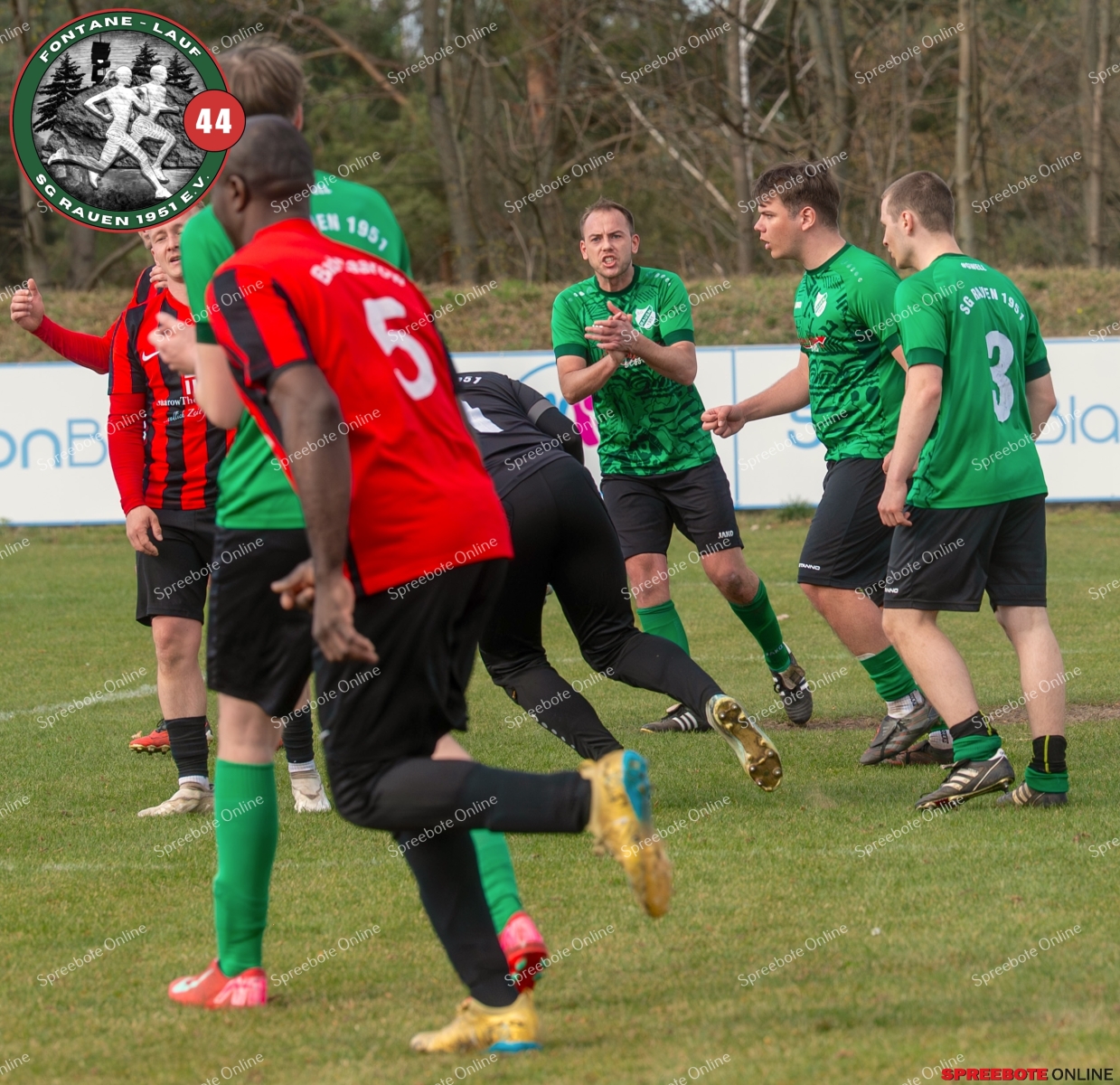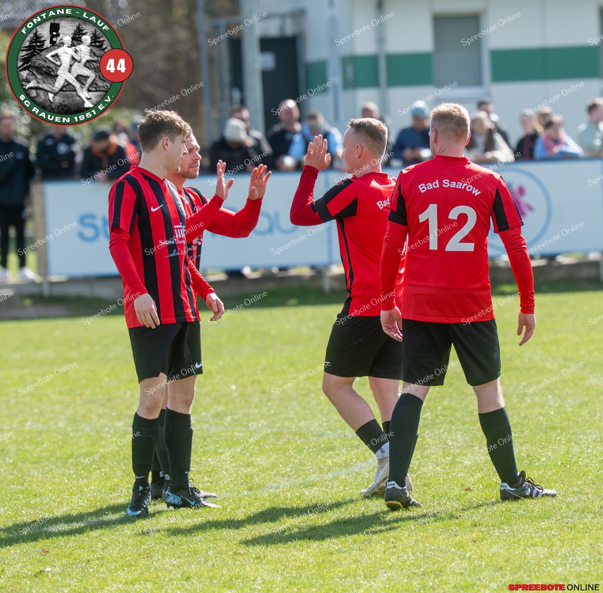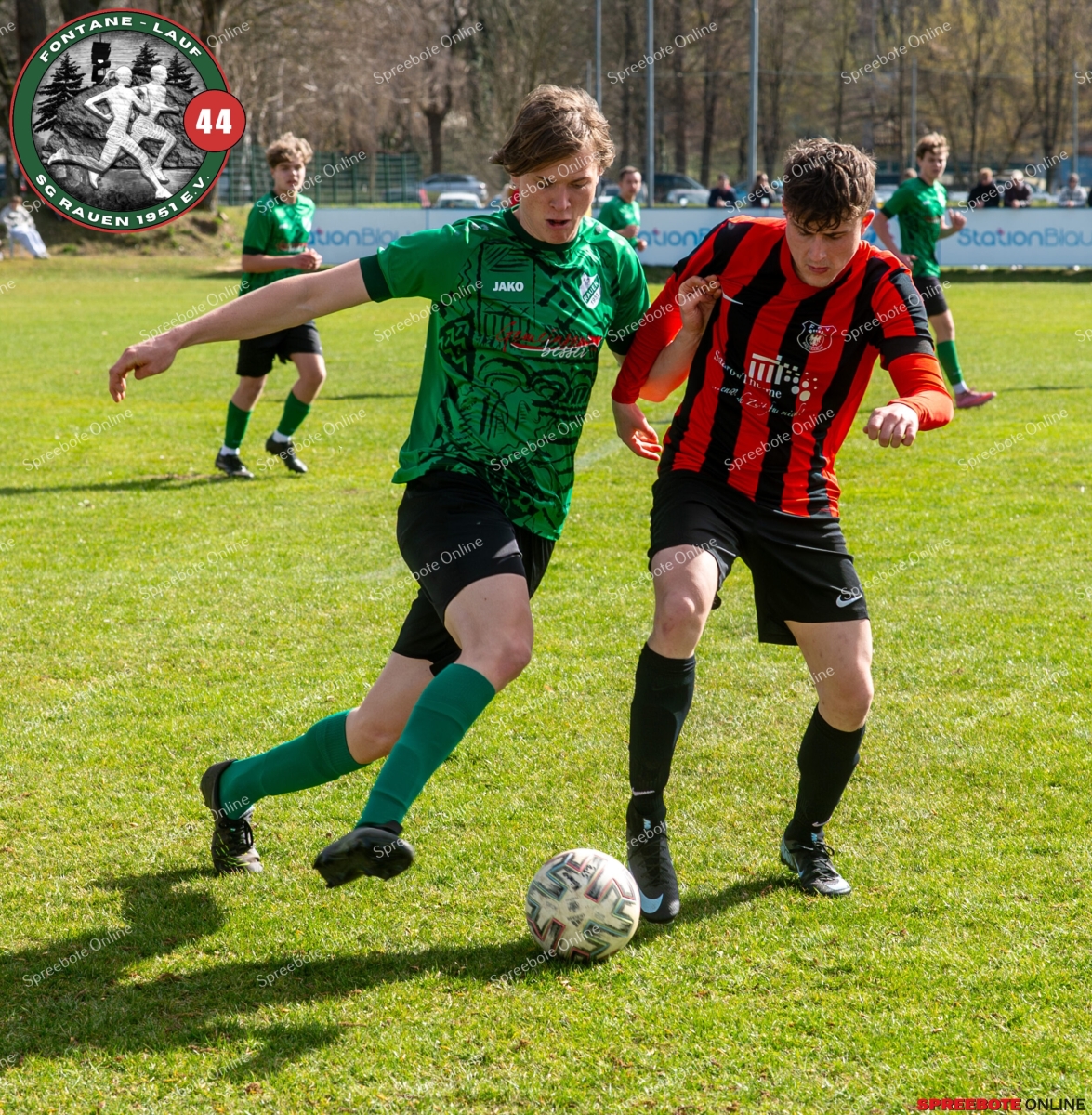 Sonntagsspiel und Kaiserwetter das ist die Kombination, die dem Fußball eine besondere Note verleiht. Alle haben Zeit, weil die meisten Spiele bereits am Samstag stattgefunden haben, so ist dieses Derby auch besonders zu bewerten. Man kennt sich ohnehin aus vielen Begegnungen, wie aus der erst kürzlich stattgefundenen Winterhallensaison. Und nun bei lockeren 10 Grad im Schatten im Stadion der SG Rauen. Große Freude herrscht, dass Florian Zinke gekommen war. Er wurde im letzten Spiel der SG Rauen verletzt, aber er wollte wie alle anderen Gäste eben dieses Derby authentisch miterleben. Die Rauener, die seit fünf Spielen ungeschlagen sind, haben einen guten Lauf, was das prognostizierte Ziel von Trainer Marcel Niespodziany und der Mannschaft ist: ein Team zu entwickeln und es zu formen, bis es mit allen Wassern gewaschen ist. Ihnen gegenüber ein ebenso schlagfertiges Preußen Bad Saarow Team, das ebenfalls seit fünf Spielen über sich hinaus wächst und sich durch die Tabelle pflügt. Das Spiel war anfangs etwas unspektakulär, da sich Rauen auf alte Taktiken zurückzog und tief in der eigenen Hälfte stand und die Preußen sich die Zähne an ihnen ausbissen. Mit hohen Bällen versuchten sie, dem Treiben der Rauener ein Ende zu setzen mit wenig Erfolg, aber dafür gefährlich im Abschluss. Mit einem Freistoß für die Preußen aus linker Position kommt der Ball gut in die Mitte vor das Tor der Rauener, es entsteht ein Gerangel, und Tim Strey macht in der 20. Minute das 0:1 für die Gäste. Für Rauen in dem Moment eine bittere Pille, aber das Spiel war noch lang.