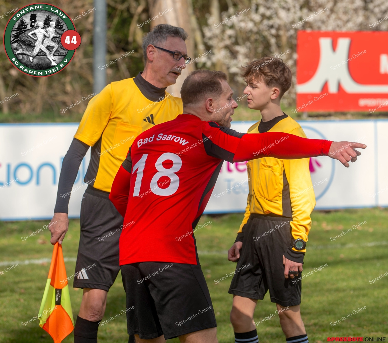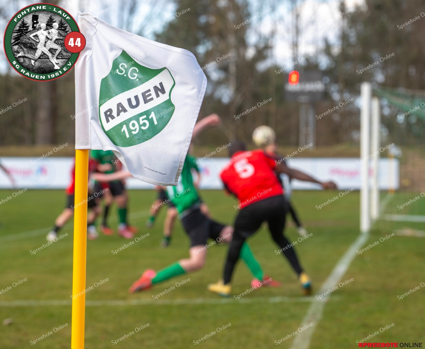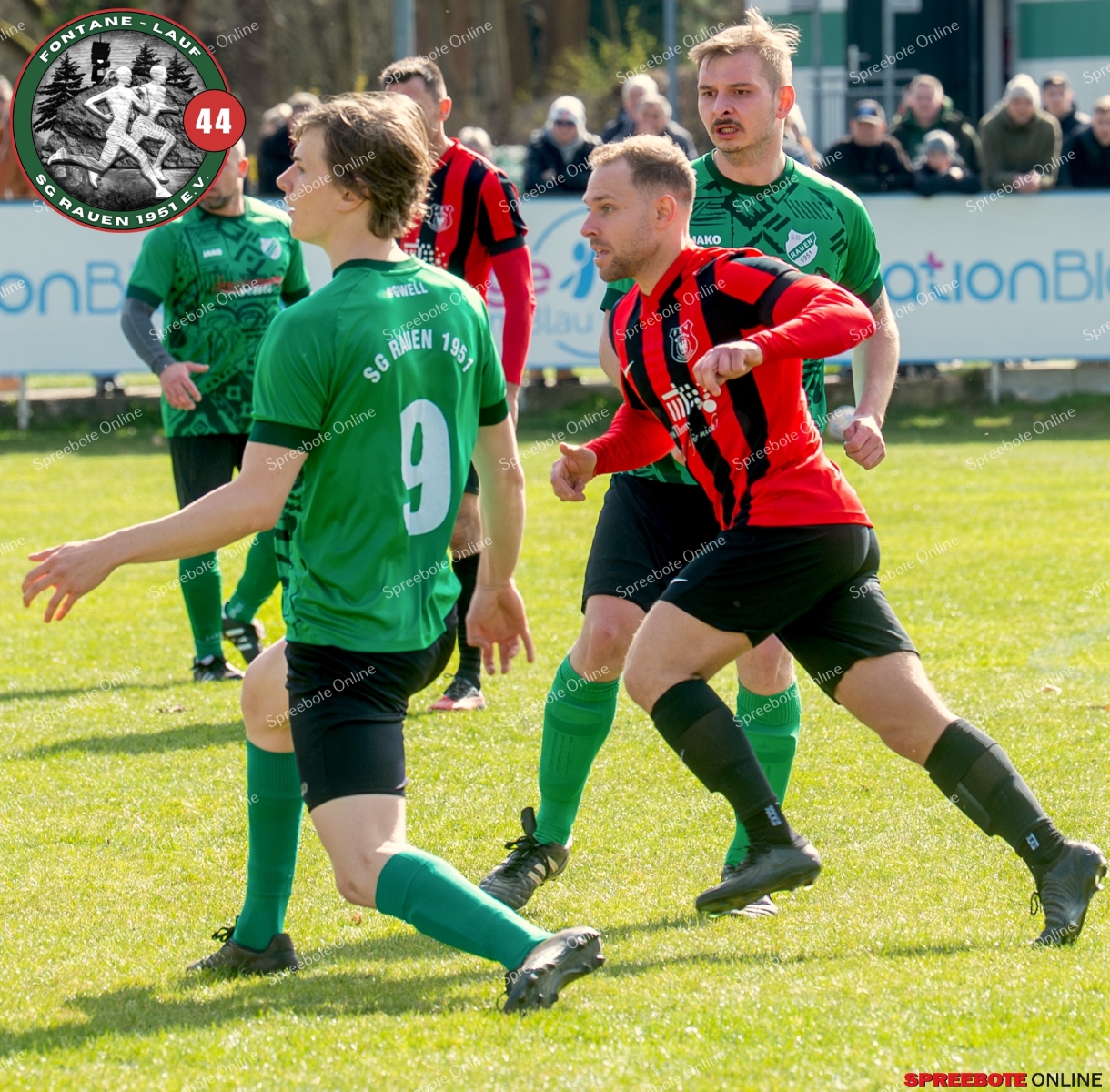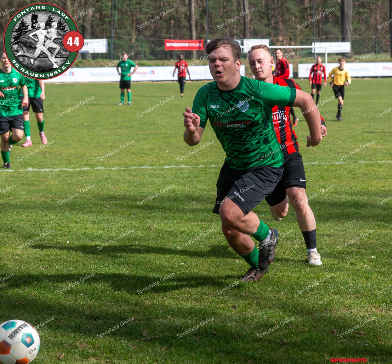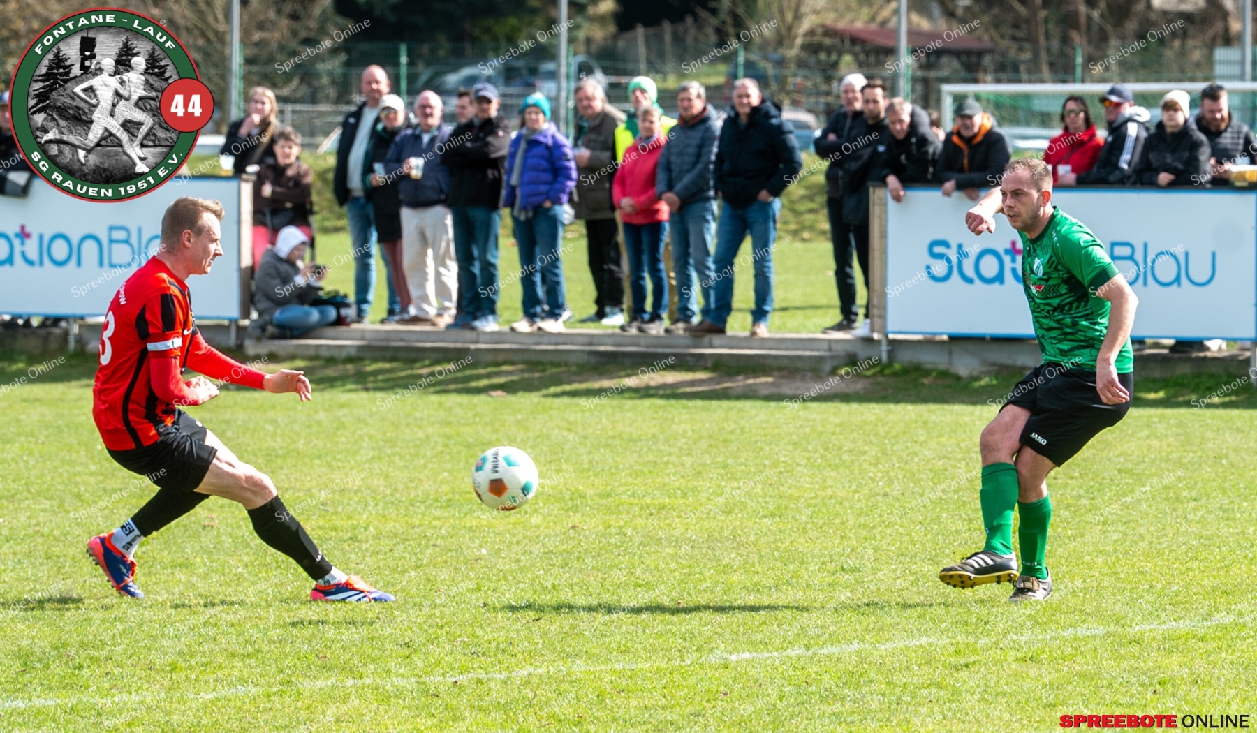 Sonntagsspiel und Kaiserwetter das ist die Kombination, die dem Fußball eine besondere Note verleiht. Alle haben Zeit, weil die meisten Spiele bereits am Samstag stattgefunden haben, so ist dieses Derby auch besonders zu bewerten. Man kennt sich ohnehin aus vielen Begegnungen, wie aus der erst kürzlich stattgefundenen Winterhallensaison. Und nun bei lockeren 10 Grad im Schatten im Stadion der SG Rauen. Große Freude herrscht, dass Florian Zinke gekommen war. Er wurde im letzten Spiel der SG Rauen verletzt, aber er wollte wie alle anderen Gäste eben dieses Derby authentisch miterleben. Die Rauener, die seit fünf Spielen ungeschlagen sind, haben einen guten Lauf, was das prognostizierte Ziel von Trainer Marcel Niespodziany und der Mannschaft ist: ein Team zu entwickeln und es zu formen, bis es mit allen Wassern gewaschen ist. Ihnen gegenüber ein ebenso schlagfertiges Preußen Bad Saarow Team, das ebenfalls seit fünf Spielen über sich hinaus wächst und sich durch die Tabelle pflügt. Das Spiel war anfangs etwas unspektakulär, da sich Rauen auf alte Taktiken zurückzog und tief in der eigenen Hälfte stand und die Preußen sich die Zähne an ihnen ausbissen. Mit hohen Bällen versuchten sie, dem Treiben der Rauener ein Ende zu setzen mit wenig Erfolg, aber dafür gefährlich im Abschluss. Mit einem Freistoß für die Preußen aus linker Position kommt der Ball gut in die Mitte vor das Tor der Rauener, es entsteht ein Gerangel, und Tim Strey macht in der 20. Minute das 0:1 für die Gäste. Für Rauen in dem Moment eine bittere Pille, aber das Spiel war noch lang.