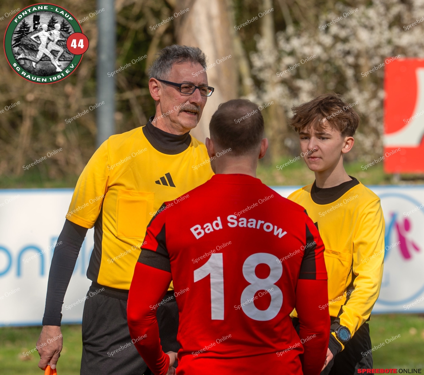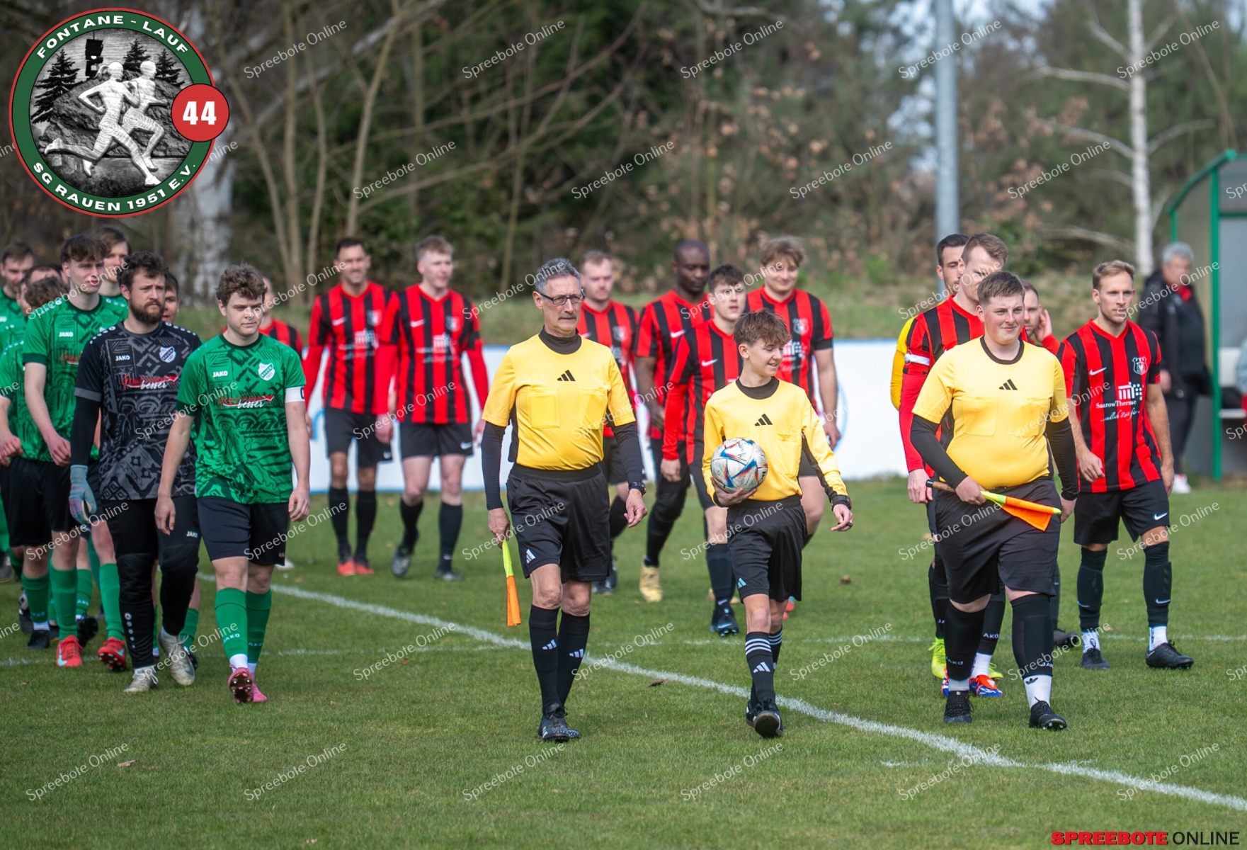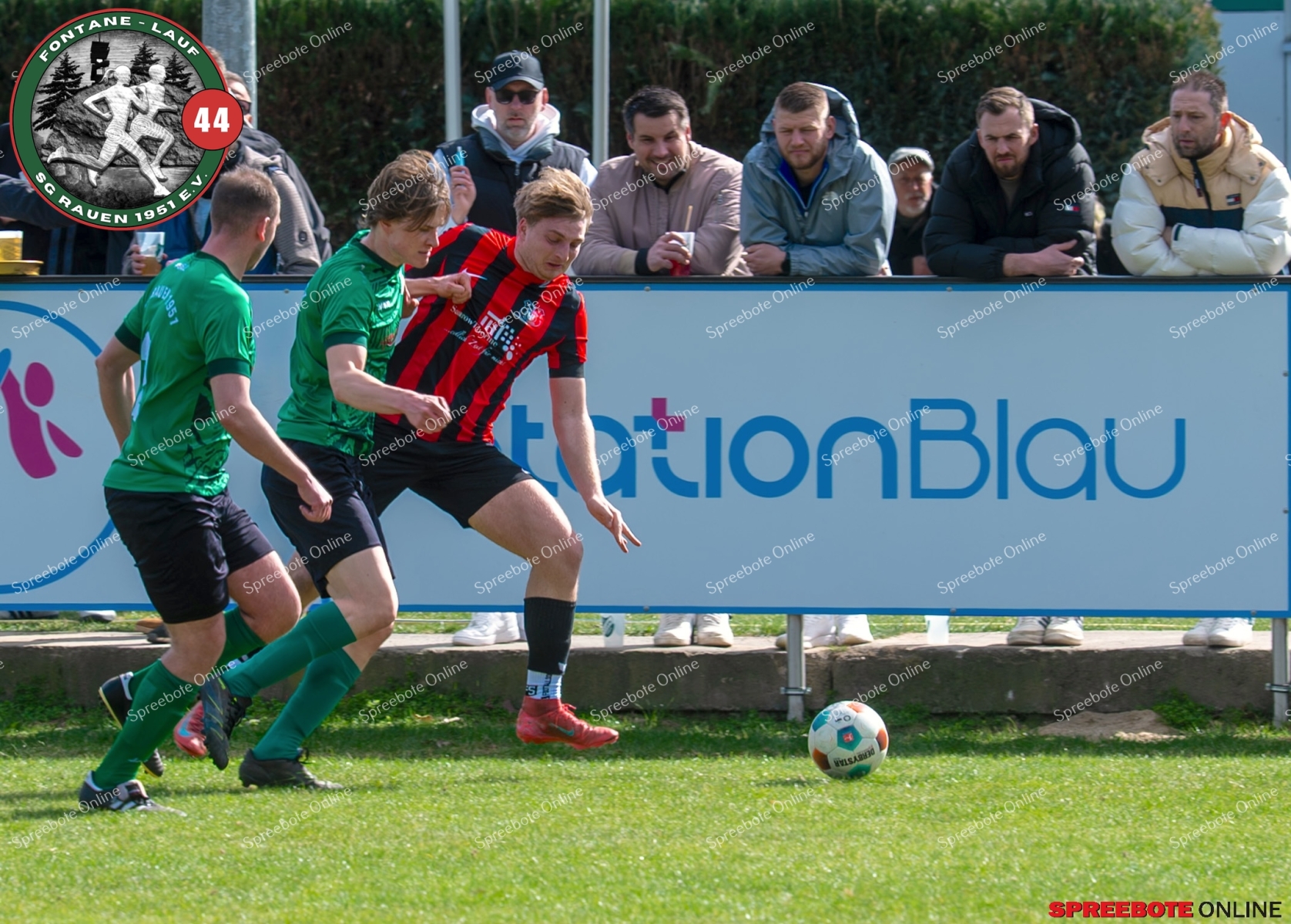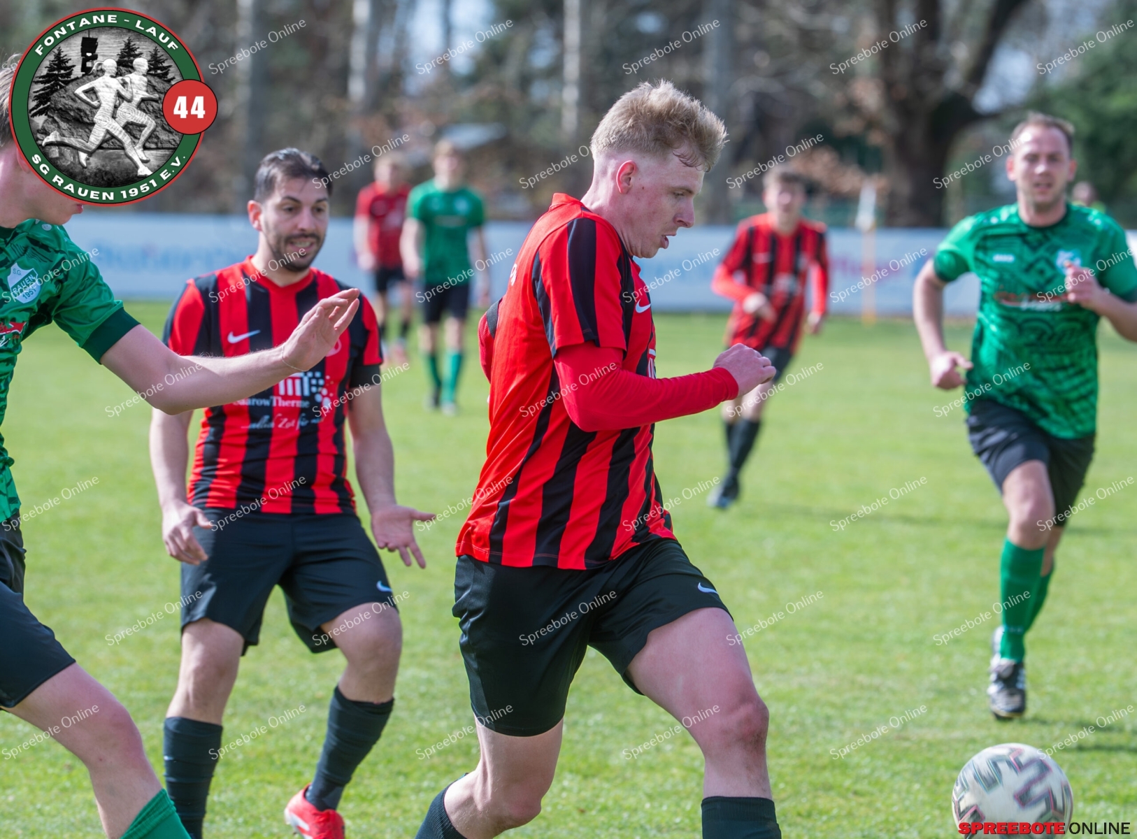 Sonntagsspiel und Kaiserwetter das ist die Kombination, die dem Fußball eine besondere Note verleiht. Alle haben Zeit, weil die meisten Spiele bereits am Samstag stattgefunden haben, so ist dieses Derby auch besonders zu bewerten. Man kennt sich ohnehin aus vielen Begegnungen, wie aus der erst kürzlich stattgefundenen Winterhallensaison. Und nun bei lockeren 10 Grad im Schatten im Stadion der SG Rauen. Große Freude herrscht, dass Florian Zinke gekommen war. Er wurde im letzten Spiel der SG Rauen verletzt, aber er wollte wie alle anderen Gäste eben dieses Derby authentisch miterleben. Die Rauener, die seit fünf Spielen ungeschlagen sind, haben einen guten Lauf, was das prognostizierte Ziel von Trainer Marcel Niespodziany und der Mannschaft ist: ein Team zu entwickeln und es zu formen, bis es mit allen Wassern gewaschen ist. Ihnen gegenüber ein ebenso schlagfertiges Preußen Bad Saarow Team, das ebenfalls seit fünf Spielen über sich hinaus wächst und sich durch die Tabelle pflügt. Das Spiel war anfangs etwas unspektakulär, da sich Rauen auf alte Taktiken zurückzog und tief in der eigenen Hälfte stand und die Preußen sich die Zähne an ihnen ausbissen. Mit hohen Bällen versuchten sie, dem Treiben der Rauener ein Ende zu setzen mit wenig Erfolg, aber dafür gefährlich im Abschluss. Mit einem Freistoß für die Preußen aus linker Position kommt der Ball gut in die Mitte vor das Tor der Rauener, es entsteht ein Gerangel, und Tim Strey macht in der 20. Minute das 0:1 für die Gäste. Für Rauen in dem Moment eine bittere Pille, aber das Spiel war noch lang.