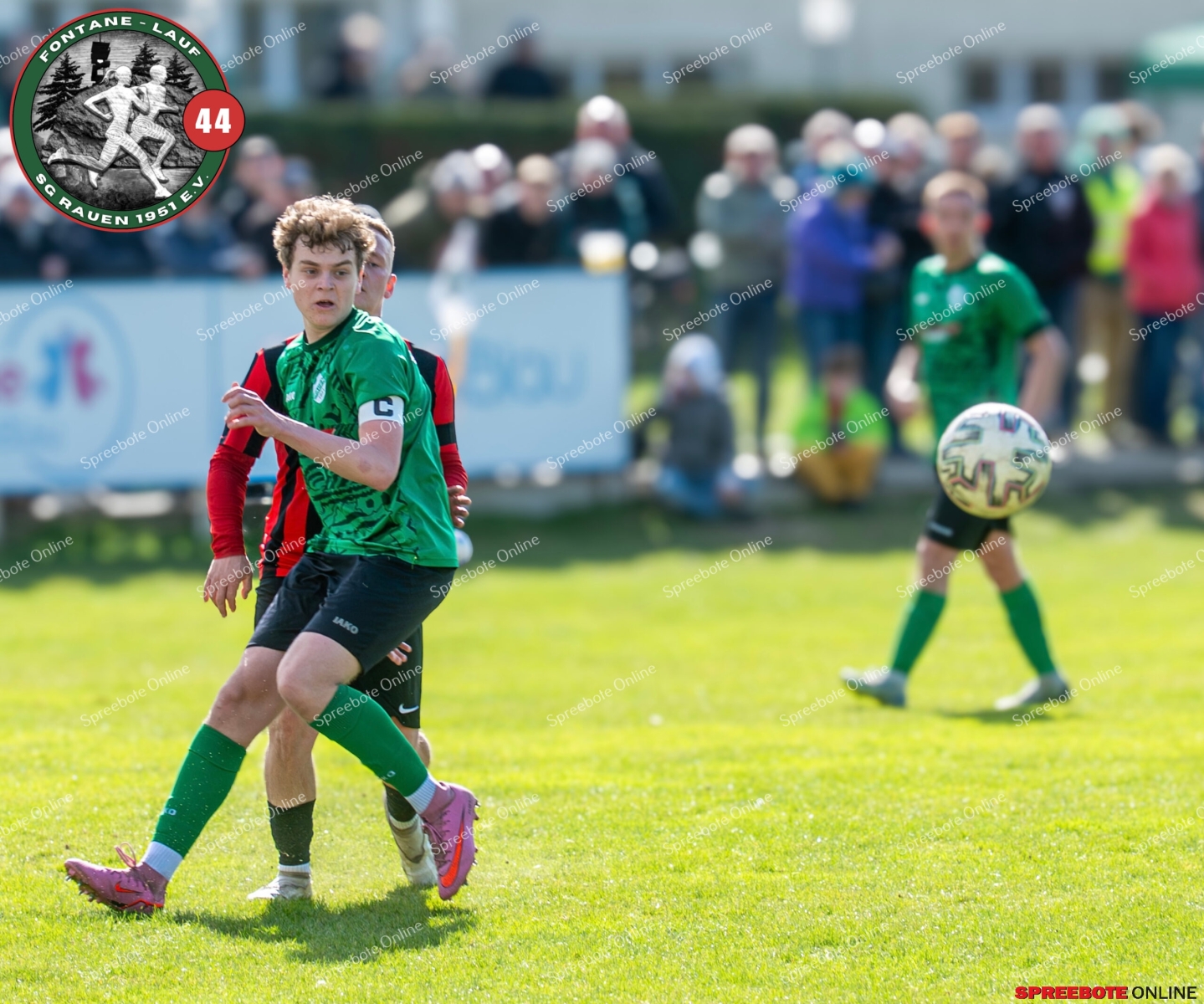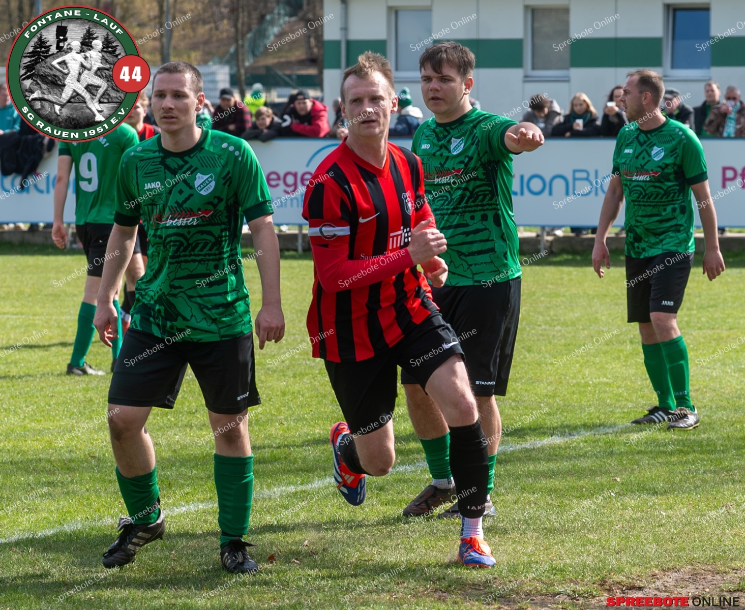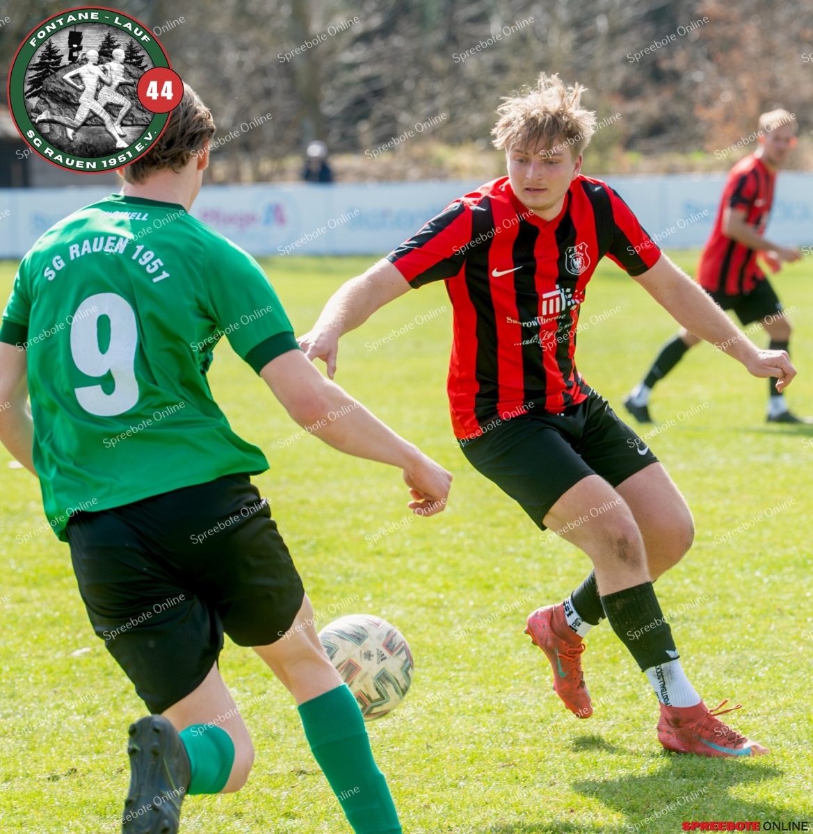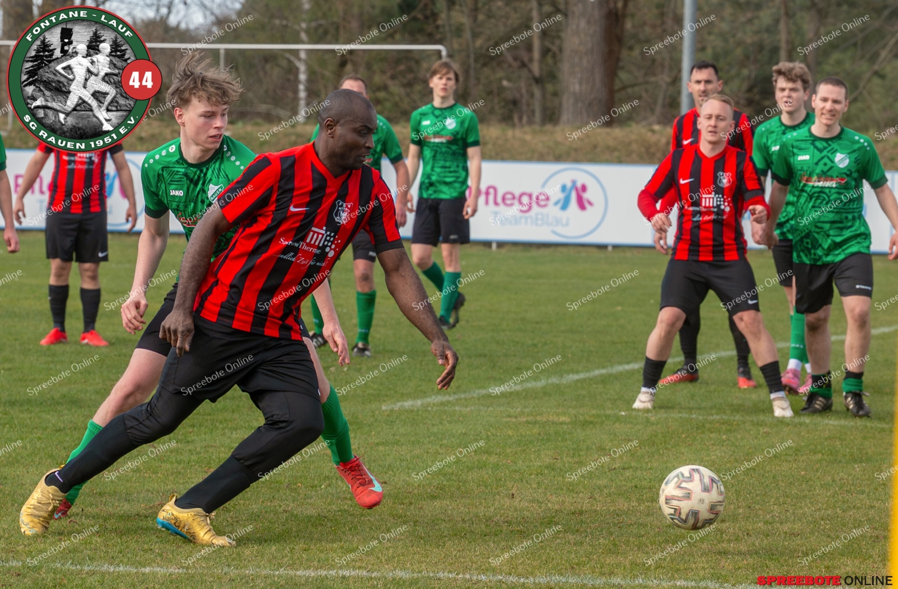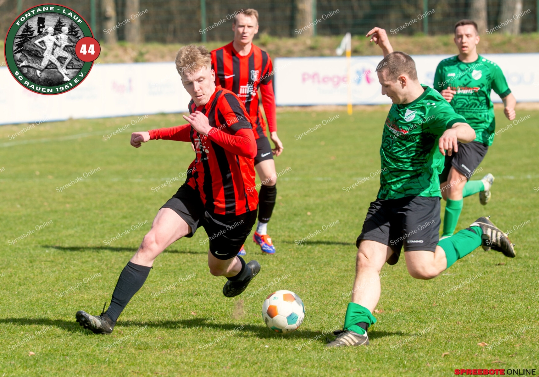 Sonntagsspiel und Kaiserwetter das ist die Kombination, die dem Fußball eine besondere Note verleiht. Alle haben Zeit, weil die meisten Spiele bereits am Samstag stattgefunden haben, so ist dieses Derby auch besonders zu bewerten. Man kennt sich ohnehin aus vielen Begegnungen, wie aus der erst kürzlich stattgefundenen Winterhallensaison. Und nun bei lockeren 10 Grad im Schatten im Stadion der SG Rauen. Große Freude herrscht, dass Florian Zinke gekommen war. Er wurde im letzten Spiel der SG Rauen verletzt, aber er wollte wie alle anderen Gäste eben dieses Derby authentisch miterleben. Die Rauener, die seit fünf Spielen ungeschlagen sind, haben einen guten Lauf, was das prognostizierte Ziel von Trainer Marcel Niespodziany und der Mannschaft ist: ein Team zu entwickeln und es zu formen, bis es mit allen Wassern gewaschen ist. Ihnen gegenüber ein ebenso schlagfertiges Preußen Bad Saarow Team, das ebenfalls seit fünf Spielen über sich hinaus wächst und sich durch die Tabelle pflügt. Das Spiel war anfangs etwas unspektakulär, da sich Rauen auf alte Taktiken zurückzog und tief in der eigenen Hälfte stand und die Preußen sich die Zähne an ihnen ausbissen. Mit hohen Bällen versuchten sie, dem Treiben der Rauener ein Ende zu setzen mit wenig Erfolg, aber dafür gefährlich im Abschluss. Mit einem Freistoß für die Preußen aus linker Position kommt der Ball gut in die Mitte vor das Tor der Rauener, es entsteht ein Gerangel, und Tim Strey macht in der 20. Minute das 0:1 für die Gäste. Für Rauen in dem Moment eine bittere Pille, aber das Spiel war noch lang.
