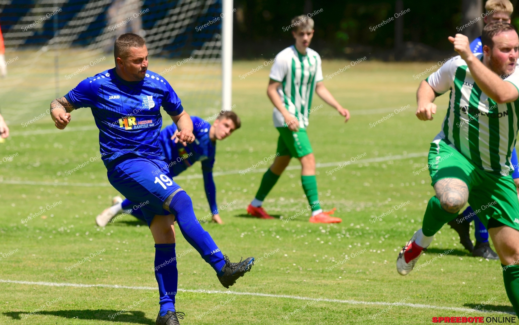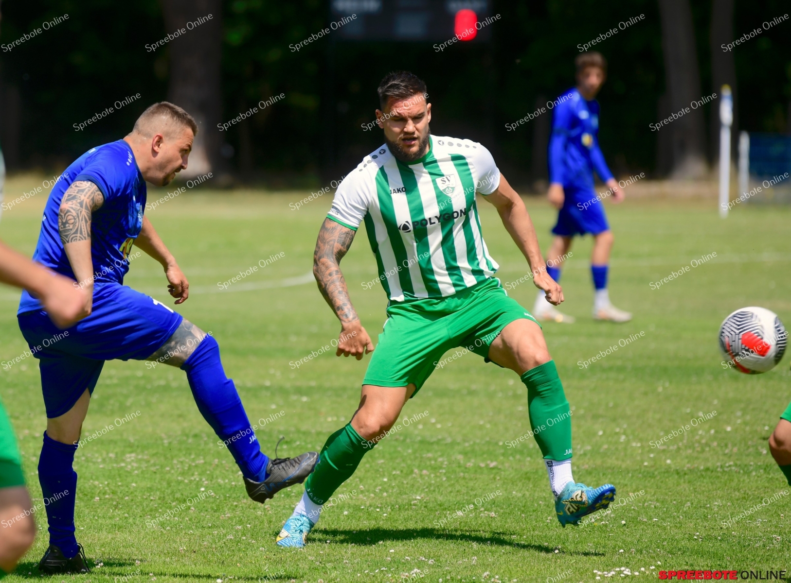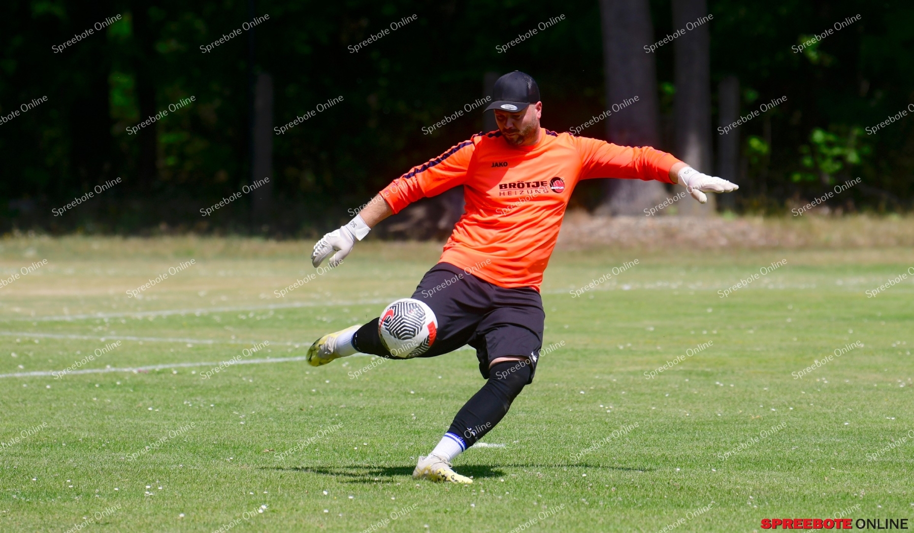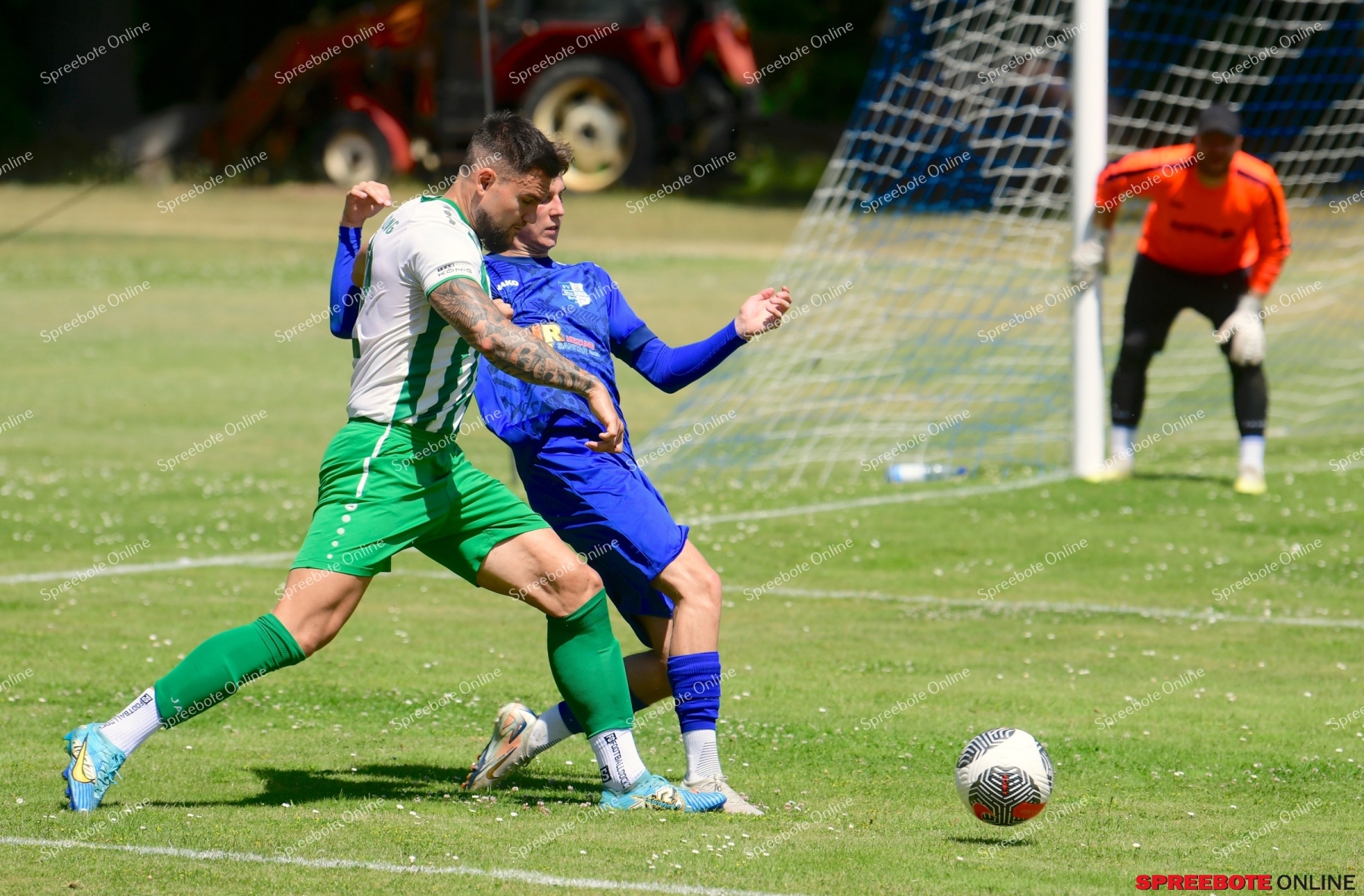 Bei brütenden 35 Grad Celsius ging’s am Samstag daheim gegen den Tabellenführer der Kreisliga Süd, den SV Vogelsang. Der kam scheinbar nur mit einer Rumpftruppe angereist und tat sich von Anfang an schwer, ins Spiel zu finden. Briesen nutzte direkt seine Chancen: Kevin Schübler behauptet sich im Zweikampf, steckt durch auf Hagen Brym – der steht frei vorm Keeper, zieht nach links ab – 1:0! Keine zwei Minuten später wird’s wieder brenzlig vorm Vogelsanger Tor. Eine unklare Situation in der Abwehr, ein Verteidiger kriegt den Ball nicht unter Kontrolle – und zack, Eigentor. 2:0 für Briesen! Der Druck bleibt hoch, Briesen kombiniert sich schnörkellos nach vorn. In der 21. Minute beinahe das 3:0. Dann ein besonderer Moment: Mike Bonack, Kapitän der Briesener Elf, macht sein letztes Spiel – nächste Saison läuft er für die AK40 auf. Er bleibt voll dabei, bekommt den Ball, passt in die Mitte auf George Krüger. Der wirkt erst irritiert, fasst sich dann aber ans Herz, zieht flach ab – durch die Abwehr hindurch, der Keeper sieht nix, alle stehen davor – und drin ist das Ding! 3:0 in der 31. Minute.