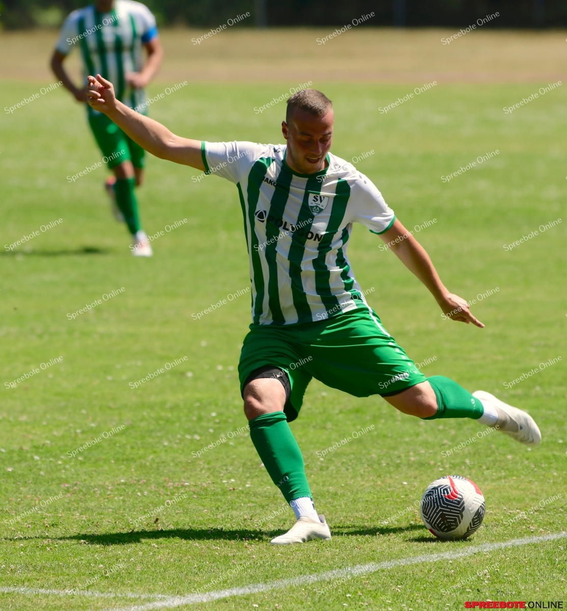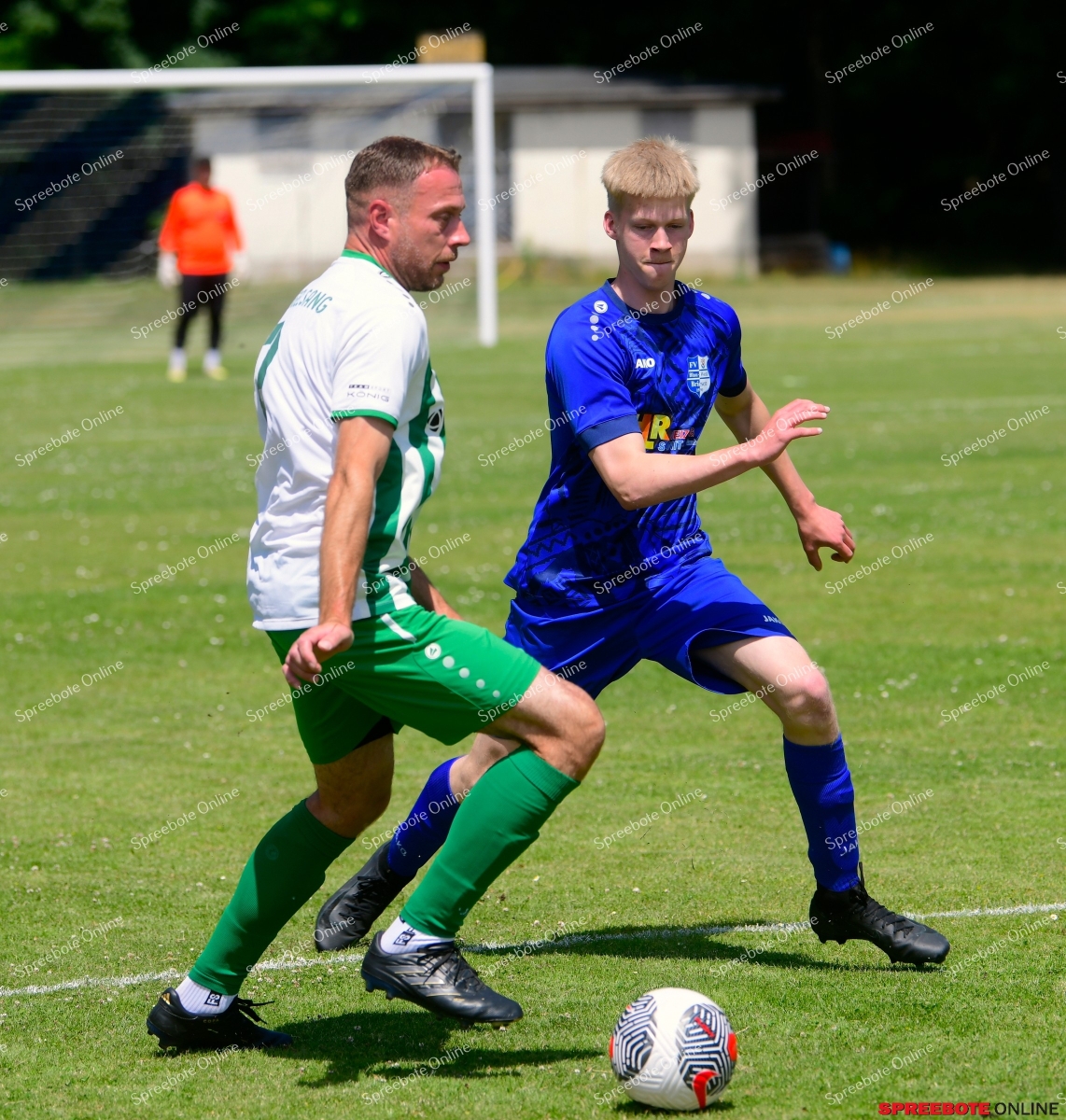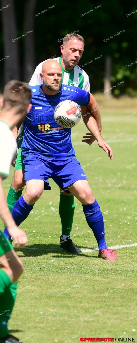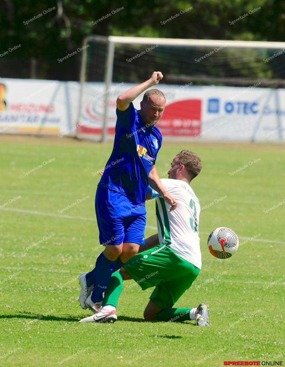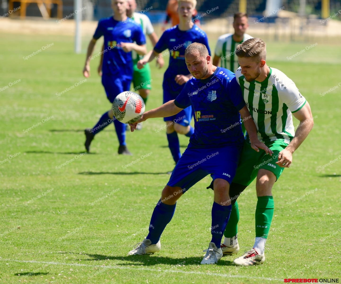 Bei brütenden 35 Grad Celsius ging’s am Samstag daheim gegen den Tabellenführer der Kreisliga Süd, den SV Vogelsang. Der kam scheinbar nur mit einer Rumpftruppe angereist und tat sich von Anfang an schwer, ins Spiel zu finden. Briesen nutzte direkt seine Chancen: Kevin Schübler behauptet sich im Zweikampf, steckt durch auf Hagen Brym – der steht frei vorm Keeper, zieht nach links ab – 1:0! Keine zwei Minuten später wird’s wieder brenzlig vorm Vogelsanger Tor. Eine unklare Situation in der Abwehr, ein Verteidiger kriegt den Ball nicht unter Kontrolle – und zack, Eigentor. 2:0 für Briesen! Der Druck bleibt hoch, Briesen kombiniert sich schnörkellos nach vorn. In der 21. Minute beinahe das 3:0. Dann ein besonderer Moment: Mike Bonack, Kapitän der Briesener Elf, macht sein letztes Spiel – nächste Saison läuft er für die AK40 auf. Er bleibt voll dabei, bekommt den Ball, passt in die Mitte auf George Krüger. Der wirkt erst irritiert, fasst sich dann aber ans Herz, zieht flach ab – durch die Abwehr hindurch, der Keeper sieht nix, alle stehen davor – und drin ist das Ding! 3:0 in der 31. Minute.