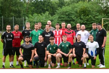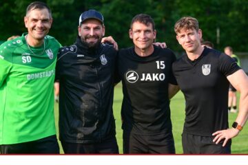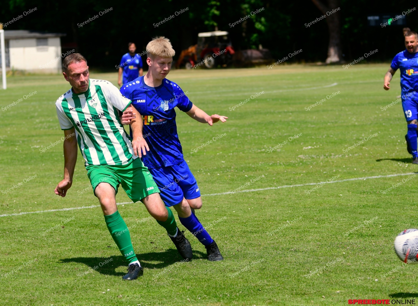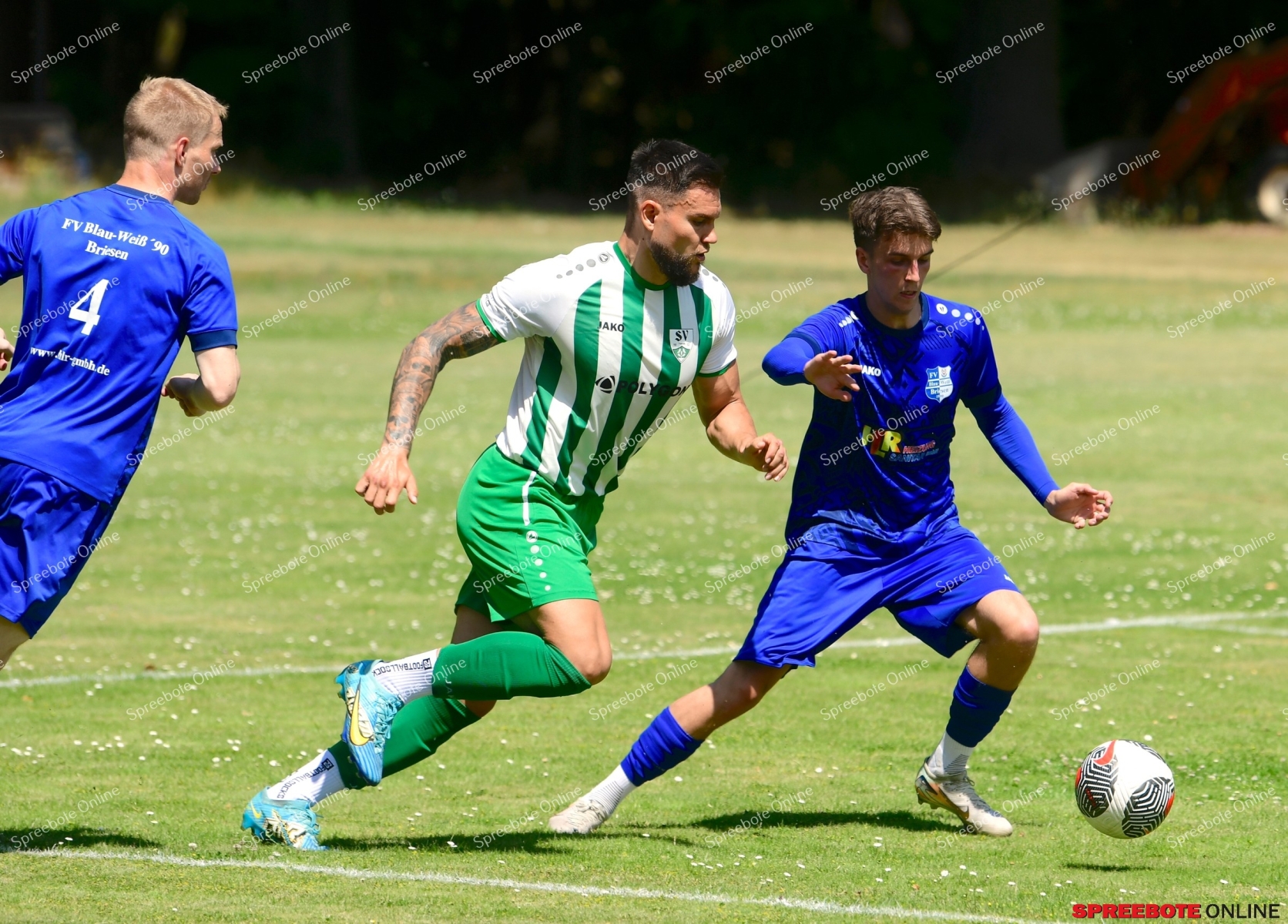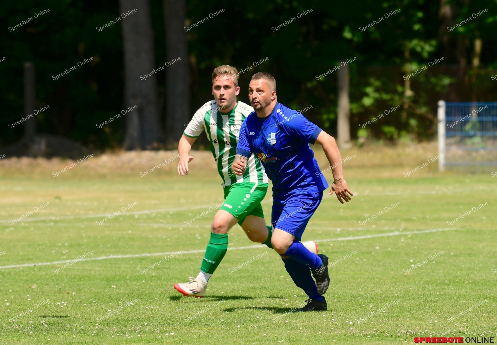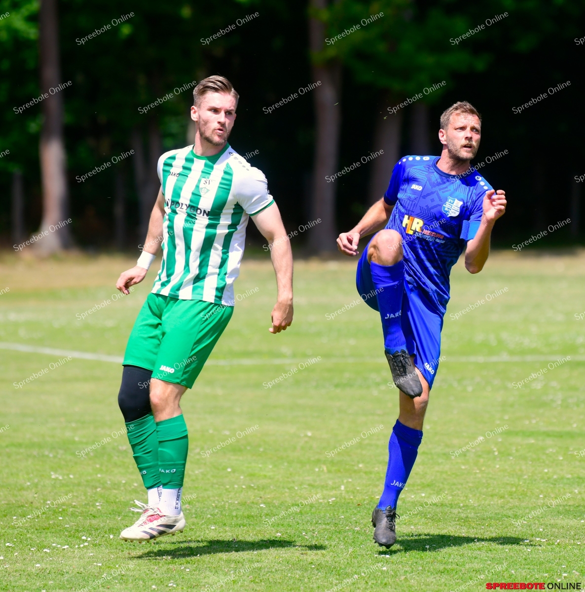 Bei brütenden 35 Grad Celsius ging’s am Samstag daheim gegen den Tabellenführer der Kreisliga Süd, den SV Vogelsang. Der kam scheinbar nur mit einer Rumpftruppe angereist und tat sich von Anfang an schwer, ins Spiel zu finden. Briesen nutzte direkt seine Chancen: Kevin Schübler behauptet sich im Zweikampf, steckt durch auf Hagen Brym – der steht frei vorm Keeper, zieht nach links ab – 1:0! Keine zwei Minuten später wird’s wieder brenzlig vorm Vogelsanger Tor. Eine unklare Situation in der Abwehr, ein Verteidiger kriegt den Ball nicht unter Kontrolle – und zack, Eigentor. 2:0 für Briesen! Der Druck bleibt hoch, Briesen kombiniert sich schnörkellos nach vorn. In der 21. Minute beinahe das 3:0. Dann ein besonderer Moment: Mike Bonack, Kapitän der Briesener Elf, macht sein letztes Spiel – nächste Saison läuft er für die AK40 auf. Er bleibt voll dabei, bekommt den Ball, passt in die Mitte auf George Krüger. Der wirkt erst irritiert, fasst sich dann aber ans Herz, zieht flach ab – durch die Abwehr hindurch, der Keeper sieht nix, alle stehen davor – und drin ist das Ding! 3:0 in der 31. Minute.