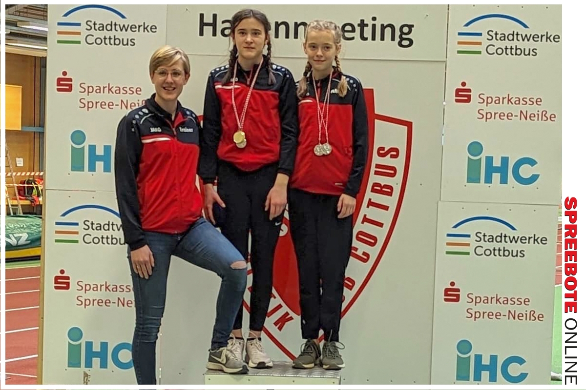 Das neue Jahr 2023 begann traditionell mit dem deutsch-polnischen Hallenmeeting in Cottbus, bei dem die beiden U14er Mädchen der SG Gaselan aus Fürstenwalde, Anny Sosnowsky und Anni Melchert, antraten. Und die beiden jungen Talente konnten erneut die vorderen Plätze belegen und sogar einen Meeting-Rekord aufstellen. Anni Melchert (W12) konnte sowohl im 60m-Sprint, als auch im Weitsprung die Silbermedaille gewinnen. Auf der Sprint Strecke blieb sie sowohl im Vorlauf als auch im Finale unter der 9-Sekunden Marke (8,95 sek & 8,97 sek), was für den Jahresbeginn sehr gut ist. Beim Weitsprung musste sie erstmals vom Brett und nicht mehr aus der Zone springen, was ihr gut gelang, denn sie belegte mit 4,12 m den zweiten Platz. Ihre Trainingskollegin Anny Sosnowsky (W13) konnte bereits zu Anfang des Wettkampftages einen tollen Erfolg feiern: Mit 9,67 m im Kugelstoßen erreichte sie eine neue persönliche Bestleistung und einen neuen Meeting-Rekord, wofür es eine besondere Medaille gab. Im anschließenden Weitsprung konnte sie ebenfalls eine neue Bestleistung aufstellen, wenn auch nur um 1 cm (4,87 m). In dieser Saison möchte sie zum ersten Mal über die 5,00 m hinausspringen, wofür sie weiterhin 3x/Woche fleißig trainiert. An Schnelligkeit fehlt es ihr nicht und das bewies sie im 60 m-Sprint. Während sie im Vorlauf noch 8,60 sek lief, konnte sie sich im Finale auf sehr gute 8,43 sek verbessern und hatte somit einige Meter Vorsprung vor ihrer Konkurrentin aus Polen, die mit 8,64 sek Zweite wurde. Der abschließende 800m Lauf diente als Training für die anstehenden Mehrkampf-Meisterschaften im Februar, welche am selben Ort stattfinden werden. Sie teilte sich den Lauf gut ein und belegte mit 2:39 min den 2. Platz. Für eine Goldmedaille bei den Meisterschaften (Sprint, Weit, 800m) wird sie die Leistungen nochmals abrufen müssen oder teils sogar etwas verbessern, denn ab der Altersklasse 13 kommt die Konkurrenz nicht nur noch aus traditionellen Sportvereinen, sondern auch von Sportschulen. Wir drücken die Daumen, dass sie ihre angestrebten Ziele in diesem Jahr erreichen wird und sich weiterhin über Bestleistungen, Medaillen und Meister-Titel freuen kann.