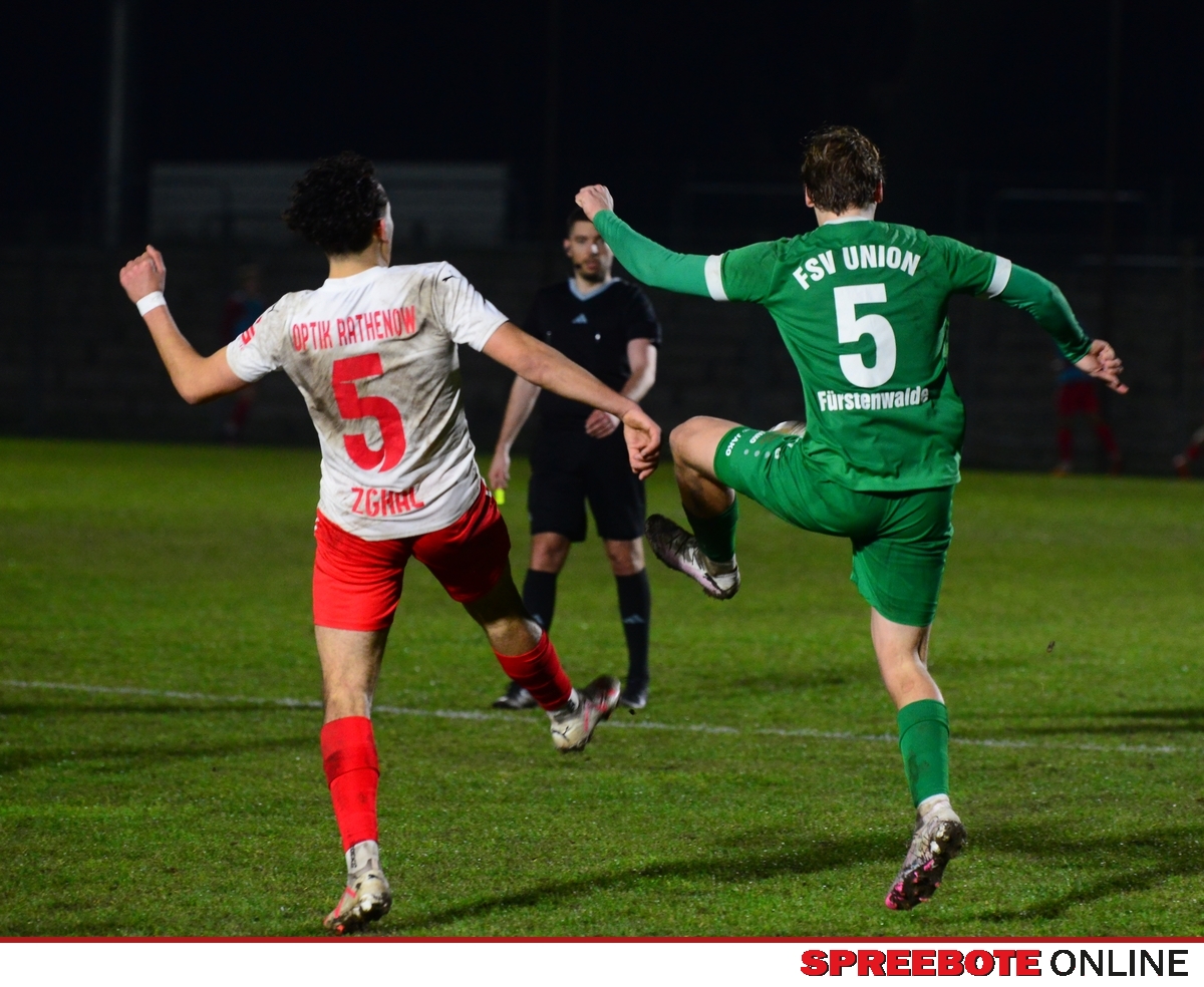 Am Freitagabend zum Flutlichtspiel empfing im Rahmen des 21. Spieltages der Oberliga Nord des NOFV der FSV Union Fürstenwalde im Friesenstadion die Mannschaft des FSV Optik Rathenow. Im Hinspiel (17.9.2023) siegten die Optiker klar mit 4:1. In der 2. Runde um den Brandenburg – Pokal am 3.Oktober 2023 hatten dann die Unioner die Optiker zu Gast und auch in diesem Vergleich in Fürstenwalde siegten die Optiker deutlich mit 5:0 und zogen eine Runde weiter im Pokal. Nun bereits der dritte Vergleich zwischen beiden Mannschaften in dieser Saison und auf Grund der bisherigen Ergebnisse und des aktuellen Tabellenplatzes (Optik 11.,Union 15.) gingen die Rathenower als Favorit in diese Partie, welche vom Schiri Göldner aus Bad Saarow vor 146 zahlenden Zuschauern und weiteren Beobachtern geleitet wurde. Während die Unioner unbedingt einen Sieg im Abstiegskampf benötigten wollten die Optiker mit einem Sieg den Abstand zu den Abstiegsrängen vergrößern. Der Altmeister an der Seitenlinie Ingo Kahlisch, inzwischen über 30 Jahre Cheftrainer in Rathenow, hatte seine Mannen entsprechend eingestellt, was sich dann auch gleich in den Anfangsminuten auf dem Platz zeigte. Bereits nach einer Minute gingen die Optiker durch Shai Santino Neol mit 1:0 in Führung. Aus dem Strafraumgewühl erzielte er aus Nahdistanz den Treffer. Die Unioner scheinbar noch nicht wach verpassten die Klärung. In der 5. Minute griffen die Unioner erneut nicht rechtzeitig ein, so das Optik Kapitän Jerome Liroy aus etwa 20 Metern unbedrängt den Treffer zum 2:0 für Rathenow erzielen Konnte. Nach diesem zeitigen Rückstand (nicht das erste Mal) erwachten nun wohl die Unioner und hielten dagegen. Ihre Chancen in der 8. Minute (Kai Kai) und dann Doppelt in der 35. Minute(Kriem) führten nicht zum Torerfolg. In der 44. Minute dann Sosnowski per Kopfball und Kriem im Nachschuss, aber Optik Keeper Simeon Hawwary fischte das Leder noch aus das obere Tordreieck und verhinderte somit die Riesenchance zum Union Anschlusstreffer. In der zweiten Halbzeit sahen die Zuschauer eine ausgeglichene Partie, wobei die Unioner erneut Kampfgeist zeigten aber die Optiker kontrolliert im Spiel agierten. In der 69. Minute dann das Tor zum 3:0 für Rathenow. Nach zu kurzer Abwehr durch Kai Kai und dann Fehlpass genau auf den Fuß vom Torschützen, erzielte der eingewechselte Kabuja Tshilumba das Tor unbedrängt wieder aus Nahdistanz für Optik. Ein kurzes Aufbäumen der Unioner brachte in der Schlussphase noch zum 1:3 den Anschlusstreffer (88.) durch den eingewechselten Umran Saied für Union. Nach dem Schlusspfiff (90+5) gingen die Optiker mit 3:1 als verdienter Sieger vom Platz. Die Unioner konnten nichts Zählbares für den Klassenerhalt erkämpfen. Nun bietet sich für sie die nächste Chance im Spiel bei Anker Wismar. Es folgen dann zwei Heimspiele gegen Lichtenberg (47 und Sparta).
