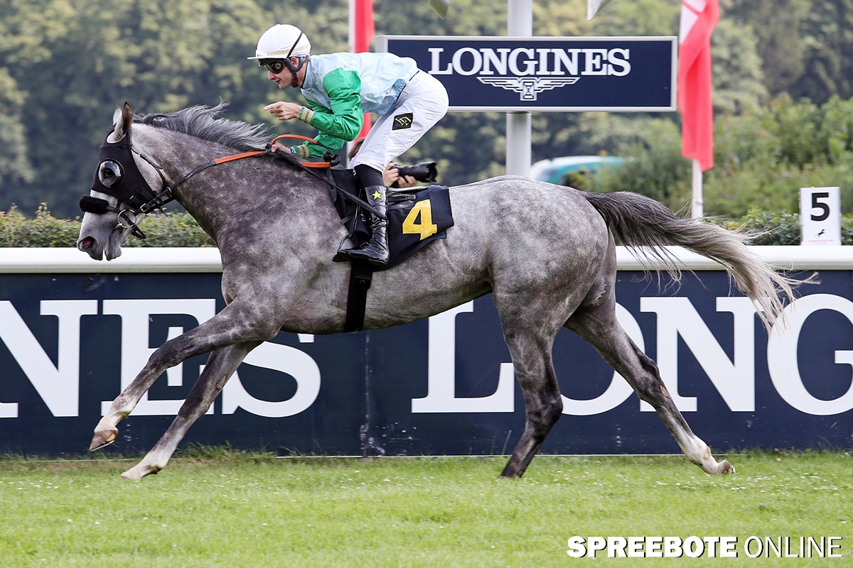 | Der französische Jockey Lukas Delozier hat nach einem gut eingeteilten Ritt mit dem vierjährigen Schimmelhengst Quian als Mitfavorit (mit einer Siegquote von 3:1) den Hoppegartener Steher-Preis gewonnen. Das Duo überquerte am Sonntag mit leicht mit zweieinhalb Längen Vorsprung das Ziel vor der unentwegt angreifenden Favoritin Ida Alata unter Andrasch Starke (Siegquote 2,5:1). Den dritten Platz in dem mit 12.500 EUR dotierten und über 2.800 Meter führenden Steherrennen sicherte sich Bauyrzhan Murzabayev mit der auf der Zielgeraden zeitig vorn liegenden All for Rome. „Quian wird immer besser,“ freute sich Trainer Peter Schiergen aus Köln und gab zu verstehen: „Der Sieg hat viel Eindruck hinterlassen, und mein Pferd sollte auf langen Distanzen noch einiges zu bieten haben.“ Quian gehört dem Stall Hornoldendorf. Erstmals in dieser Saison durften wieder Zuschauer auf die Rennbahn Hoppegarten. Insgesamt 1.000 Personen waren anwesend, 750 zahlende Zuschauer sowie 250 Besitzer, Offizielle und Mitarbeiter. Bei den elf Rennen an diesem Renntag gab es sechs lokale Sieger. Die Trainer Jan Korpas (mit Killerbiene und Blue Dream) sowie Roland Dzubasz (mit Valanca und Tansania) waren je zweimal erfolgreich. Eva Fabianova (mit Fascinating Lips) und Friederike Schloms (mit Gina’s Flight) feierten je einen Sieg. Einen besonderen Tag in Hoppegarten verlebte Füchse-Manager Bob Hanning. Zusammen mit Rennbahn-Eigentümer Gerhard Schöningh gab er als Mitbesitzer von Drux the King sein Galoppsportdebüt als Besitzer. Der dreijährige Vollblut-Wallach, benannt nach Handball Nationalspieler Paul Drux, stellte beim ersten Start seines Lebens mit einem vierten Platz sein Umfeld zufrieden. Bob Hanning strahlte: “Ich bin überglücklich, dass er seine Sache so gut gemacht hat. Ein tolles Pferd, und dass ich als Besitzer dabei sein kann ist super. Er ist kein frühes Pferd und wird sich bald steigern.“ |