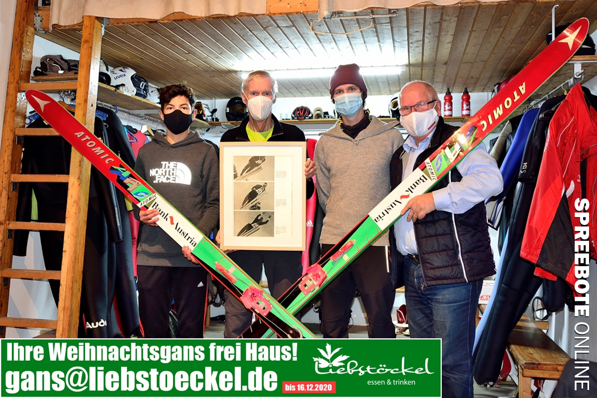 | Der Bote war wegen Corona Dr. Gunter Frenzel, der die insgesamt 5 Tafeln mit den offiziellen Plakaten der Olympischen Winterspiele und dazu noch zwei Erinnerungsfotos von den Spielen 1960 in Squaw Valley im Namen von Helmut Recknagel aus dessen reicher Trophäensammlung an den Wintersportverein 11923 Bad Freienwalde e.V. übergab. In Squaw Valley konnte Helmut Recknagel vor 60 Jahren den ersten deutschen Olympiasieg im Skispringen erkämpfen. Als Zugabe gab es noch ein Paar Sprungski von Heinz Kuttin, dem zweifachem Skisprungweltmeister aus Österreich. Der Österreicher trainierte die polnische Nationalmannschaft und war Österreichs Cheftrainer. Seit 2020 ist er Sprungtrainer der deutschen Nordisch-Kombinierer.