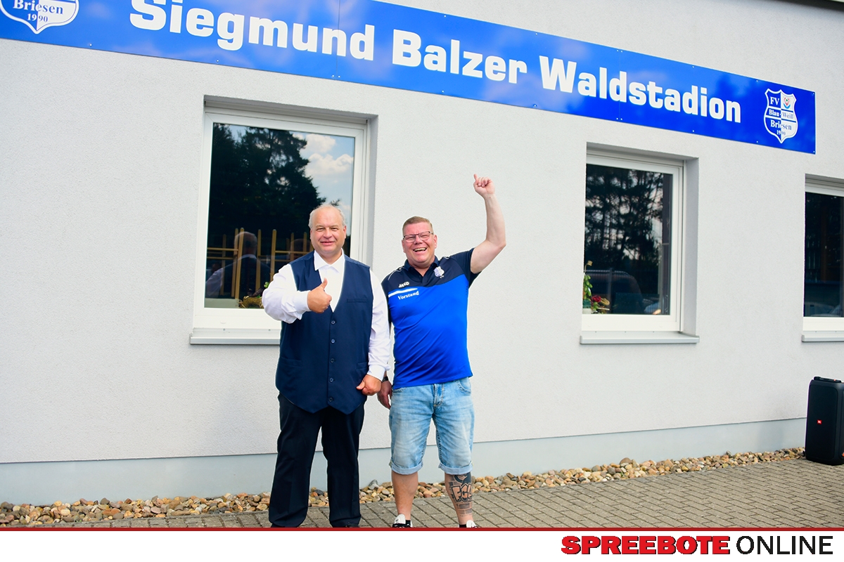 Die Fußballsaison 2023/24 hat begonnen und zum Auftaktspiel in der Landesklasse Ost kam am Samstag die SG Müncheberg nach Briesen. Doch zuvor wurde das einstige Waldstadion in eine feierliche Zeremonie umbenannt. Patrick Sauer, Geschäftsführer des Vereins, ging auf das Leben und Wirken des einstigen Ehrenpräsident Siegmund Balzer ein und enthüllte mit Sohn Mario Balzer den neuen Namenszug des Waldstadions, das nun Siegmund-Balzer-Waldstadion heißt.