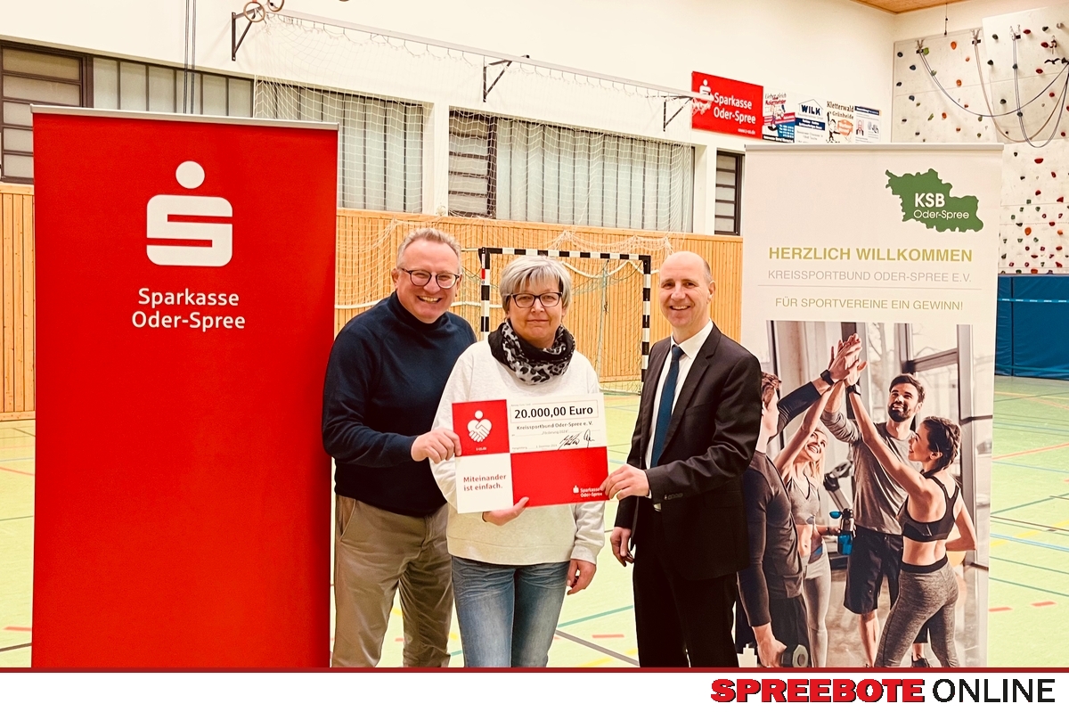 Im Versammlungsraum der Müggelspreehalle in Hangelsberg erfolgte die Übergabe der Sparkassenförderung für das Jahr 2024. Symbolisch überreicht wurde sie von Gil Pönitzsch, Direktor für Privatkunden bei der Sparkasse Oder- Spree, an den Vereinsvorsitzenden Jörg Fiedler und die Geschäftsführerin Anke Smuzinski. Wir freuen uns sehr, dass die Sparkasse Oder-Spree ihre Förderung auch dieses Jahr fortsetzt. Somit blicken wir auf eine insgesamt 33-jährige Zusammenarbeit mit der Sparkasse zurück. so Jörg Fiedler. Im Jahr 1992 schlossen die damalige Kreissparkasse Fürstenwalde und der Kreissportbund Fürstenwalde e. V. erstmalig eine Vereinbarung zur Förderung des Breitensports. Diese wurde 1994 nach der Fusion der Sparkassen Beeskow, Fürstenwalde und Eisenhüttenstadt auf den Landkreis Oder-Spree übertragen.