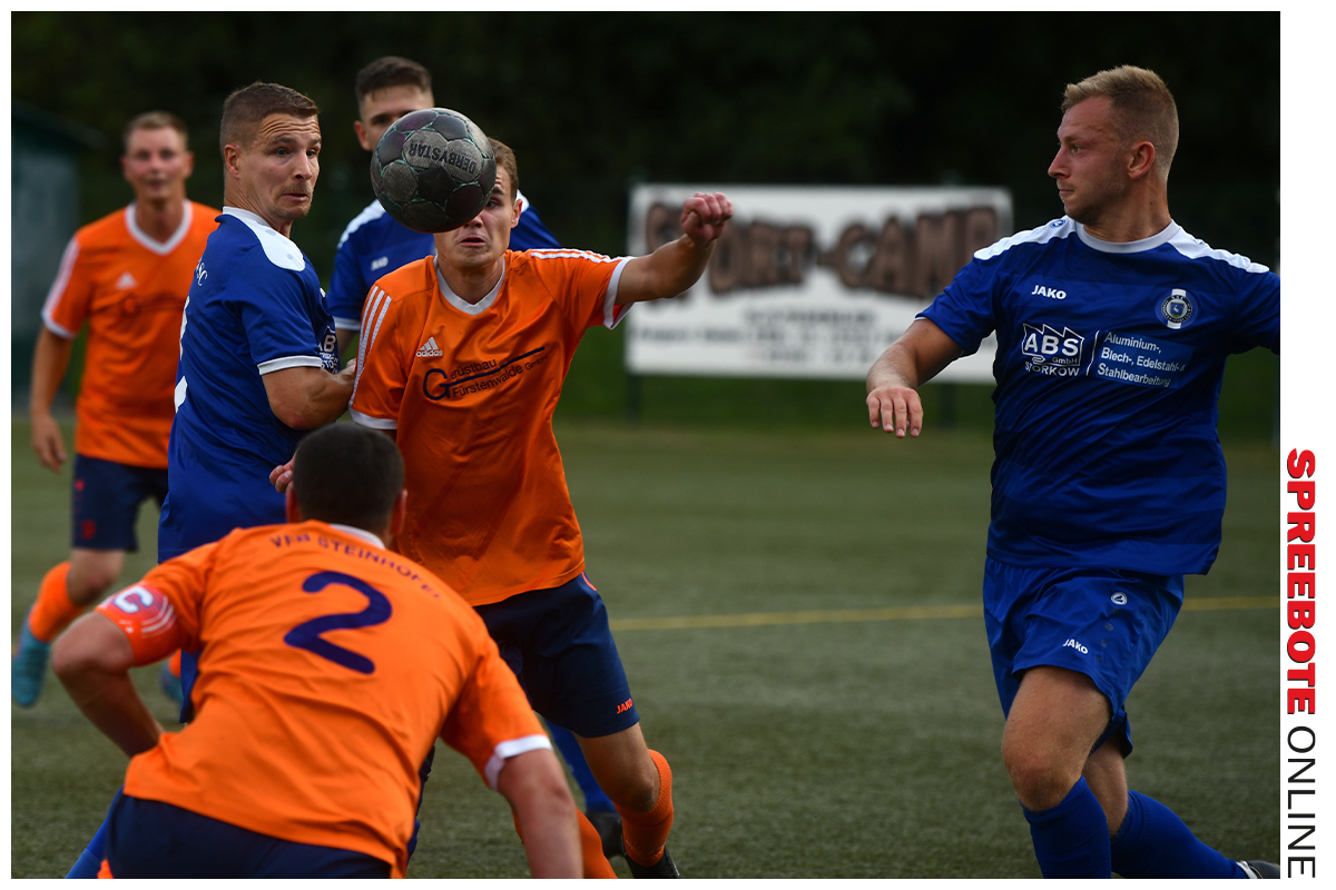 Die Gefühle waren am Samstagnachmittag mindestens genauso wechselhaft wie das Wetter. Doch dass die Partie zwischen dem VfB Steinhöfel und dem Storkower SC spannend wird, das war aus der Vergangenheit schon abzusehen. Der VfB startete mit viel Schwung in die neue Saison der Kreisoberliga, besiegte man doch eben erst den Absteiger aus der Landesklasse. Der Sportclub aus Storkow taumelte etwas zu Beginn der Saison. Nichtsdestotrotz schreibt der Pokal seine eigene Geschichte und für die 85 angereisten Zuschauer versprach das ein spannendes Spiel zu werden. Kurz nach Anpfiff spürte man sofort – beide Mannschaften wollten den Sieg und somit auch eine Runde im Ostbrandenburgpokal weiterkommen. Die ersten Minuten brauchte vor allem der VfB, um in die Partei zu finden, was der Torjäger Patrick Sergel in der 10. Minute gnadenlos ausnutze und den Storkower SC in Führung brachte. Doch die Steinhöfler steckten den Kopf nicht in den Sand und spielten nun mit sehr viel Selbstbewusstsein und Willen in Richtung Storkower Tor. Und so folgte in der 21. Spielminute der Ausgleich durch Danilo Blank für den VfB. Plötzlich war die Partie geprägt durch den VfB, der sich immer wieder in die gegnerische Hälfte begab. Ein Foul an der Strafraumkante und der präzise geschossene Freistoß durch Danilo Blank brachten den VfB nur 7 Minuten nach dem Ausgleich in Führung und die Heuwegarena bebte. Doch die Storkower zeigten sich wenig beeindruckt & signalisierten, dass man nicht mit einem Rückstand in die Kabine gehen will. Und so glich Mathias Reischert in der 42. Spielminute ebenfalls per Freistoß zum 2:2-Halbzeitstand aus. Nachdem sich die Zuschauer gestärkt und die Mannschaften neu motiviert hatten, pfiff der Schiedsrichter Holger Mattern die Partie pünktlich nach der Pause erneut an. Beide Mannschaften kamen mit absolutem Siegeswillen zurück auf den Platz und man spürte die Anspannung, denn jeder wollte den Siegtreffer erzielen. Dies führte dazu, dass die Partie nahezu ausgeglichen blieb, wobei beide Mannschaften ihre Momente vorm Tor hatten. Nur bis dato landetet kein Ball im Netz, wodurch es ganz danach aussah, als würden beide Mannschaften in die Verlängerung gehen. Doch der Storkower SC hatte andere Pläne und übte die letzten 10 Minuten einen unfassbaren Druck auf die Steinhöfler Mannschaft aus, so dass diese stark ins Taumeln geriet. Durch einen Fehler und das daraus resultierende Eigentor ging der Sportclub erneut in Führung und das nur sechs Minuten vor Ende der regulären Spielzeit. Die Männer des VfB mobilisierten nochmal alle Kräfte, um es doch noch in die Verlängerung zu schaffen, aber es blieb beim 2:3-Endstand.