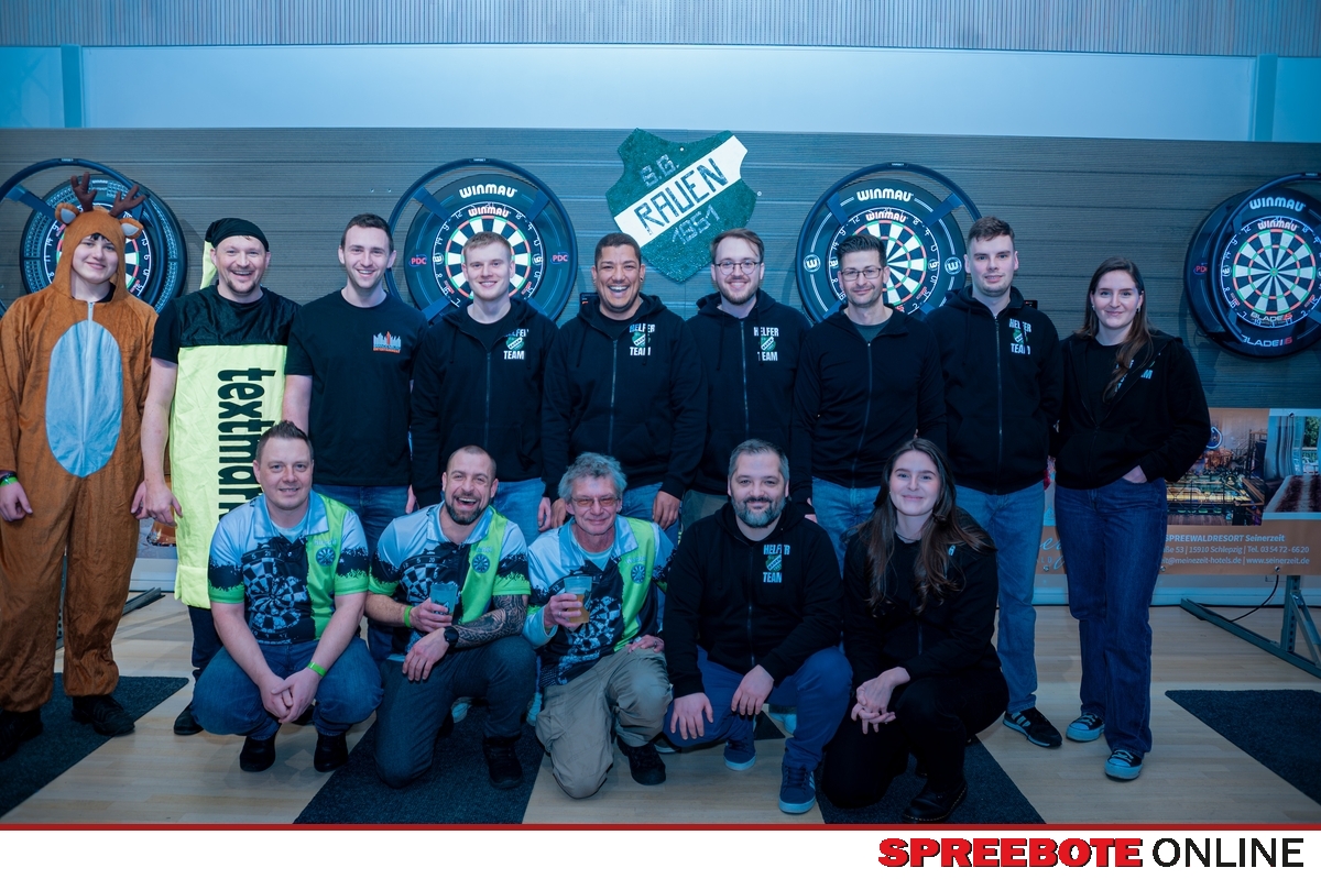 Im letzten Jahr war das Turnier gut nachgefragt, aber es gab ein paar Unwägbarkeiten, die sich in diesem Jahr nicht wiederholen sollten. „Das ist halt Lehrgeld“, erklärt Nico Matschke, Cheforganisator der Rauen-Darts Championship. Letztes Jahr hatten wir erst um 18 Uhr begonnen und waren völlig geplättet, als die Siegerehrung erst um Mitternacht stattfinden konnte. Dieses Mal sollte alles anders laufen, auch mit einer neuen Konstellation. Gemeinsam wurde ein Plan erstellt und beschlossen, das Turnier früher zu starten. Darum begann es am Nachmittag, sodass anschließend bei der Aftershowparty noch genügend Zeit bleiben sollte, den Sieg gebührend zu feiern. Und wie im letzten Jahr hat sich die Idee, im Kostüm zum Turnier zu erscheinen, schon recht gut durchgesetzt. Zum Abend hin gab es dann noch die Abstimmung zum schönsten Kostüm. Das Bürgerhaus wurde bewusst gewählt, wegen des großen Saales, „Man ist da nicht so eingeengt“, erklärt Nico. In Anlehnung an das legendäre Ally Pally in England wurde der Saal so eingerichtet, dass die Gäste an langen Tafeln ausreichend Platz hatten und die Darter ebenfalls genug Raum, um ihre Pfeile fliegen zu lassen. Für die optimale Sicht wurde zusätzlich zwei große Monitore angebracht, damit die Gäste auch in den hinteren Reihen alles bestens verfolgen konnten. Eine weitere Neuerung sind die automatisch rückwärtszählenden Rechner an den Dartscheiben, eine enorme Erleichterung für die Spieler. Außerdem gab es im Steeldarts-Bereich neue Features, begleitet von einem Live-Moderator, der die Gäste über alles Wichtige informierte. Und nicht zu vergessen ein großes Dankeschön an die zahlreichen Helfer und Unterstützer, die dafür gesorgt haben, dass das Turnier mit 32 Startern reibungslos und professionell ablief. Es ist geplant, so Matschke, die Rauen-Darts Championship weiter auszubauen und immer wieder neue Features einzuführen.