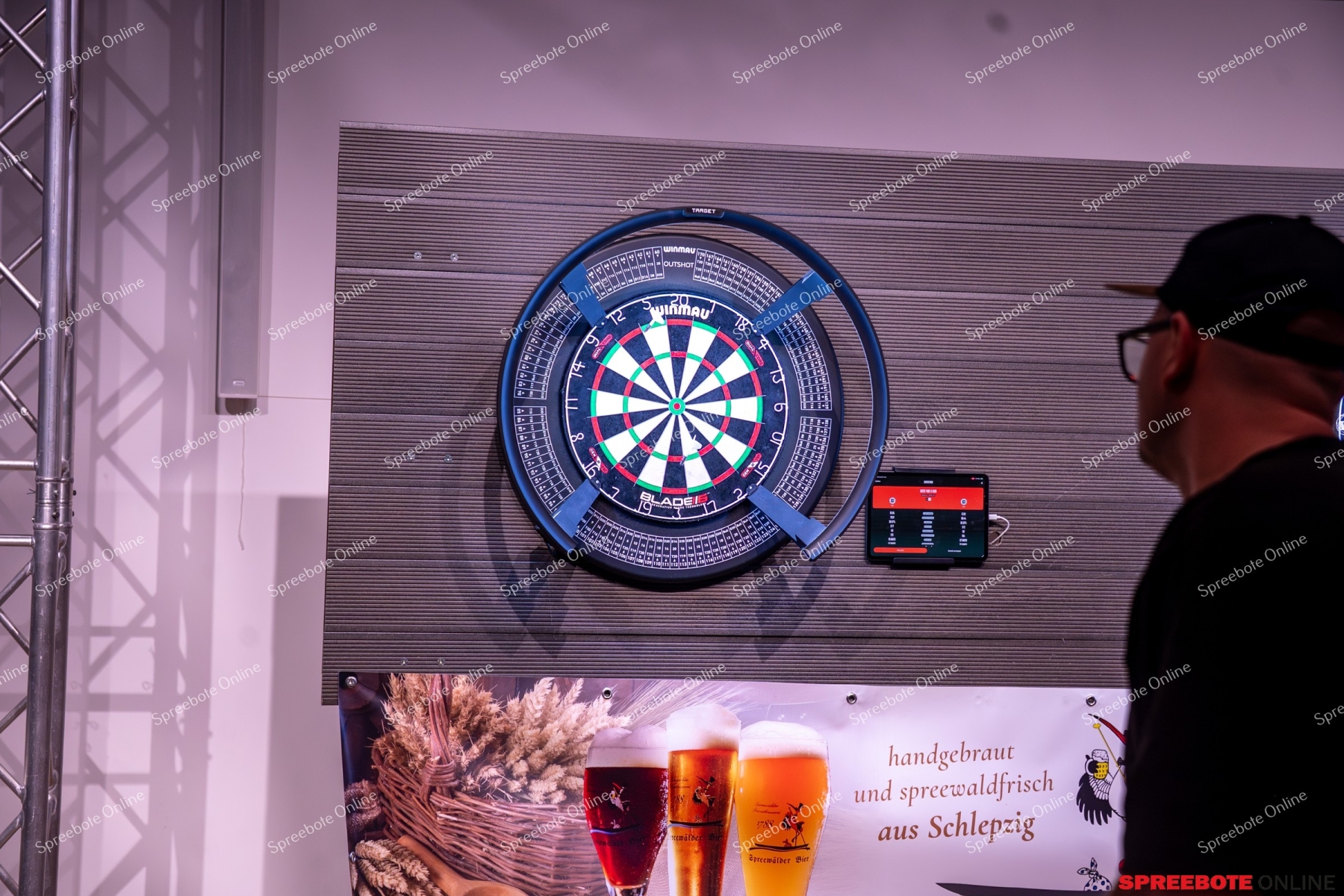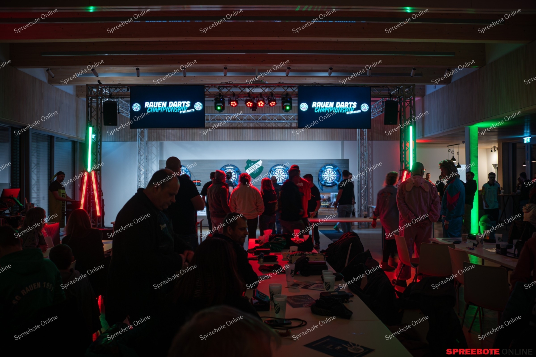 Im letzten Jahr war das Turnier gut nachgefragt, aber es gab ein paar Unwägbarkeiten, die sich in diesem Jahr nicht wiederholen sollten. „Das ist halt Lehrgeld“, erklärt Nico Matschke, Cheforganisator der Rauen-Darts Championship. Letztes Jahr hatten wir erst um 18 Uhr begonnen und waren völlig geplättet, als die Siegerehrung erst um Mitternacht stattfinden konnte. Dieses Mal sollte alles anders laufen, auch mit einer neuen Konstellation. Gemeinsam wurde ein Plan erstellt und beschlossen, das Turnier früher zu starten. Darum begann es am Nachmittag, sodass anschließend bei der Aftershowparty noch genügend Zeit bleiben sollte, den Sieg gebührend zu feiern. Und wie im letzten Jahr hat sich die Idee, im Kostüm zum Turnier zu erscheinen, schon recht gut durchgesetzt. Zum Abend hin gab es dann noch die Abstimmung zum schönsten Kostüm. Das Bürgerhaus wurde bewusst gewählt, wegen des großen Saales, „Man ist da nicht so eingeengt“, erklärt Nico. In Anlehnung an das legendäre Ally Pally in England wurde der Saal so eingerichtet, dass die Gäste an langen Tafeln ausreichend Platz hatten und die Darter ebenfalls genug Raum, um ihre Pfeile fliegen zu lassen. Für die optimale Sicht wurde zusätzlich zwei große Monitore angebracht, damit die Gäste auch in den hinteren Reihen alles bestens verfolgen konnten. Eine weitere Neuerung sind die automatisch rückwärtszählenden Rechner an den Dartscheiben, eine enorme Erleichterung für die Spieler. Außerdem gab es im Steeldarts-Bereich neue Features, begleitet von einem Live-Moderator, der die Gäste über alles Wichtige informierte. Und nicht zu vergessen ein großes Dankeschön an die zahlreichen Helfer und Unterstützer, die dafür gesorgt haben, dass das Turnier mit 32 Startern reibungslos und professionell ablief. Es ist geplant, so Matschke, die Rauen-Darts Championship weiter auszubauen und immer wieder neue Features einzuführen.