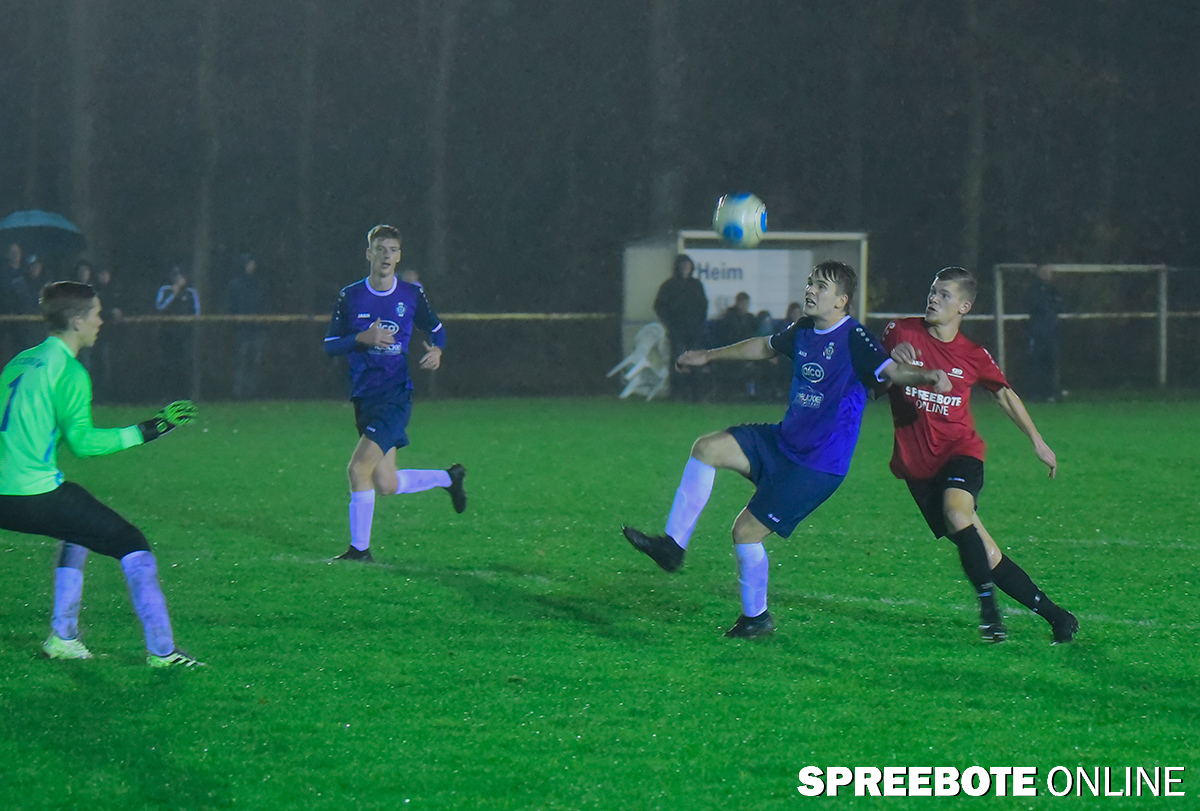 | Nach dem die U19 der BSG Pneumant Anfang Oktober den SV Lausitz/Forst mit 3:1 im heimischen PneumantSportForum besiegen konnte, war sie jetzt umso mehr motiviert, ihren Siegeszug weiter in der Tabelle voranzutreiben. Freitagabend, bei anfänglich noch halbwegs normaler Wettertätigkeit, ging das Spiel unter Flutlicht in Alt-Stahnsdorf pünktlich los. In den Anfangsminuten spielte die U19 mutig auf und versuchte, den Gegner schon in ihrer eigenen Hälfte beim Spielaufbau unter Druck zu setzen. Dies gelang sehr gut, so dass bereits in der 23. durch eine Balleroberung auf der Außenbahn Pneumant mit 1:0 in Führung gehen konnte. Der Storkower SC war nun geweckt und versuchte seinerseits, ebenfalls mit mehr Druck zu agieren. Durch einen Abwehrfehler der Pneumanter schafften sie es in der 40. Minute, den Ausgleich herzustellen. Die Regentätigkeit nahm indes stark zu, aber die mitgereisten Fans auf beiden Seiten bekamen willensstarke Spielszenen zu sehen. Kurz vor der Halbzeit war es dann Leon Drewitz, der einen Freistoß aus gut 40m direkt und sehenswert verwandelte. Die Mannschaft ging mit einem guten Gefühl in die Pause. Dort wurden nochmal Fehler besprochen und den Jungs Mut gemacht, ihren Leistungswillen weiter abzurufen.