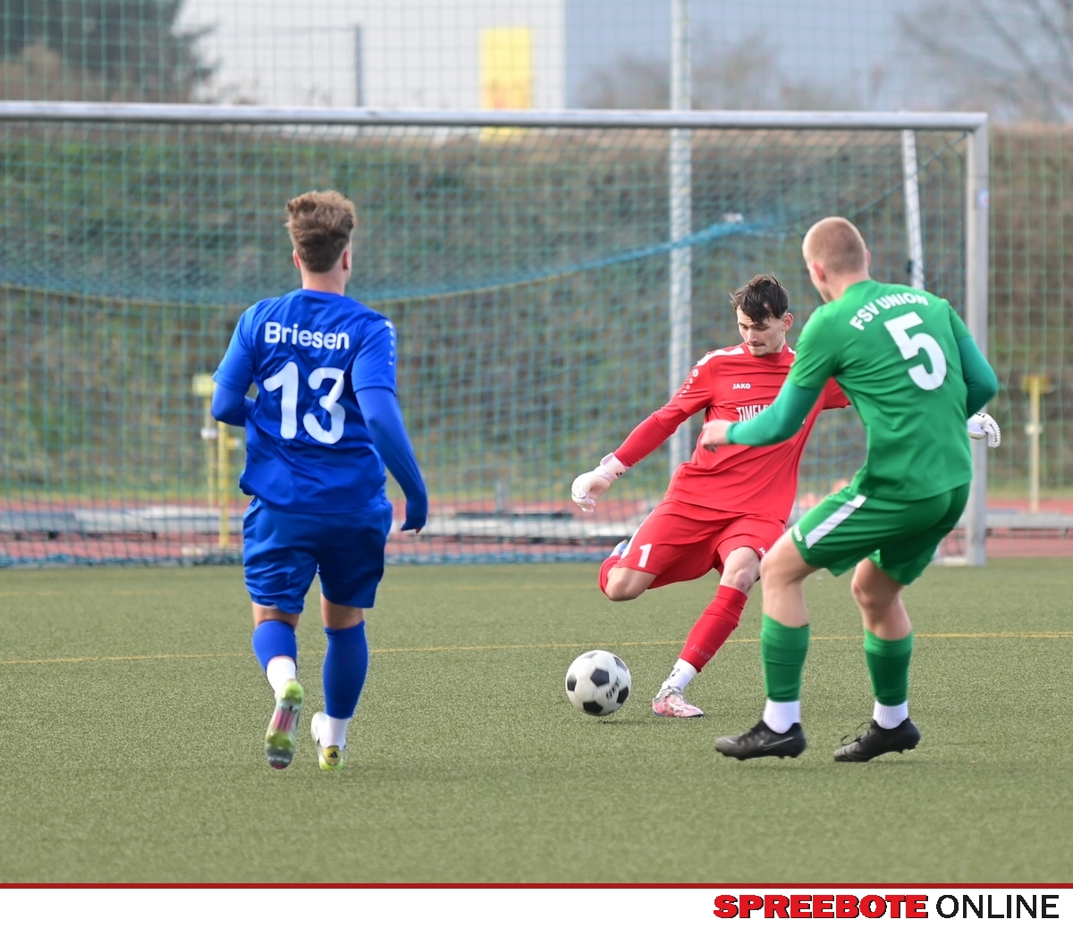Als Gegner stand die Landesklassenmannschaft des FV Blau-Weiß Briesen mit auf dem Platz. Das Trainerduo Weber/Zimmermann hatte zwar nicht alle Spieler des Teams mit an Bord (auf Grund der Winterferien), aber trotzdem eine spielstarke Mannschaft aufgeboten, wie es sich dann im Verlaufe der Partie zeigte. Couragiert und mit wenig Respekt gingen die Union Junioren gegen den eigentlichen Favoriten von Beginn an zu Werke und dann auch in der 20. Minute durch ihr offensiv geführtes Spiel durch Mathias Michael mit 1:0 nicht unverdient in Führung.
