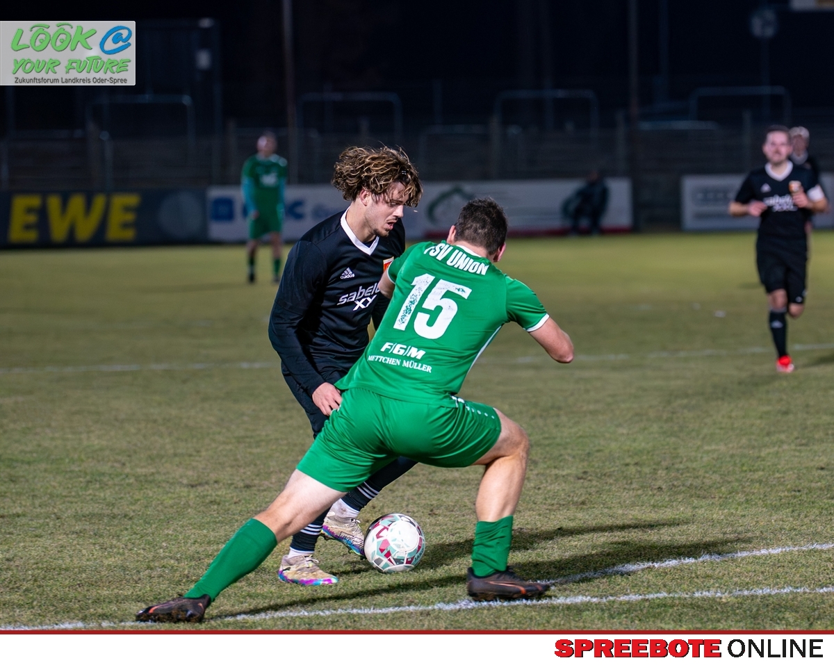 Planmäßig mit dem 16. Spieltag begann am vergangenen Wochenende die Rückrunde der Saison 2025/26 in der Brandenburger Fußballliga. Demgegenüber waren ja in der Regionalliga Nordost die ersten vier angesetzten Spieltage fast vollständig witterungsbedingt ausgefallen und stehen nun im März/April dort zusätzlich als Nachholspiele an. Die Witterung hatte aber auch die Brandenburger Ligamannschaften in ihrer Rückrundenstartvorbereitung arg mitgespielt, denn ein ordentliches Training war auf den vereisten Plätzen kaum möglich. So waren die etwa 250 Zuschauer am Freitagabend in der Fürstenwalder Spree – Arena beim Flutlichtspiel der heimischen FSV Union Mannschaft gegen das Team des SC Eintracht Miersdorf/Zeuthen gespannt, was die Mannschaften nach der Winterpause nun auf dem Rasen schon so bieten können. Am ersten Spieltag hatten die Unioner bekanntlich beim Aufsteiger aus der Landesliga Staffel Süd das Auswärtsspiel mit 4:1 verloren. Dies sollte den Fürstenwaldern nun im Rückspiel im heimischen Stadion nicht passieren war ihre Zielstellung. Durchwachsen aber kampfbetont auf Augenhöhe verlief die erste Halbzeit. Die Partie spielte sich dabei vorwiegend zwischen den Strafräumen ab und somit waren brisante Torraumszenen Mangelware. Die beste Torchance zur 1:0 Führung hatte dabei noch Dennis Paul in der 32.und 45. Minute für die Unioner.