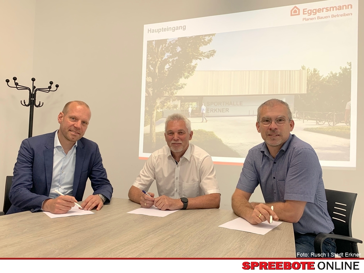 Für eine gute Schullandschaft braucht es auch gute Sporthallen. Für eine neue Dreifeldsporthalle an der Löcknitz-Grundschule hat die Stadtverordnetenversammlung in ihrer Sitzung am 22.Juli mit dem Beschluss zur Beauftragung den Weg frei gemacht. Vorausgegangen war ein sehr intensiver Vergabeprozess, in dem fünf Anbieter einen Bauentwurf eingereicht hatten. Das nach einer Optimierungsphase beste Konzept wurde von der Firma Fechtelkord und Eggersmann GmbH eingereicht. Am 11.September konnte nun von Henryk Pilz, Bürgermeister der Stadt Erkner, und dem Geschäftsführer der Fechtelkord und Eggersmann GmbH, Tim Schneider, im Rathaus der Bauvertrag unterzeichnet werden. Damit startet eine streng getaktete Planungsphase, um bereits Mitte Oktober den Bauantrag einreichen zu können. Durch eine sogenannte Teilbaugenehmigung soll erreicht werden, dass bereits Anfang Dezember mit den Erdarbeiten begonnen werden kann. Die Baufirma kann durch die sehr straff kalkulierte Bauzeit eine Fertigstellung und Inbetriebnahme zum Ende März 2027 gewährleisten. Die Dreifeldsporthalle wird auf dem Gelände des Hortes Koboldland errichtet und kann nach Schulschluss und in den Ferien auch von diesem und natürlich auch von Vereinen genutzt werden. Die Halle ist trotz ihrer Größe sehr gut in die Hanglage am Hort integriert und auch architektonisch ansprechend gestaltet. Sie wird die Sportmöglichkeiten für Kinder und Jugendliche in der Stadt Erkner deutlich verbessern.