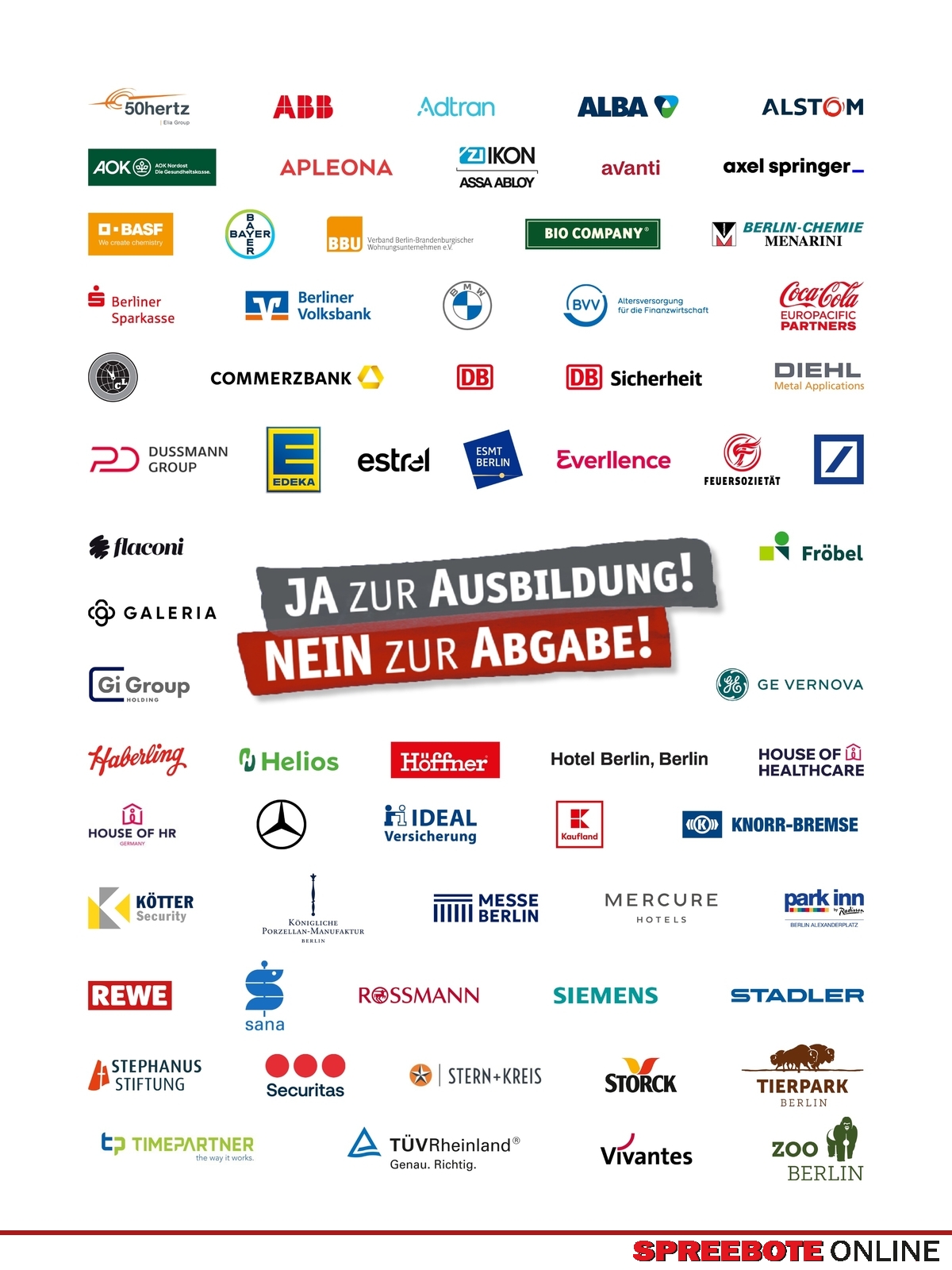 In einem gemeinsamen Appell rufen Berlins größte private Arbeitgeber Senat und Abgeordnete auf, die geplante Ausbildungsplatzabgabe nicht umzusetzen. Die Initiatoren warnen vor negativen Folgen der Abgabe für den Wirtschaftsstandort Berlin. Zu den Unterzeichnern gehören Handelsunternehmen wie Rewe, Edeka, Biocompany und Kaufland, aus der Industrie beteiligen sich die BASF, Siemens, Mercedes-Benz, BMW, Stadler, aus der Finanzbranche die Berliner Sparkasse, die Berliner Volksbank, die Deutsche Bank und die Commerzbank. Weitere Kritiker sind die Deutsche Bahn, Coca-Cola, der Entsorgungskonzern Alba, die Messe Berlin, die AOK Nordost, Helios, die Vivantes-Kliniken und die Dussmann Group.