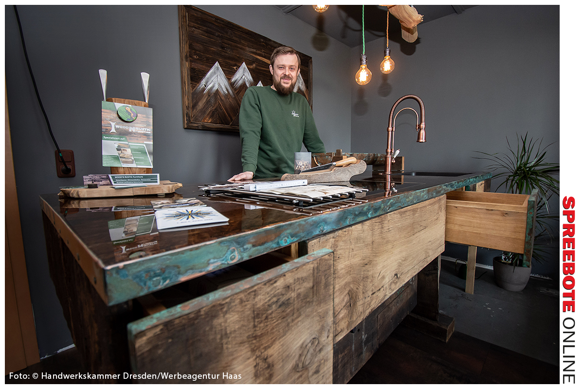 Tischler Steven Kraftschenko fertigt aus betagten Balken und Dielen rustikale Einbauten und Möbelstücke. Mit der Wiederverwertung von Altholz betreibt Steven Kraftschenko konsequent nachhaltiges Handwerk. Im Treppenhaus zwischen Werkstatt und Büro seines Unternehmens Wood’n Rustic Furniture in Nentmannsdorf wird schnell klar, dass darin auch ein kunsthandwerklicher Anspruch steckt. Denn die rustikale Küchenzeile, die hier ihren vorläufigen Platz gefunden hat, zeugt von ästhetischem Charme: Gefertigt wurde sie aus alten Eichendielen, auf denen früher Getreide gedroschen wurde. Der Materialmix mit Metallbeschlägen und Epoxidharzarbeitsfläche sowie kreative Details wie eine Regenrinne als Abstellfläche für Küchenkräuter zeigen, welches Potential in der Nutzung von Altholz steckt. Die Leidenschaft für rustikalen Möbelbau hat Steven Kraftschenko aus Spanien mitgebracht. Zehn Jahre arbeitete er in der Tischlerei Can Castello auf Ibiza. „Die Nutzung von Altholz ist in Spanien sehr verbreitet. Dort steht die echte Handarbeit auch noch sehr viel mehr im Vordergrund als bei uns“, erklärt der 36-Jährige. 2015 zog es ihn zurück nach Deutschland, 2017 eröffnete er seine Werkstatt. In jedem Projekt, das hier entsteht, steckt hoher Aufwand – angefangen beim Reinigen des Holzes und dem Entfernen zahlreicher Nägel. Dann sind Kreativität und handwerkliches Geschick gefragt: Was harmoniert miteinander? Was lässt sich herausholen? „Man muss sich da rein vertiefen, quasi ein Puzzle zusammensetzen und das ‚krumme‘ Holz in ein neues Licht rücken“, erzählt der Tischler.
