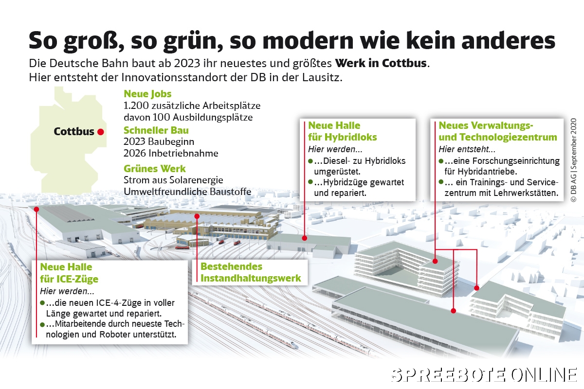 | Die Braunkohle geht – die Bahn kommt: Cottbus bekommt das modernste und umweltfreundlichste Bahninstandhaltungswerk in Europa. Bis zum Jahr 2026 werden 1.200 neue und hochwertige Industriearbeitsplätze entstehen. Darunter sind 100 Auszubildende, die unter besten Bedingungen ins Berufsleben starten können. Das Werk ist das erste große Vorhaben, das auf Basis des Strukturstärkungsgesetzes des Bundes finanziert wird. Mit dem Strukturstärkungsgesetz unterstützen Bund und Länder die vom Kohleausstieg betroffenen Regionen in Brandenburg, im Freistaat Sachsen, in Sachsen-Anhalt und in Nordrhein-Westfalen beim Aufbau zukunftsfähiger Arbeitsplätze und neuer Wirtschaftsstrukturen. Zweite wichtige Säule des Bahn-Engagements in der Lausitz ist der Ausbau der Schieneninfrastruktur.